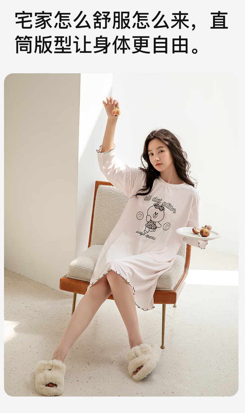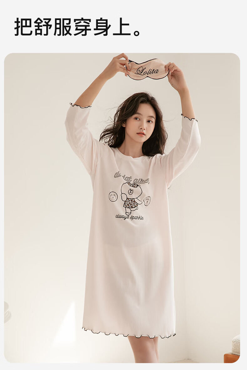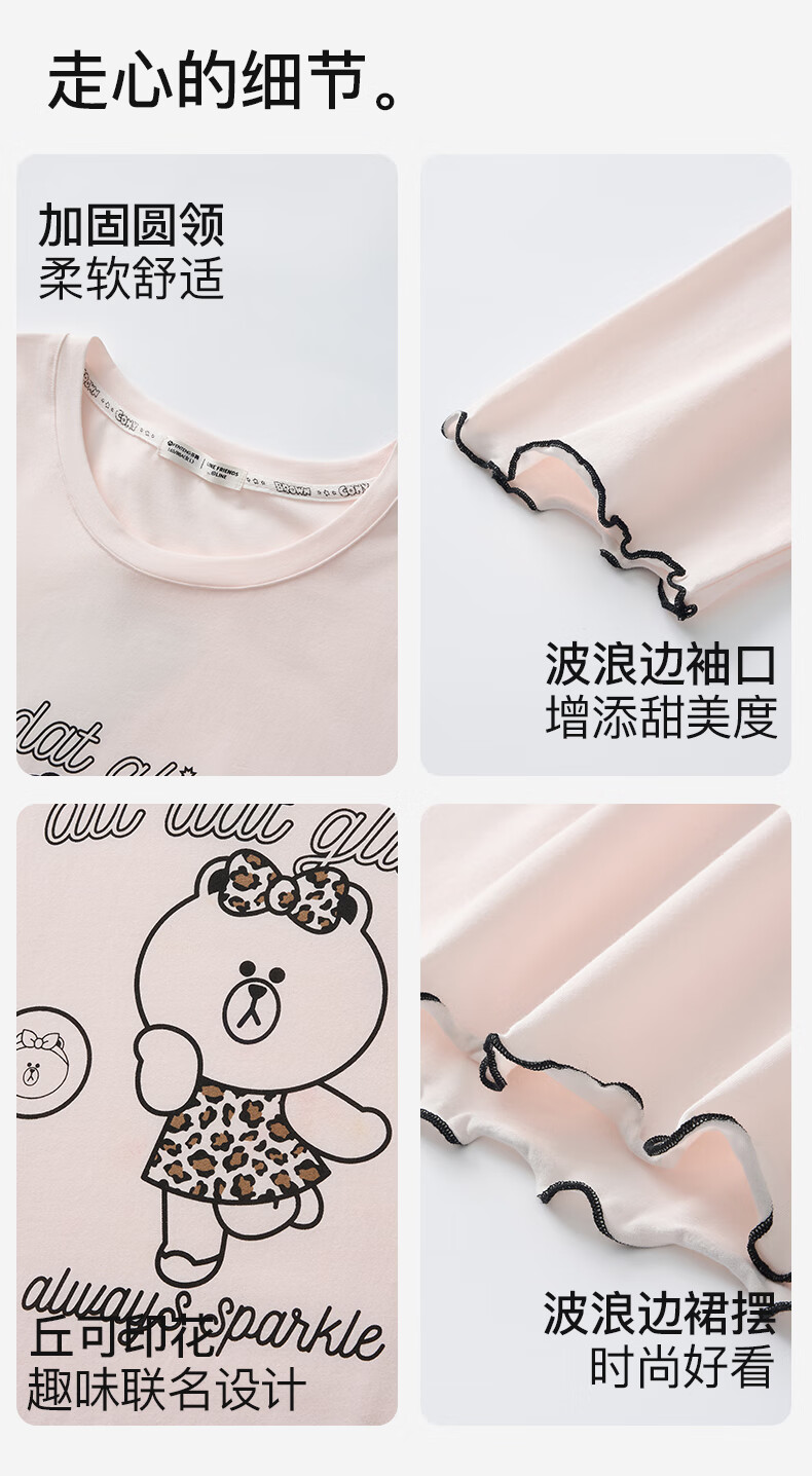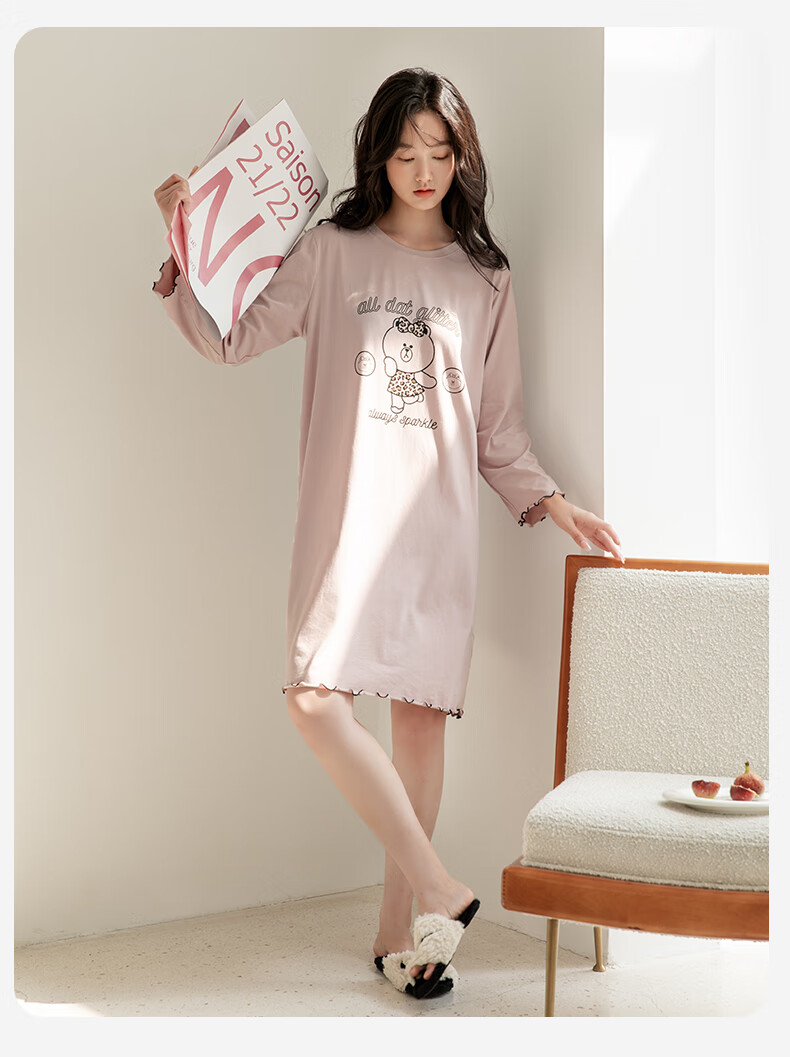 芬腾睡裙女云朵棉秋冬新款布朗熊IP联名亲肤圆领长袖睡裙连衣裙 浅粉 2XL
