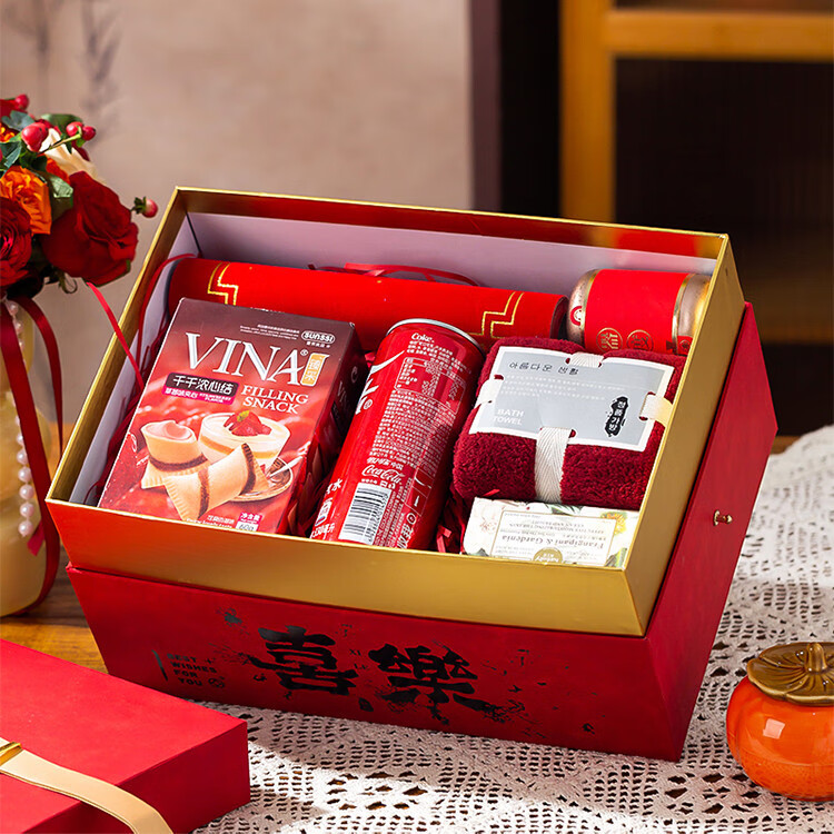 咏幻红色礼盒空盒大容量新婚伴手礼品盒餐具包装盒乔迁结婚大号礼物盒 中号红色喜乐天地盖30.5x21.5x16cm