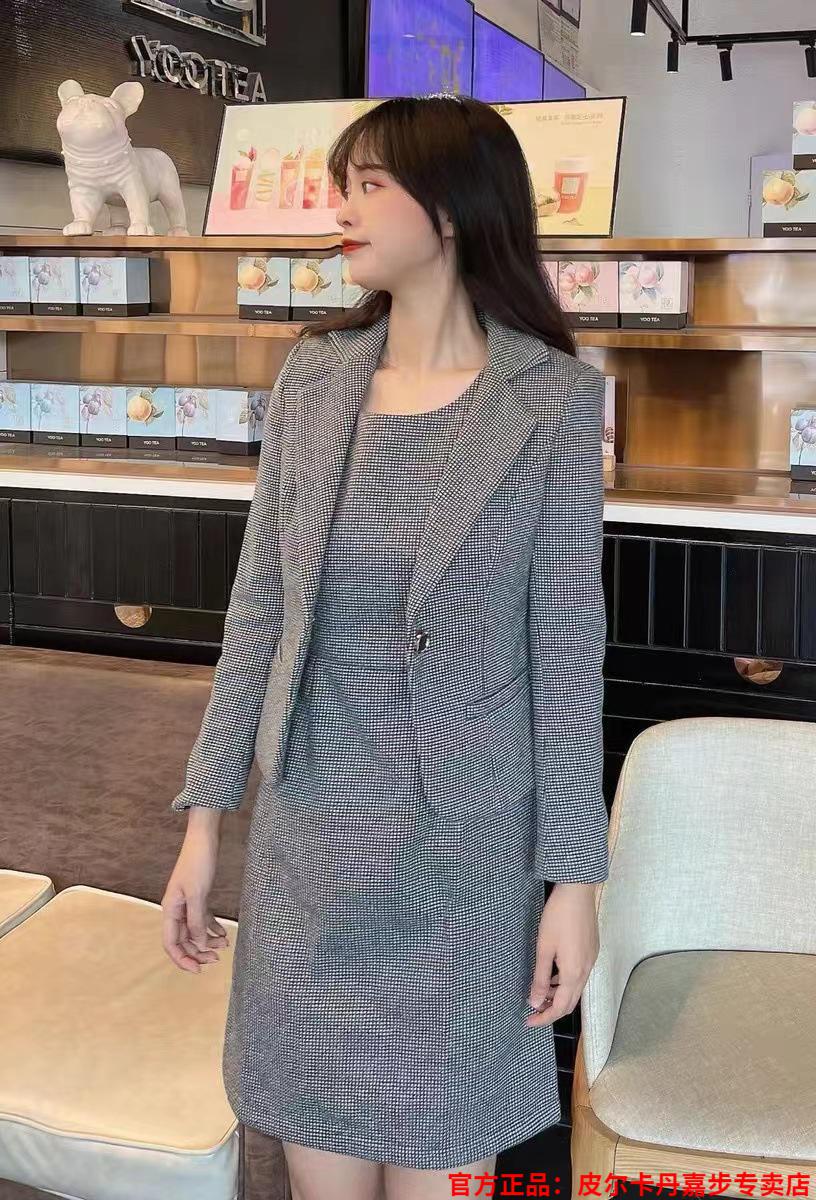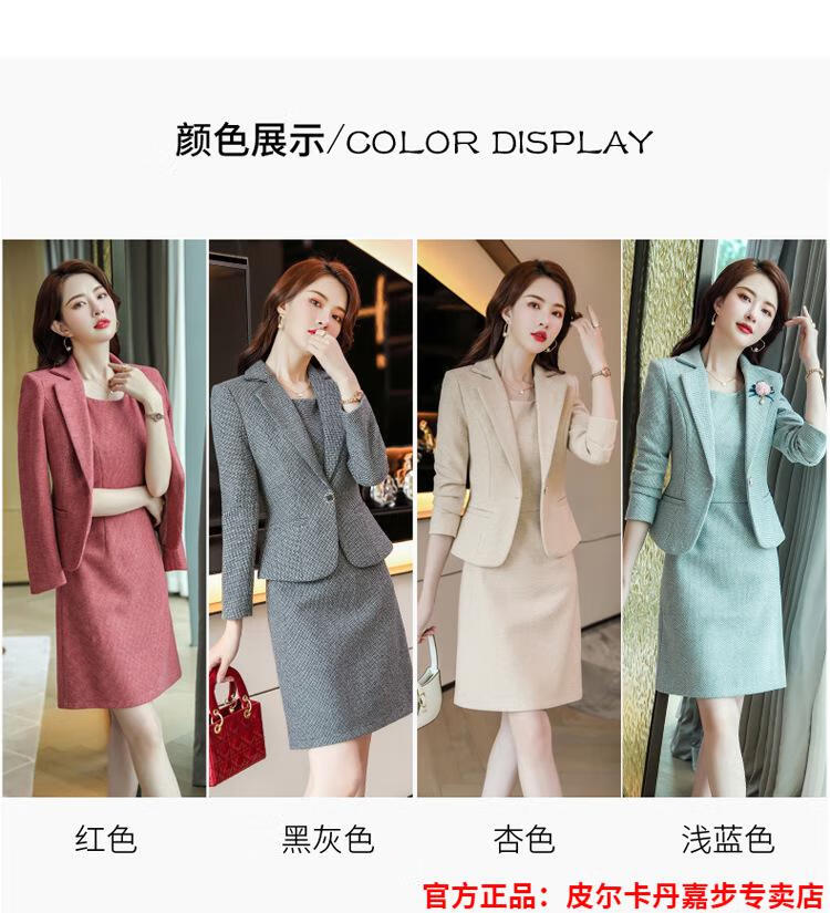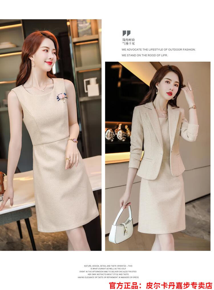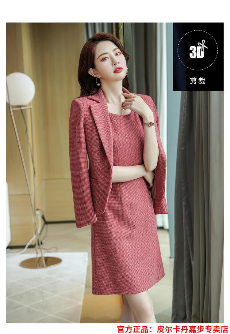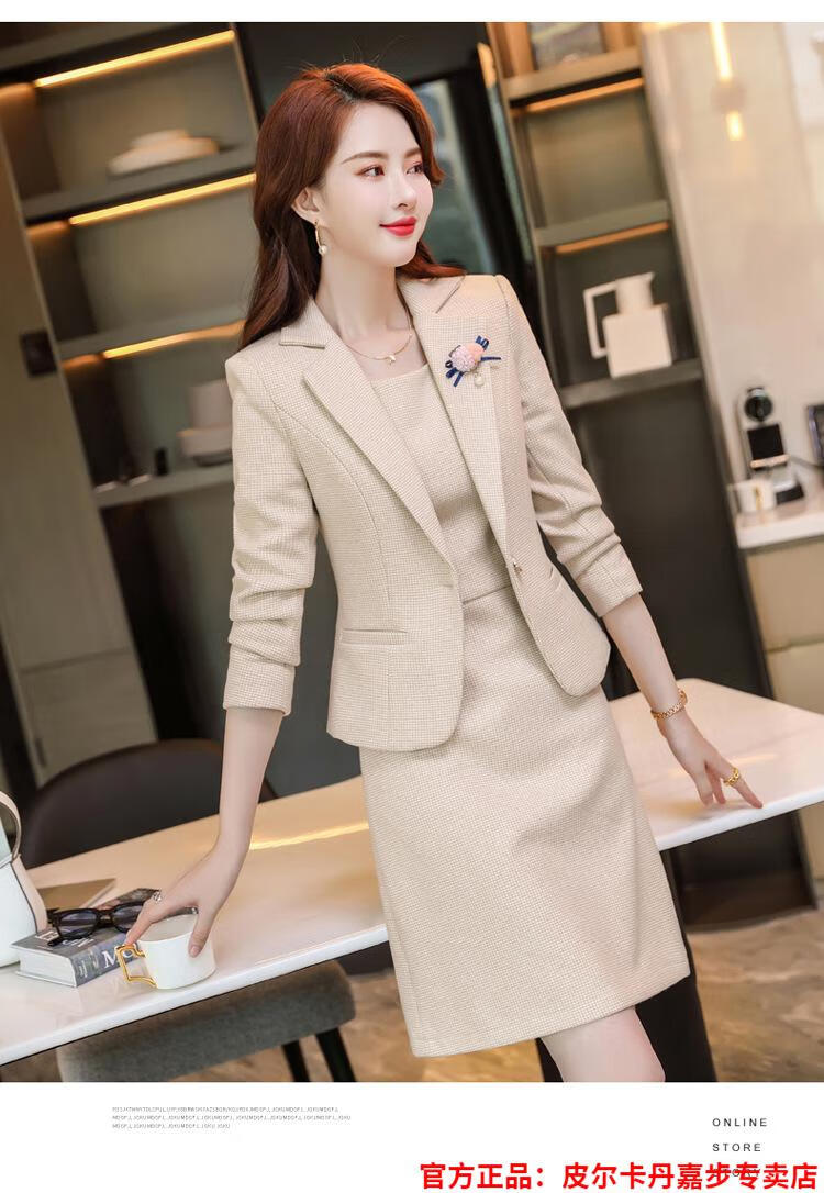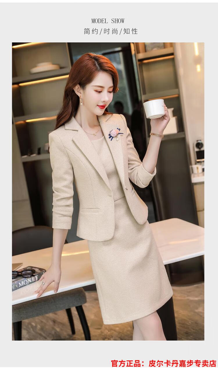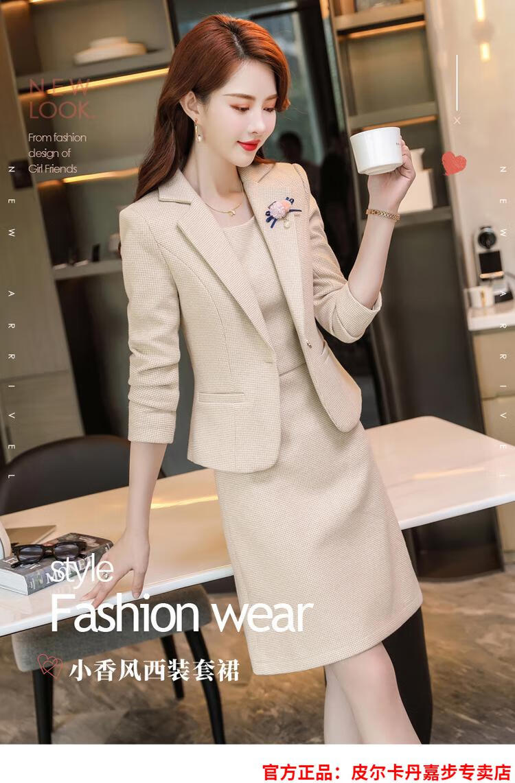 皮尔卡丹格子小西装外套女秋短款2025秋季新款职业装连衣裙春秋西服裙套装 杏西装+杏连衣裙 S 【90斤以内】