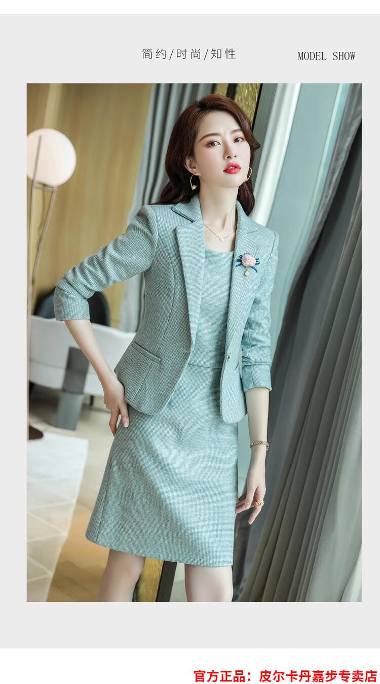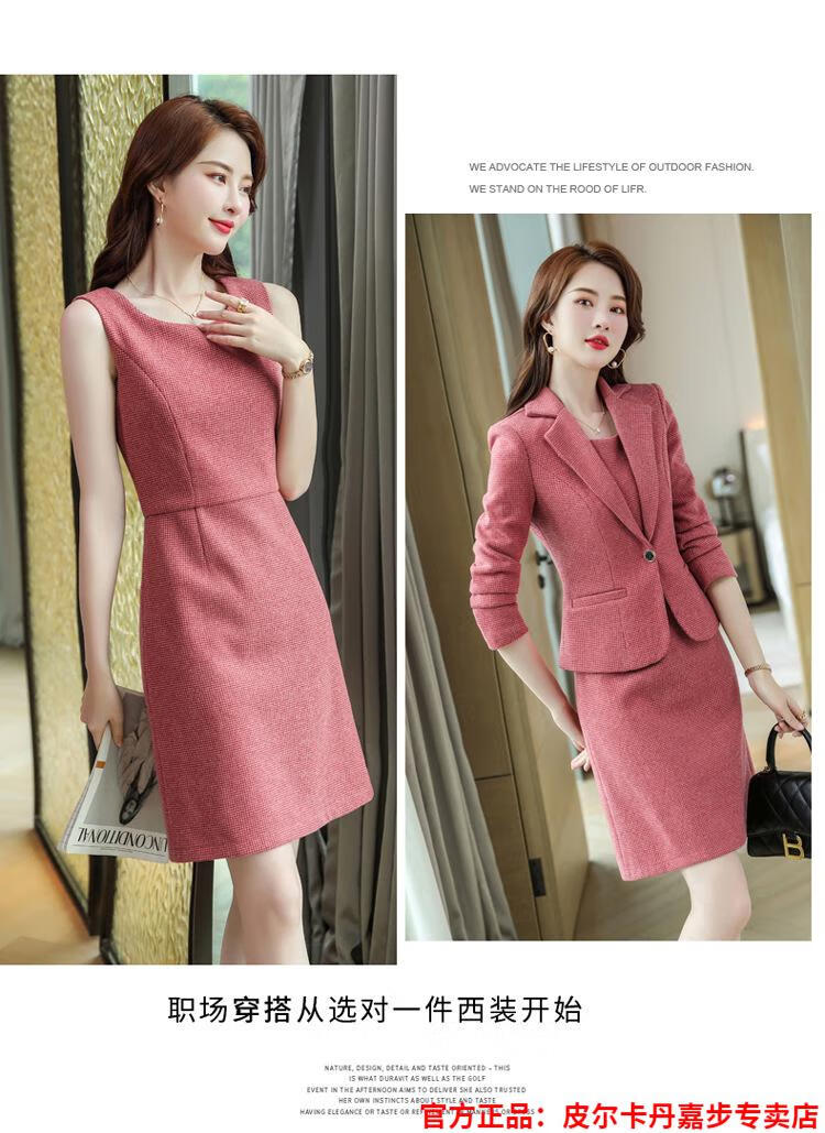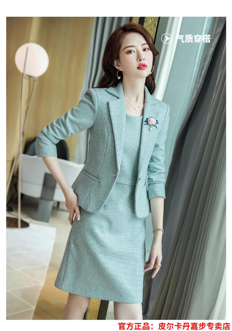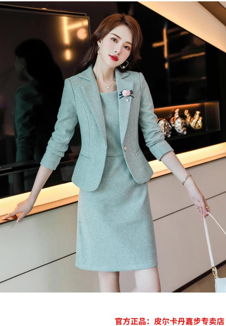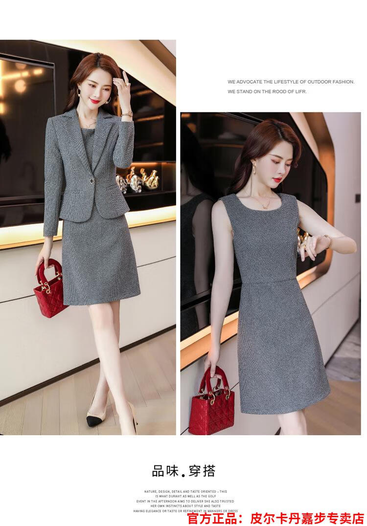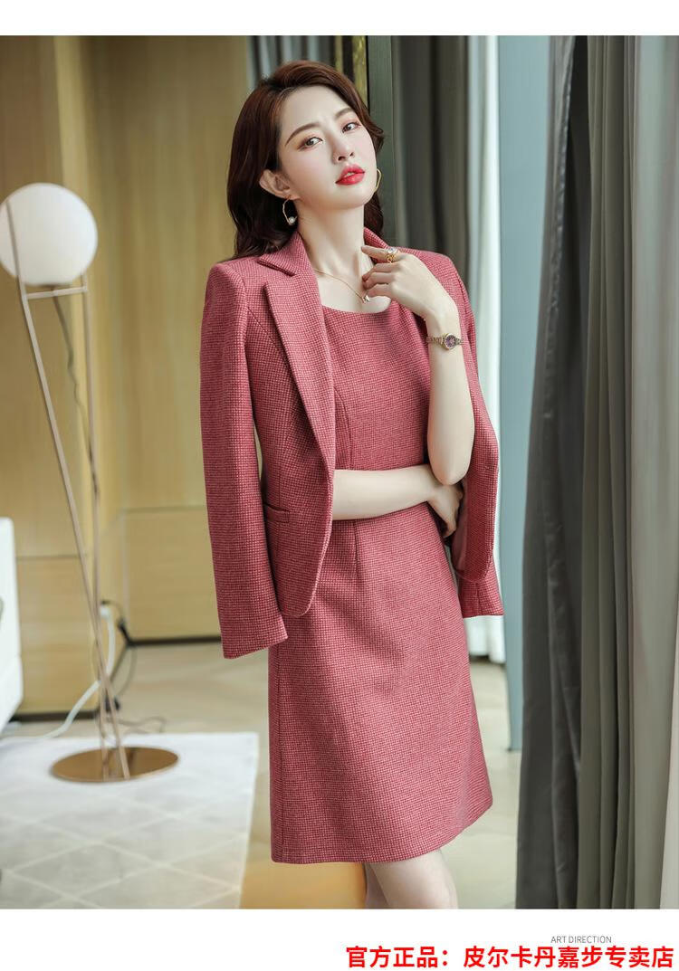 皮尔卡丹格子小西装外套女秋短款2025秋季新款职业装连衣裙春秋西服裙套装 杏西装+杏连衣裙 S 【90斤以内】