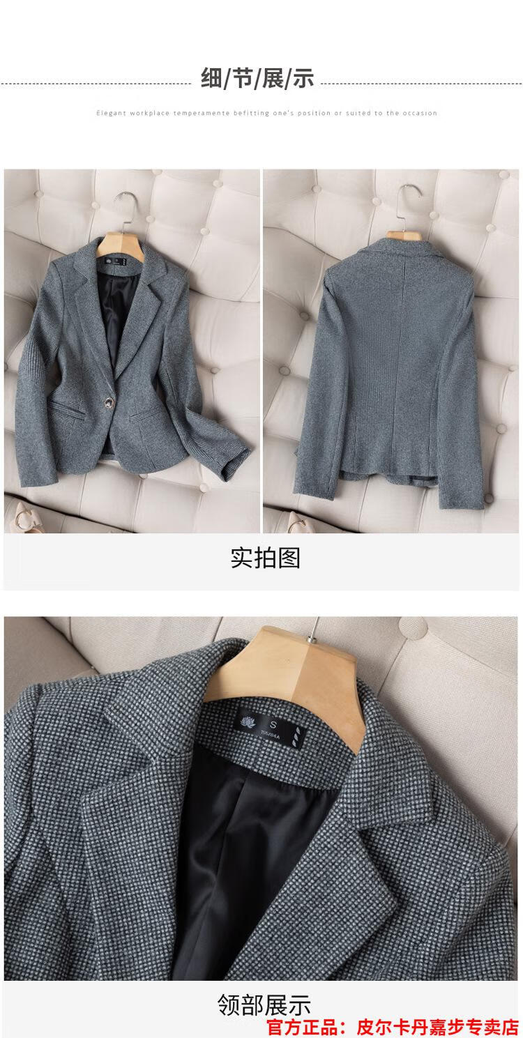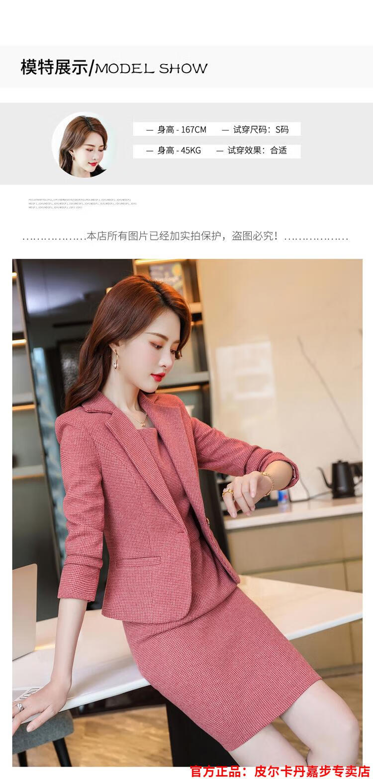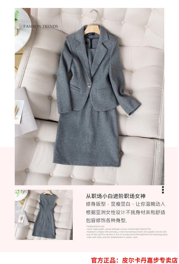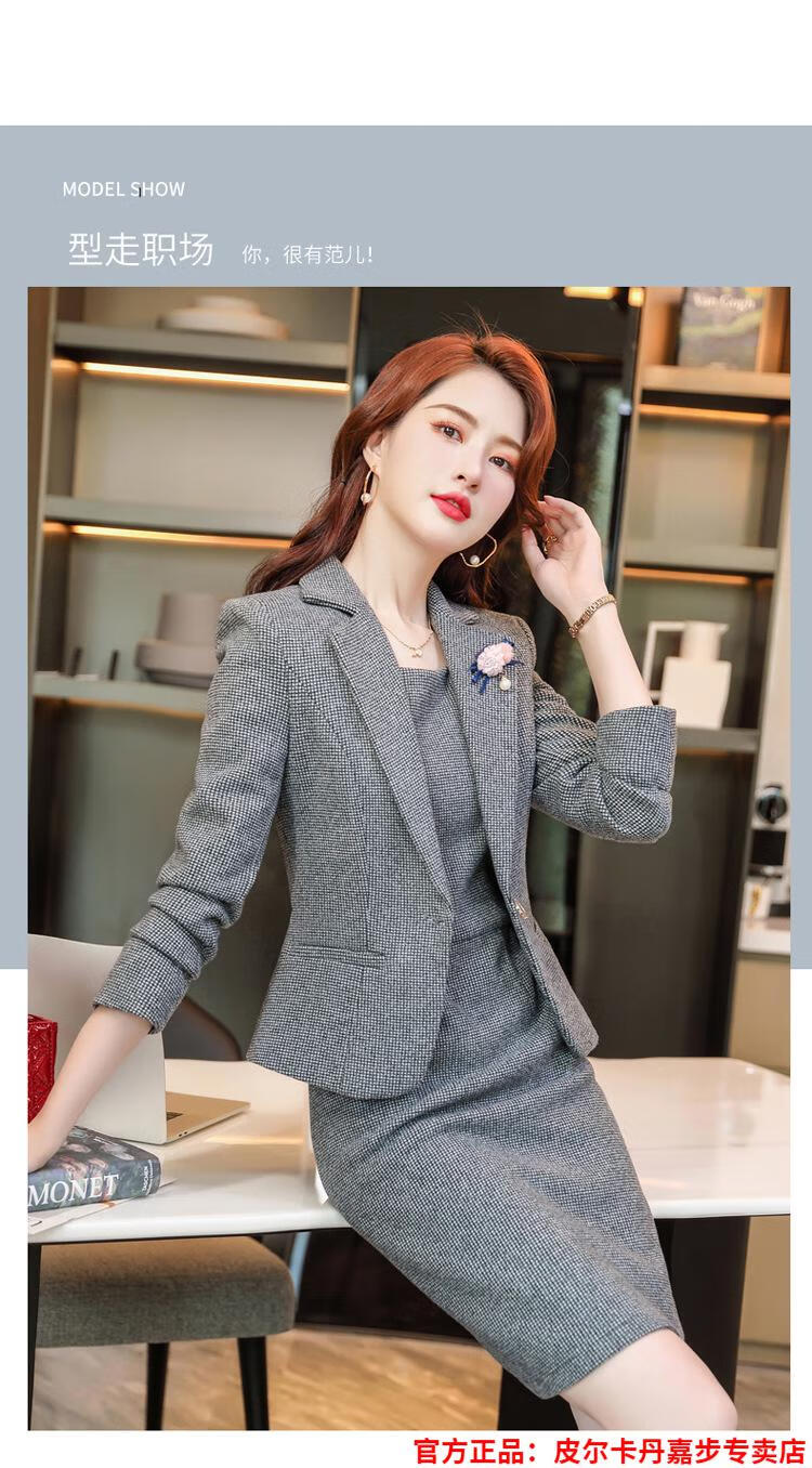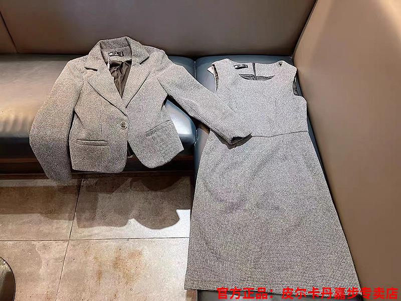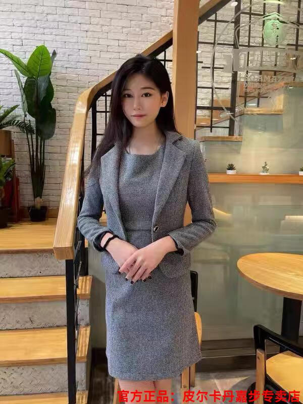 皮尔卡丹格子小西装外套女秋短款2025秋季新款职业装连衣裙春秋西服裙套装 杏西装+杏连衣裙 S 【90斤以内】