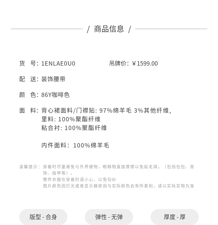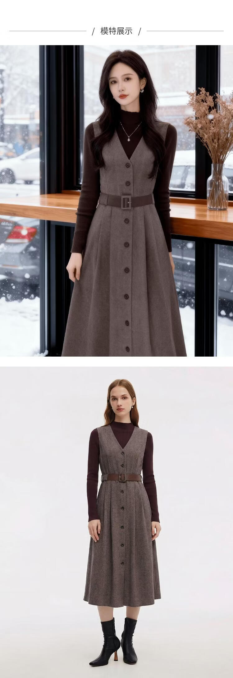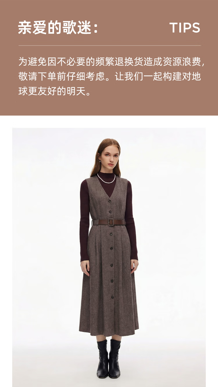 歌莉娅 冬季新品 人字纹可水洗羊毛毛衣+背心连衣裙+腰带 1ENLAE0U0 86Y咖啡色 S