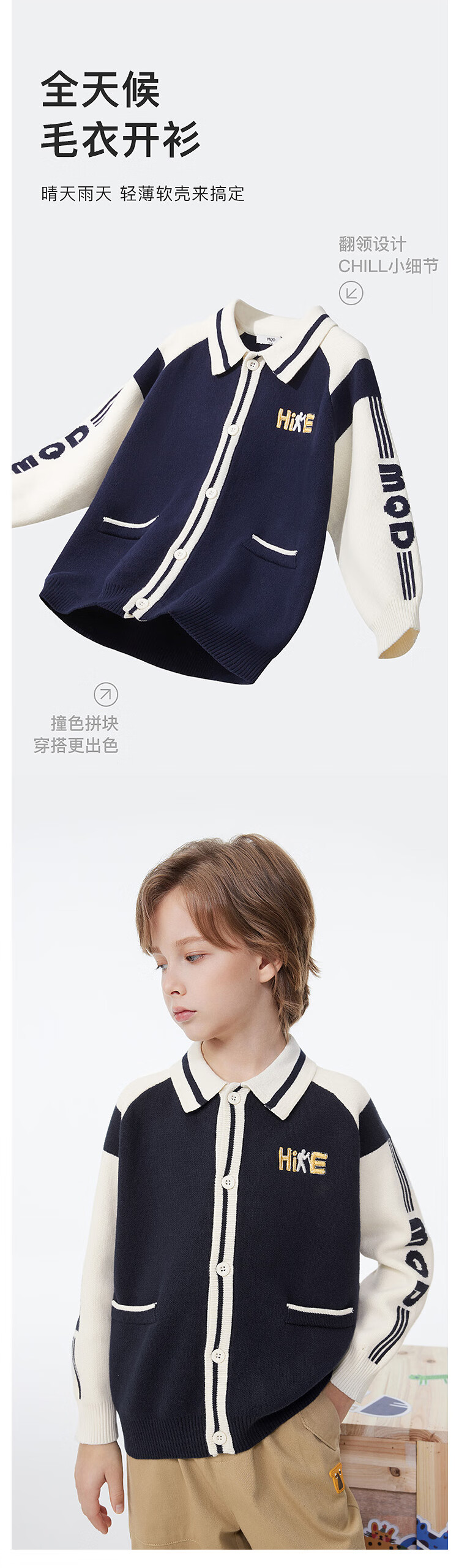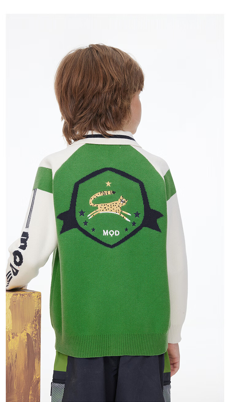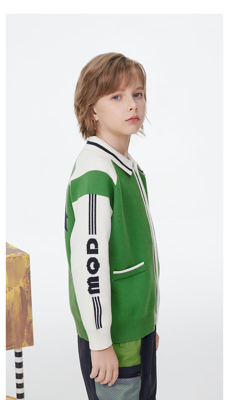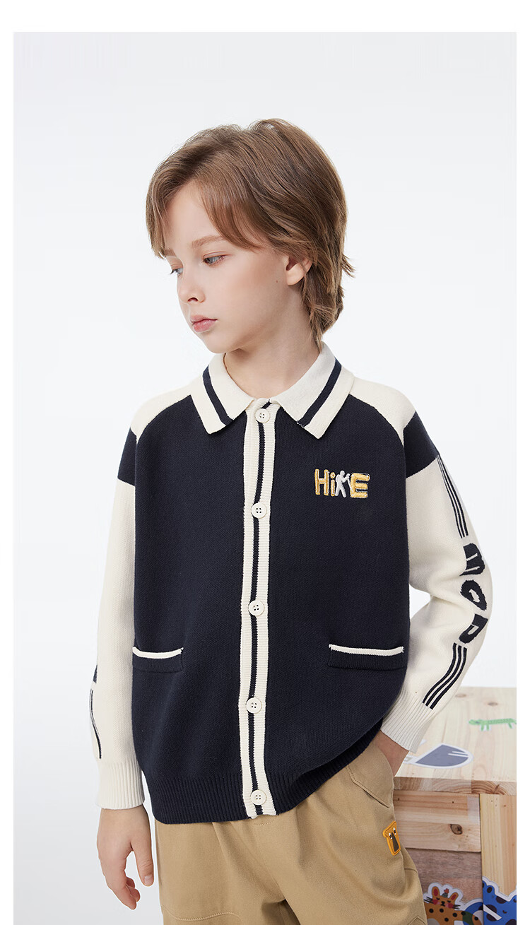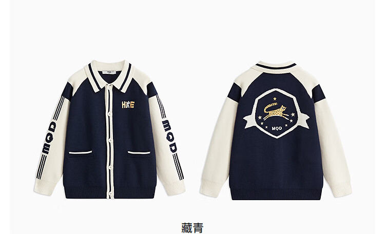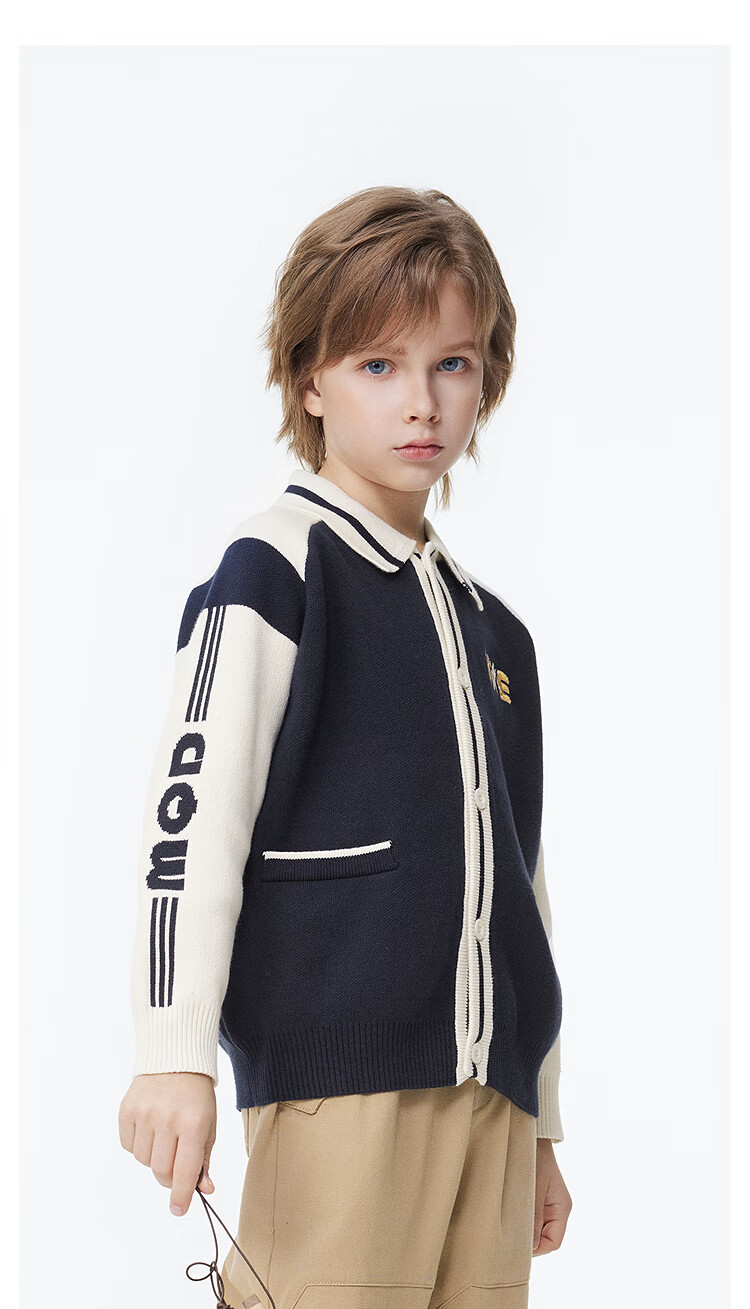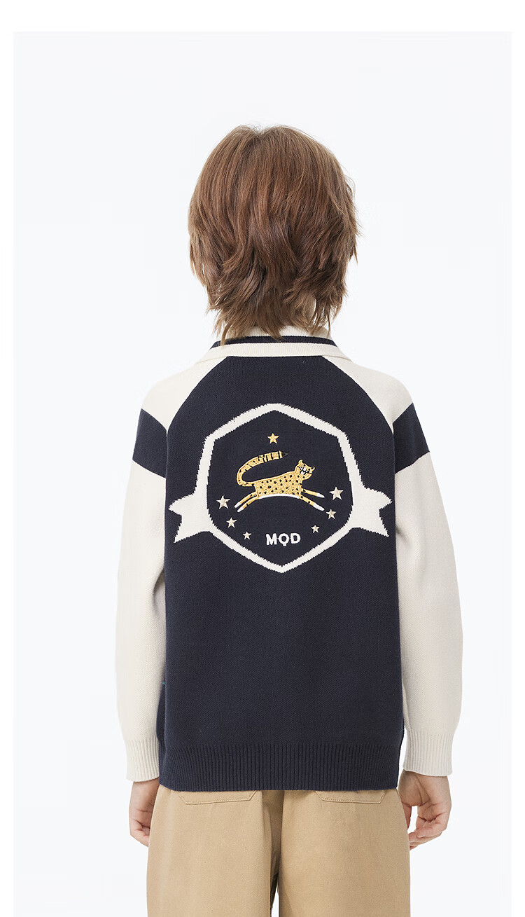 MQD童装男童开衫毛衣2024撞色翻领学院风复古儿童针织外套潮 藏青 160