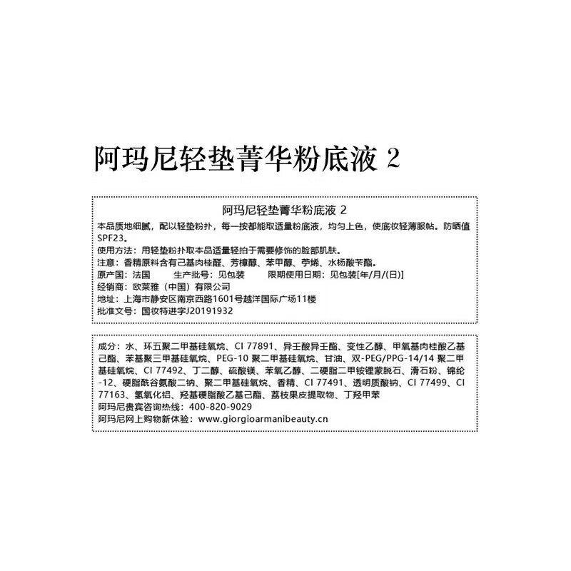 阿玛尼(ARMANI)轻垫菁华粉底液#2 1.7g 迷你红气垫【临期清仓】