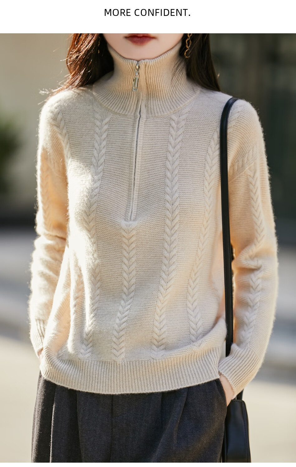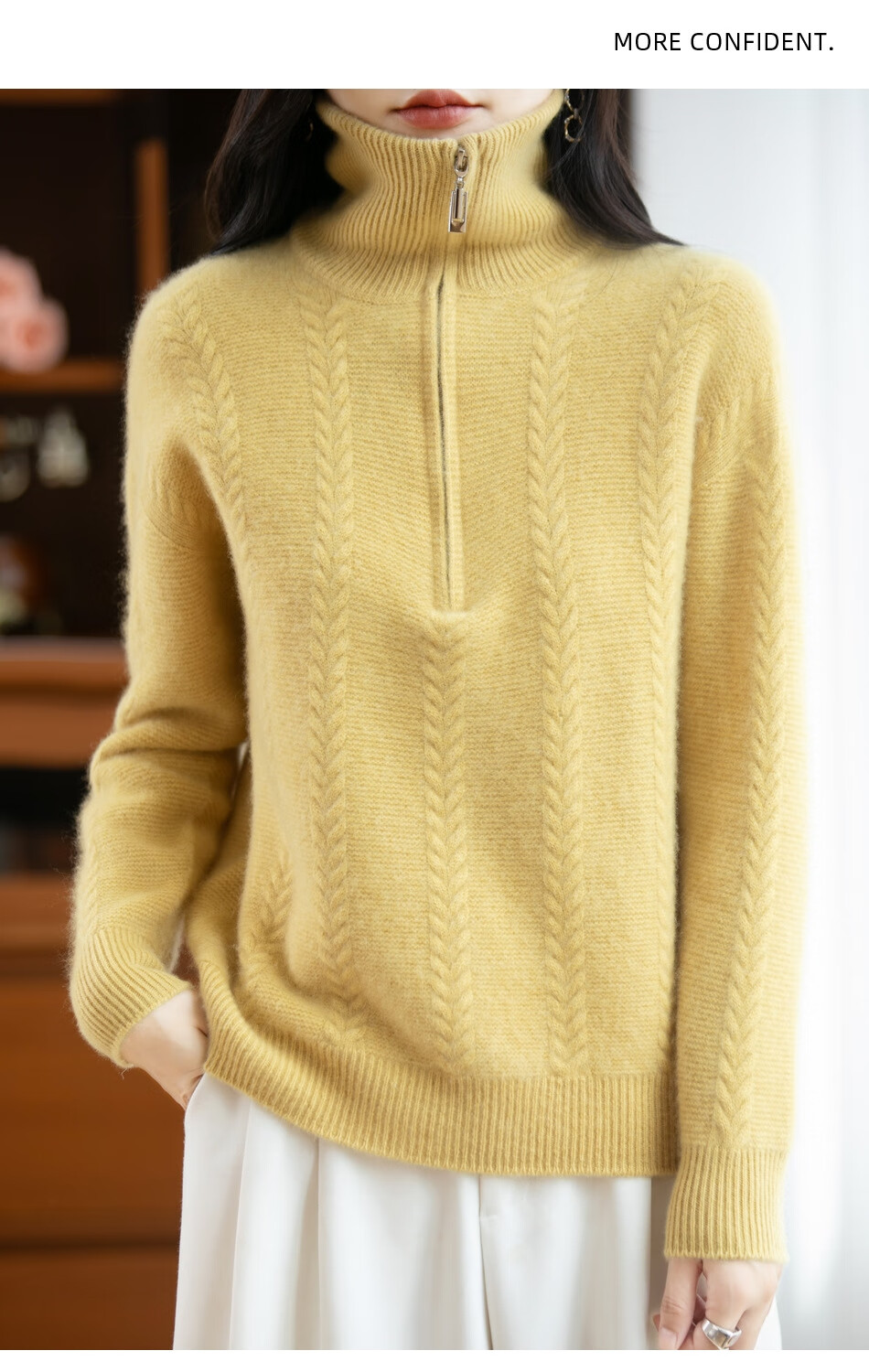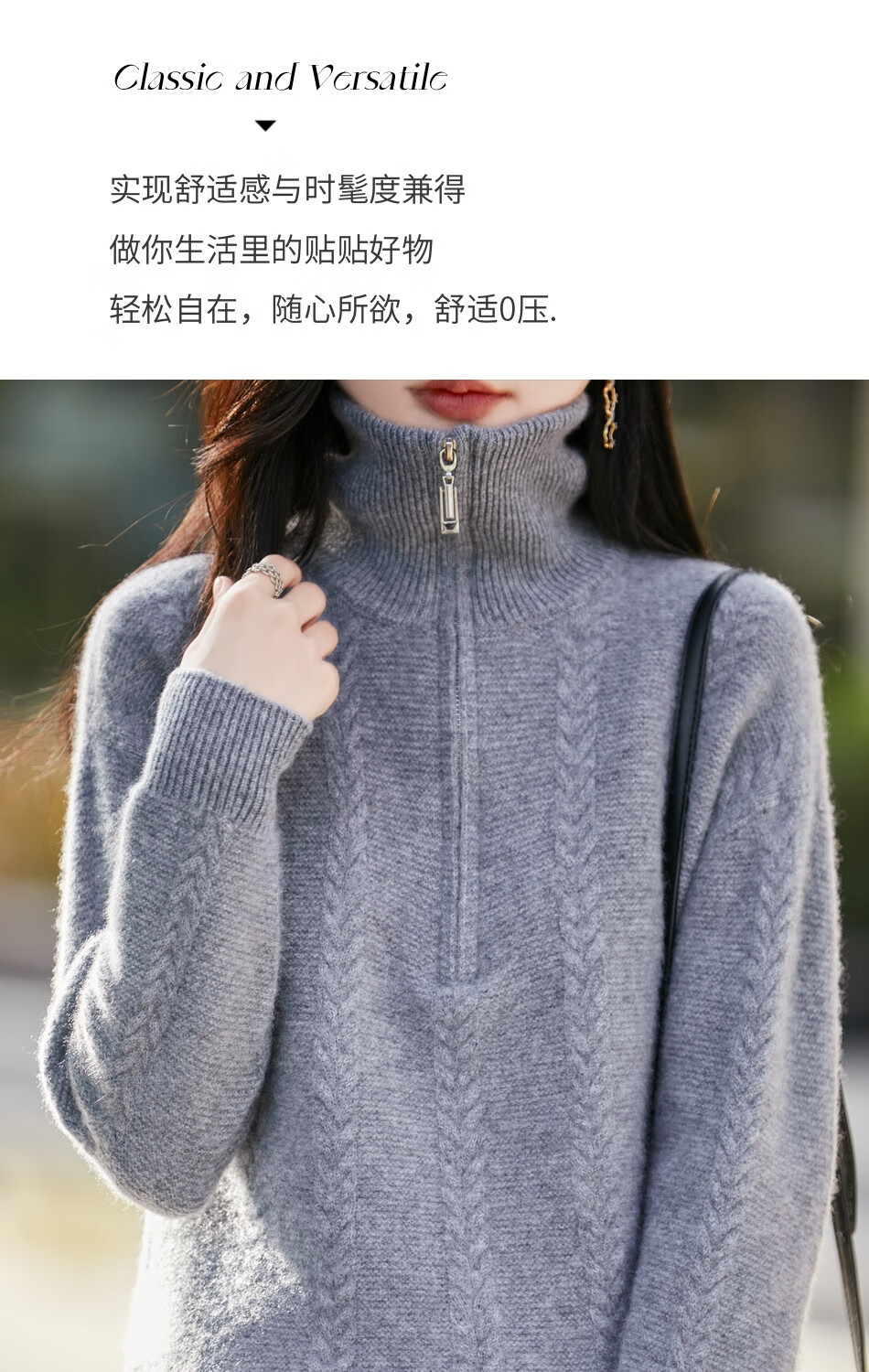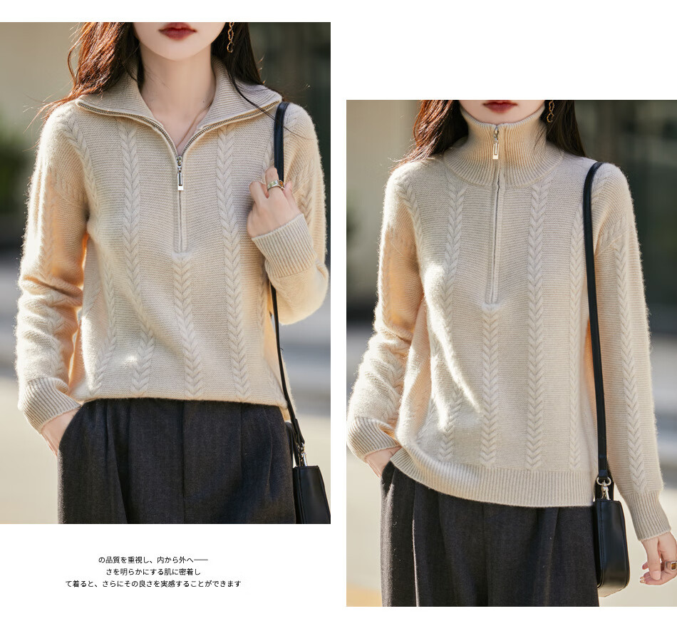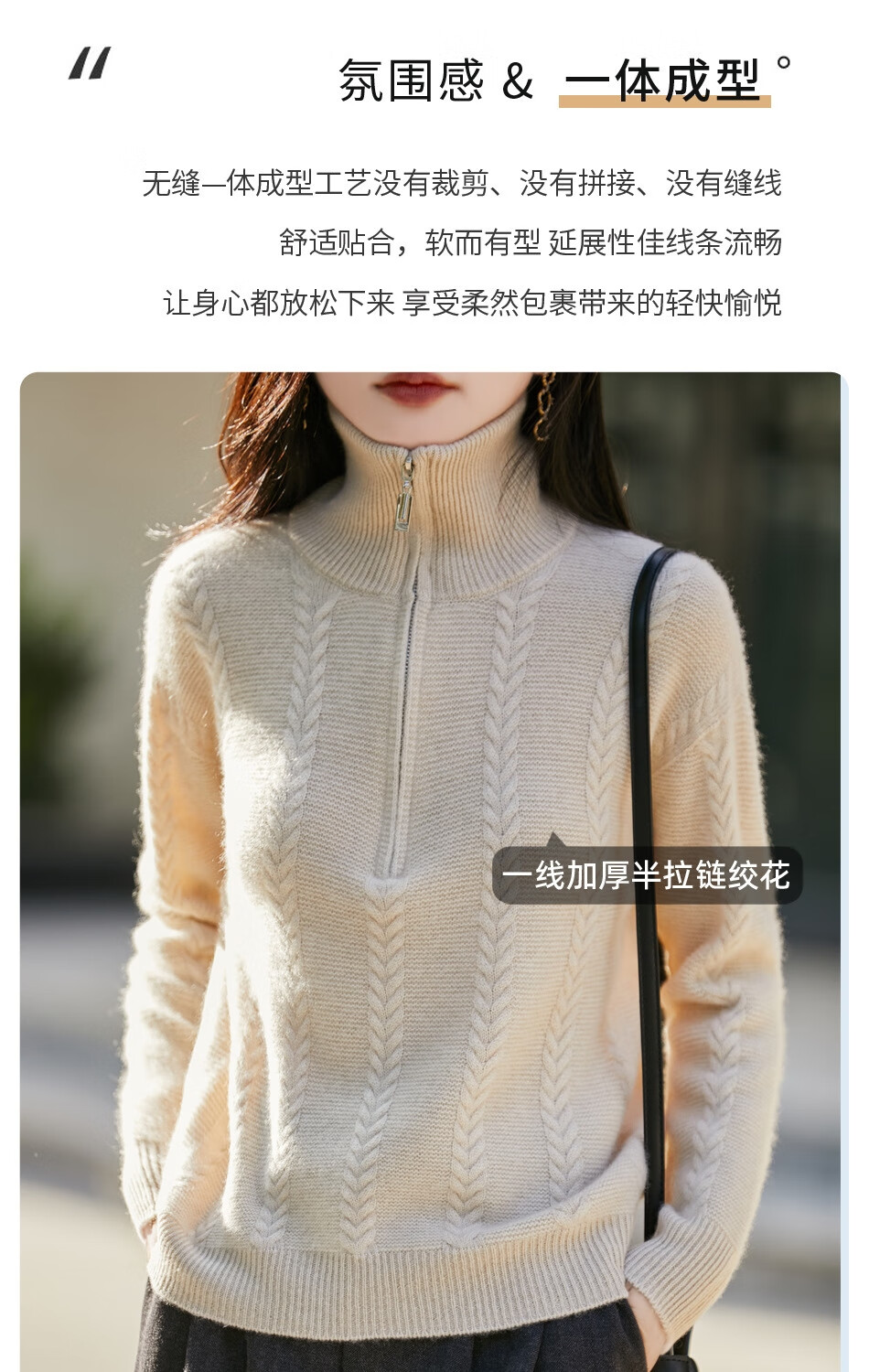 2025七针加厚纯羊毛衫女式高翻领毛衣秋冬新款宽松慵懒风提花内搭 浅米 L