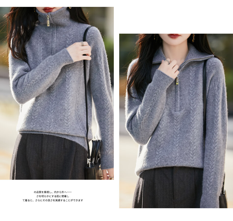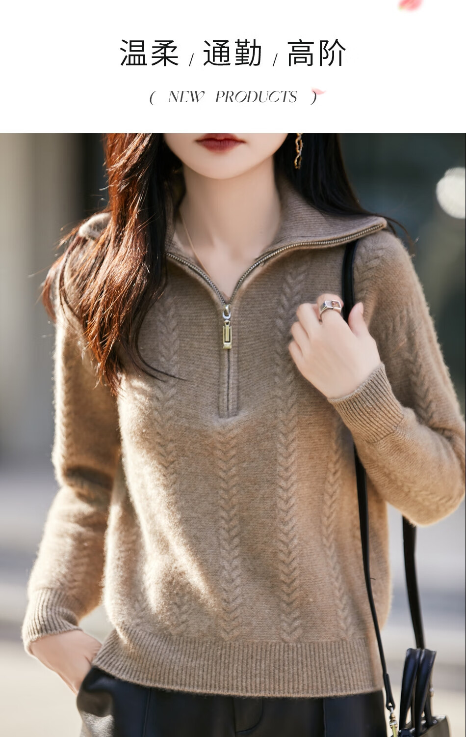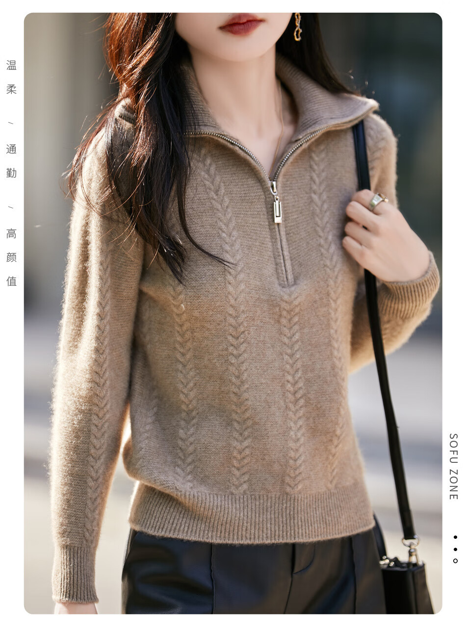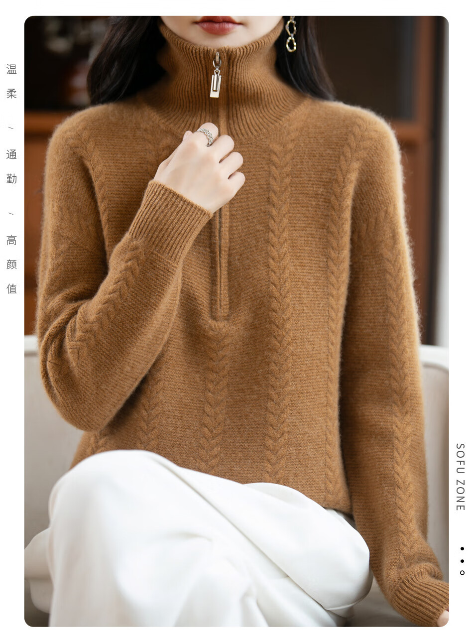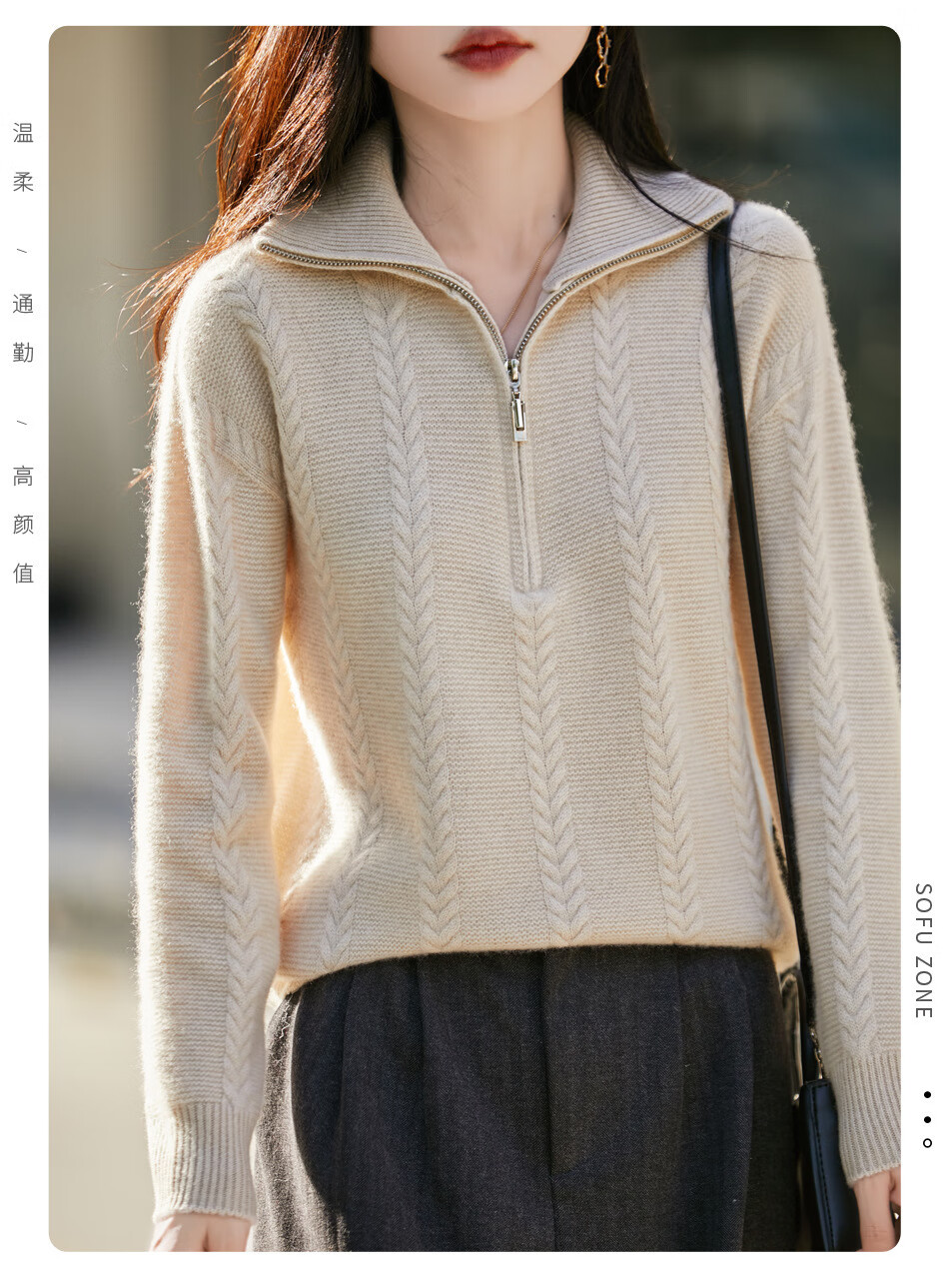 2025七针加厚纯羊毛衫女式高翻领毛衣秋冬新款宽松慵懒风提花内搭 浅米 L