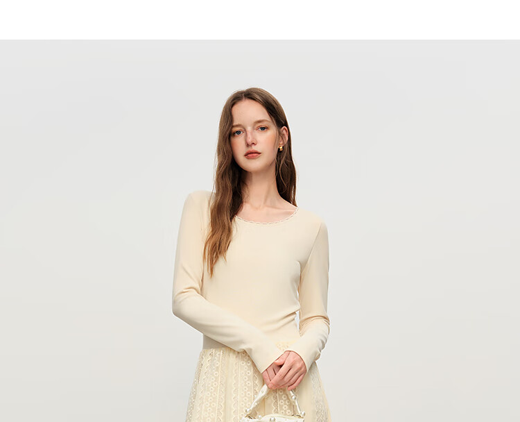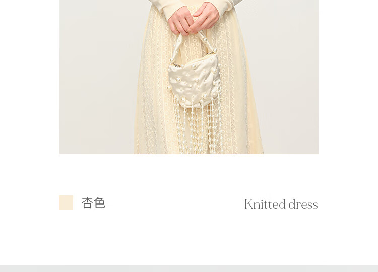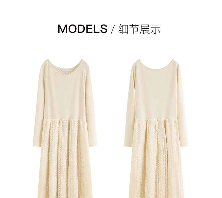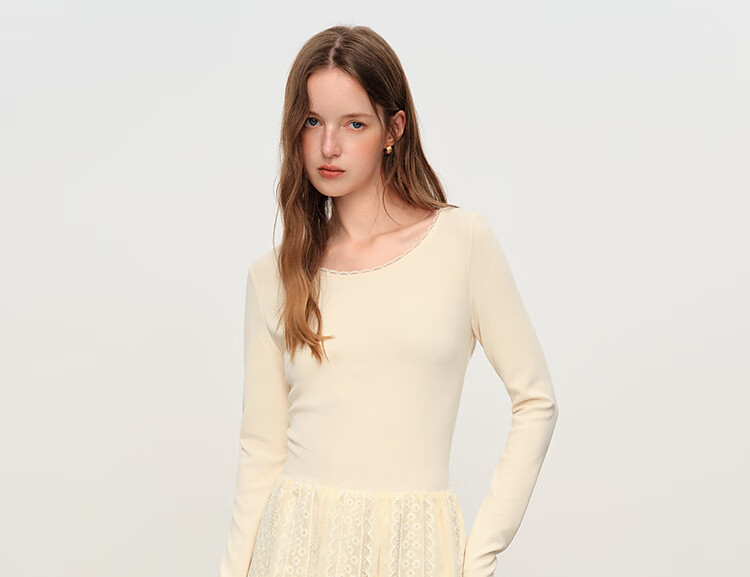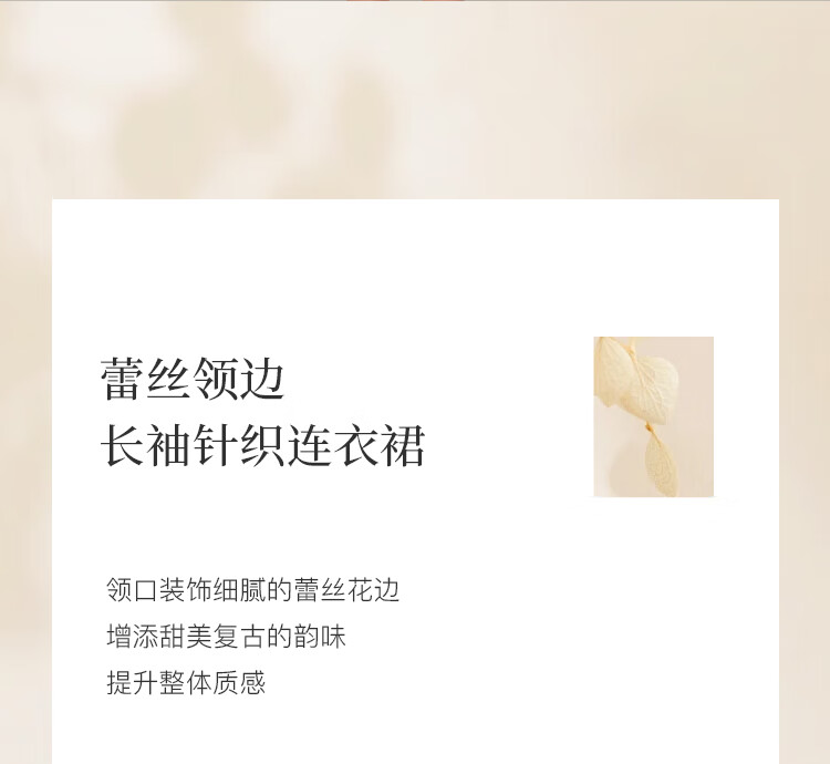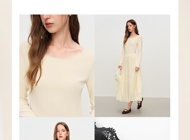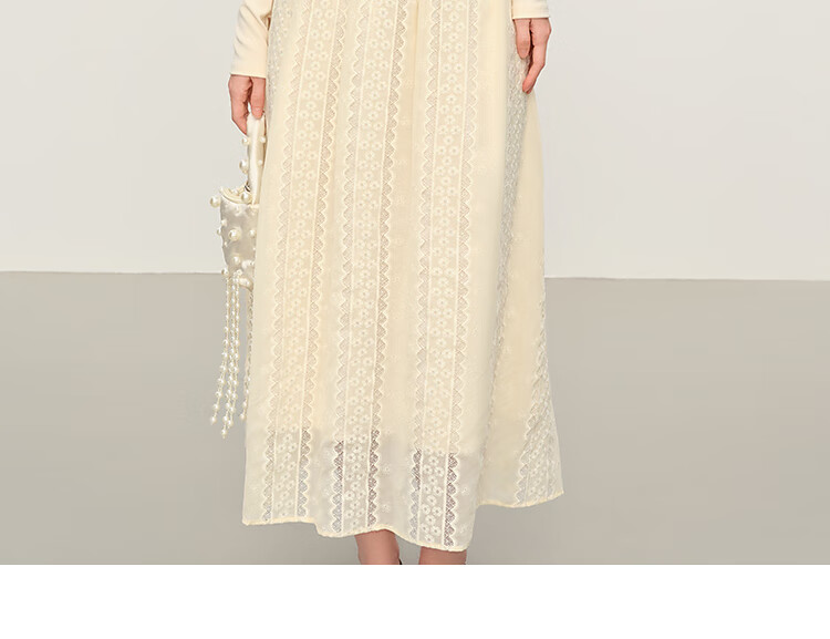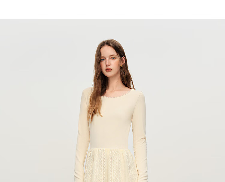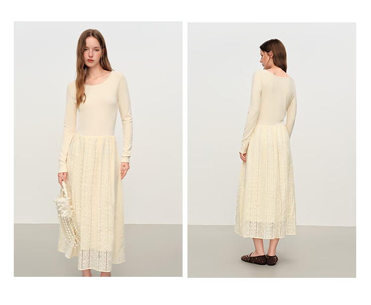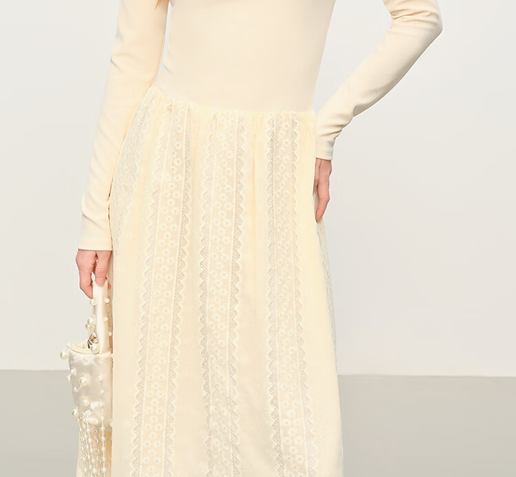 范思蓝恩法式圆领蕾丝花边长袖针织连衣裙女冬季2025新款内搭4355 杏色 L