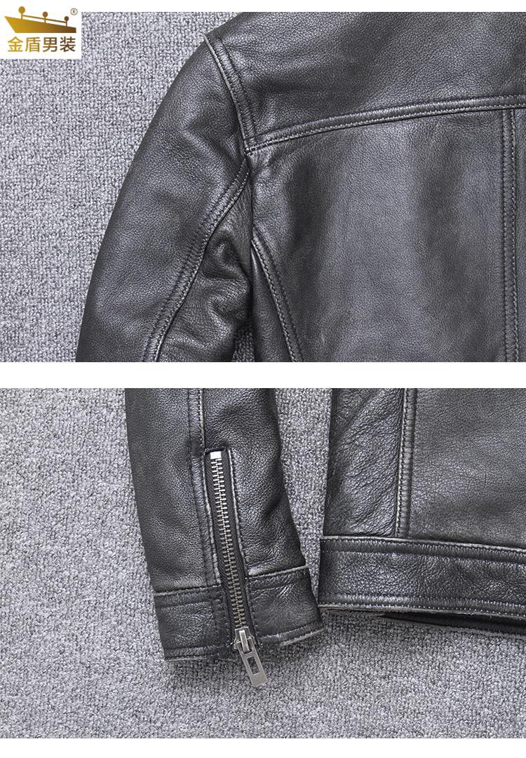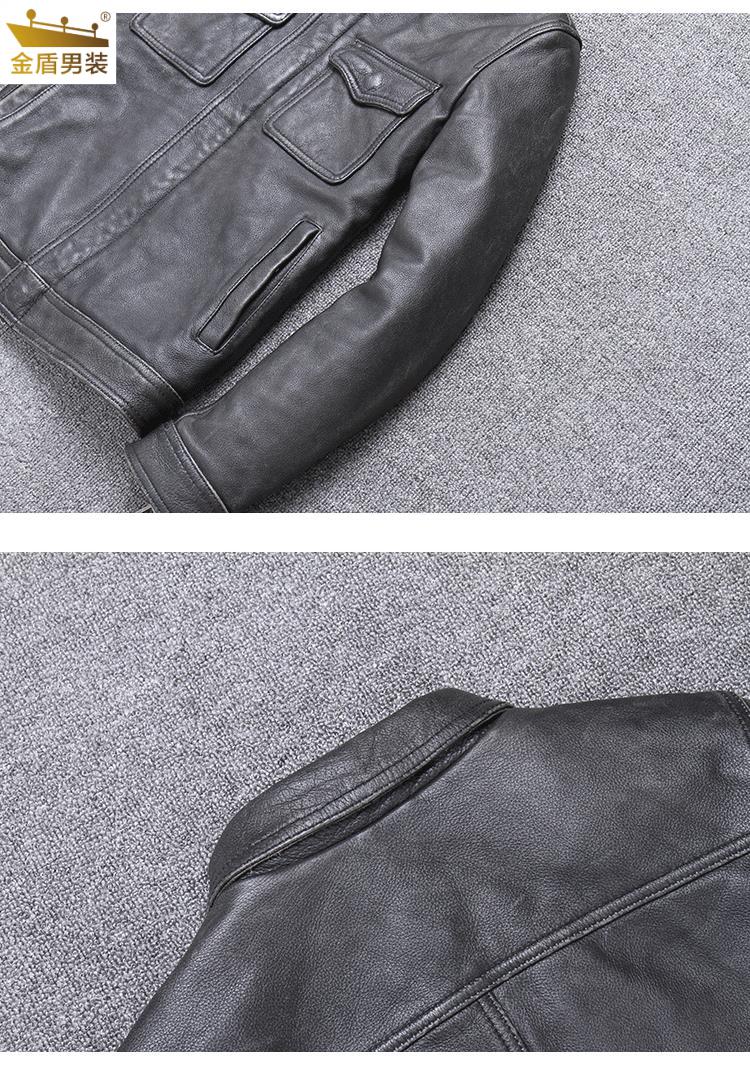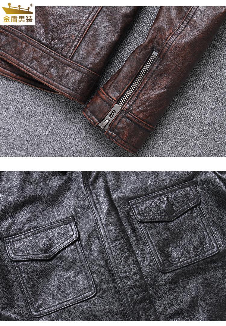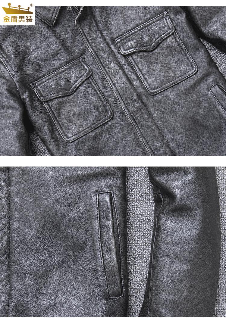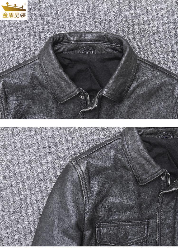 金盾特价捡漏真好皮皮衣男翻领短款牛皮纹复古做旧机车夹克秋冬款外套 厚款 咔叽皮衣-黑色 加棉 XL 体重130-150斤