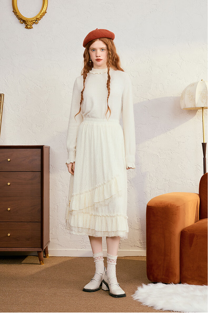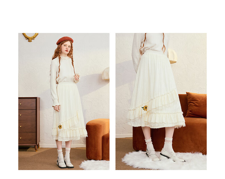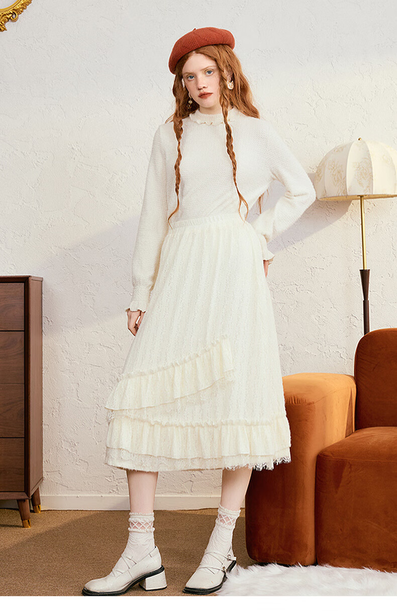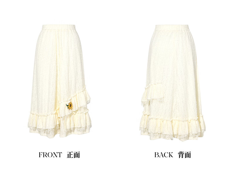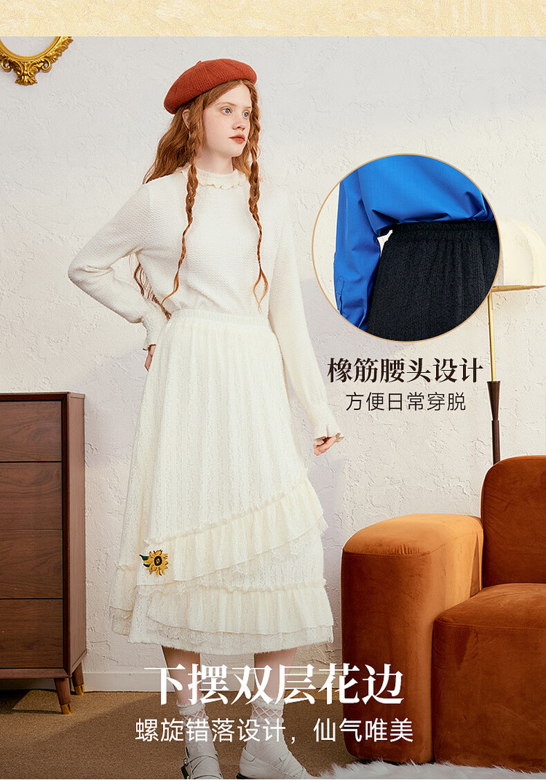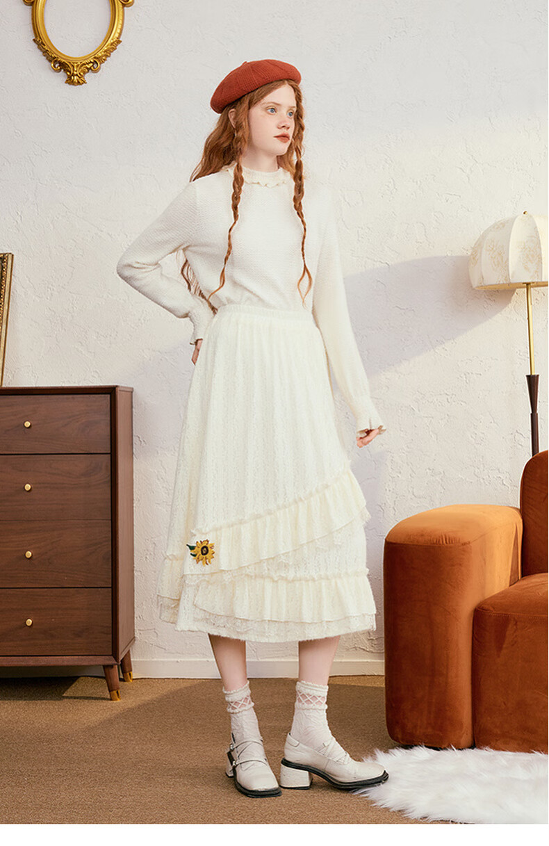 两三事梵高白色半身裙新款绝美秋装女款裙子蕾丝蛋糕半裙蓝鸢仙葵 杏色 M