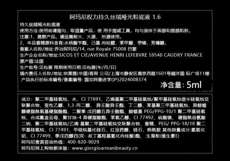 阿玛尼全新升级权力PRO粉底液1.6 遮瑕持妆轻薄5ml【临期清仓】