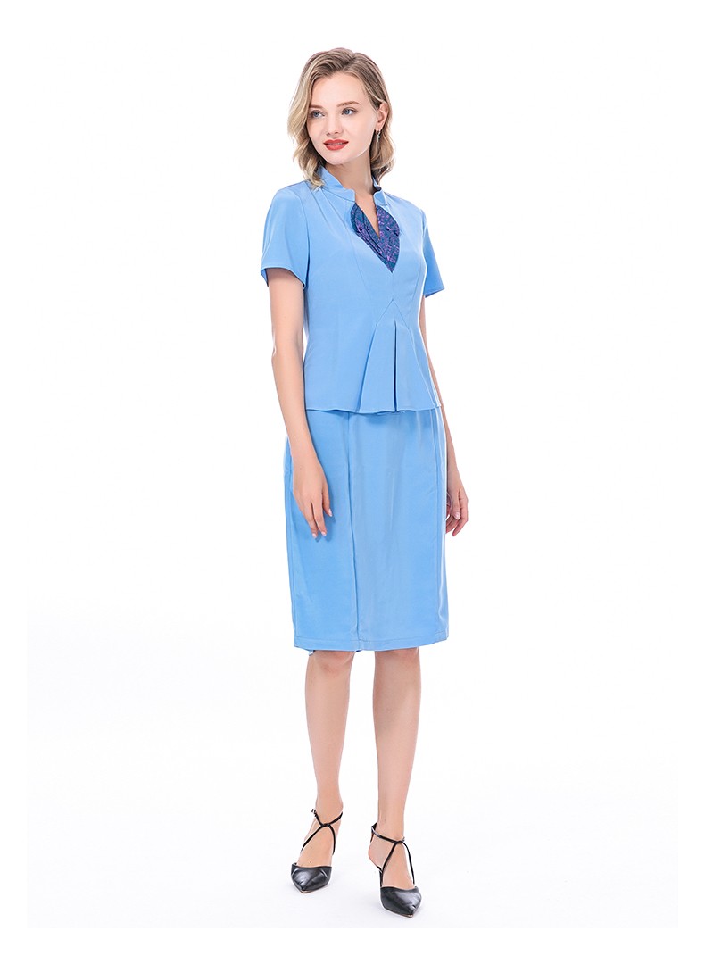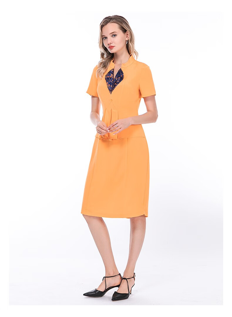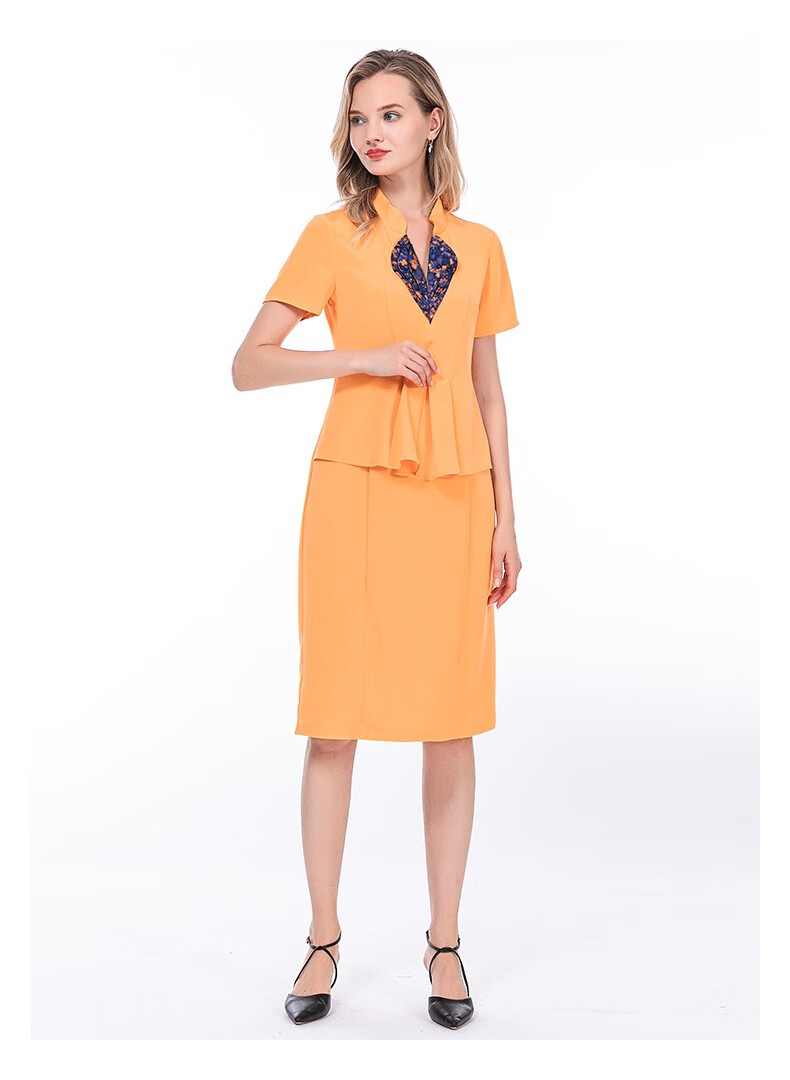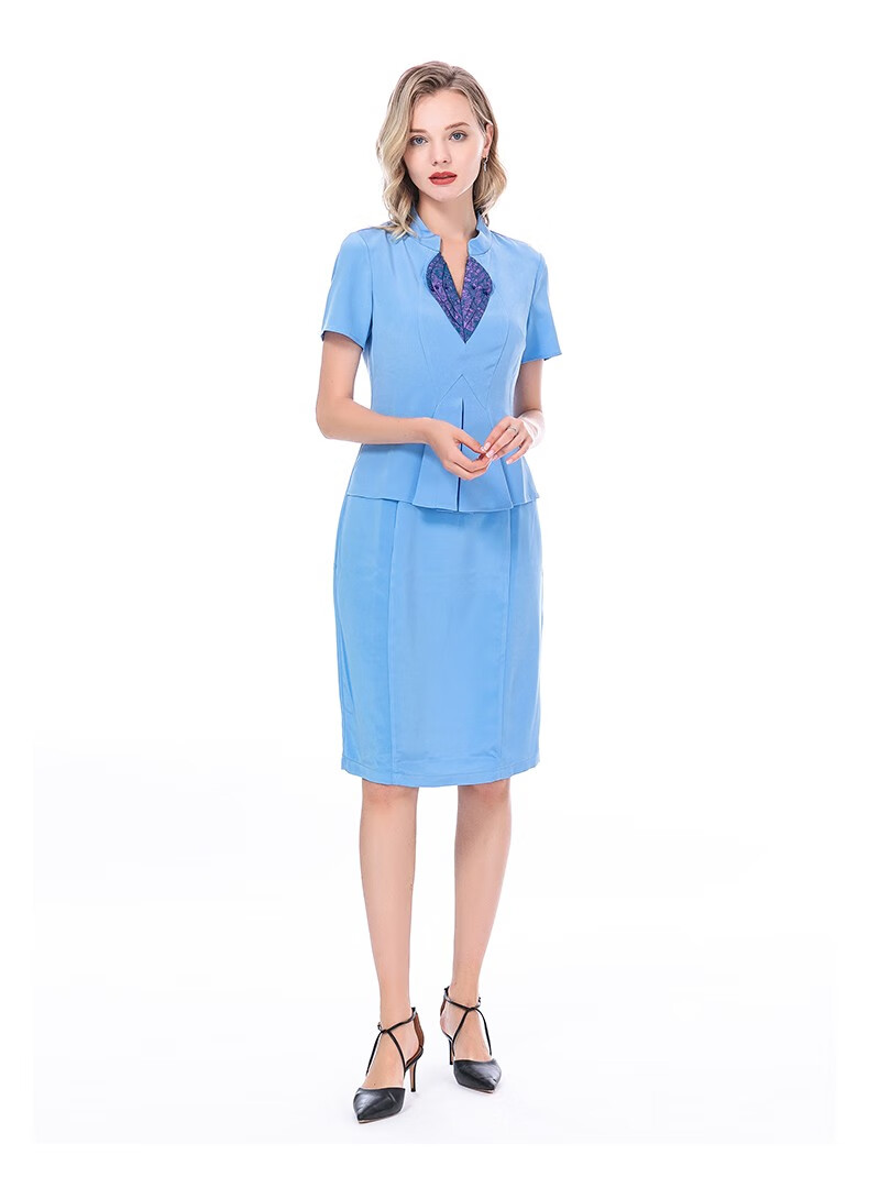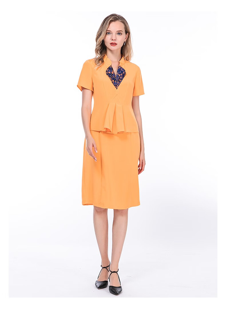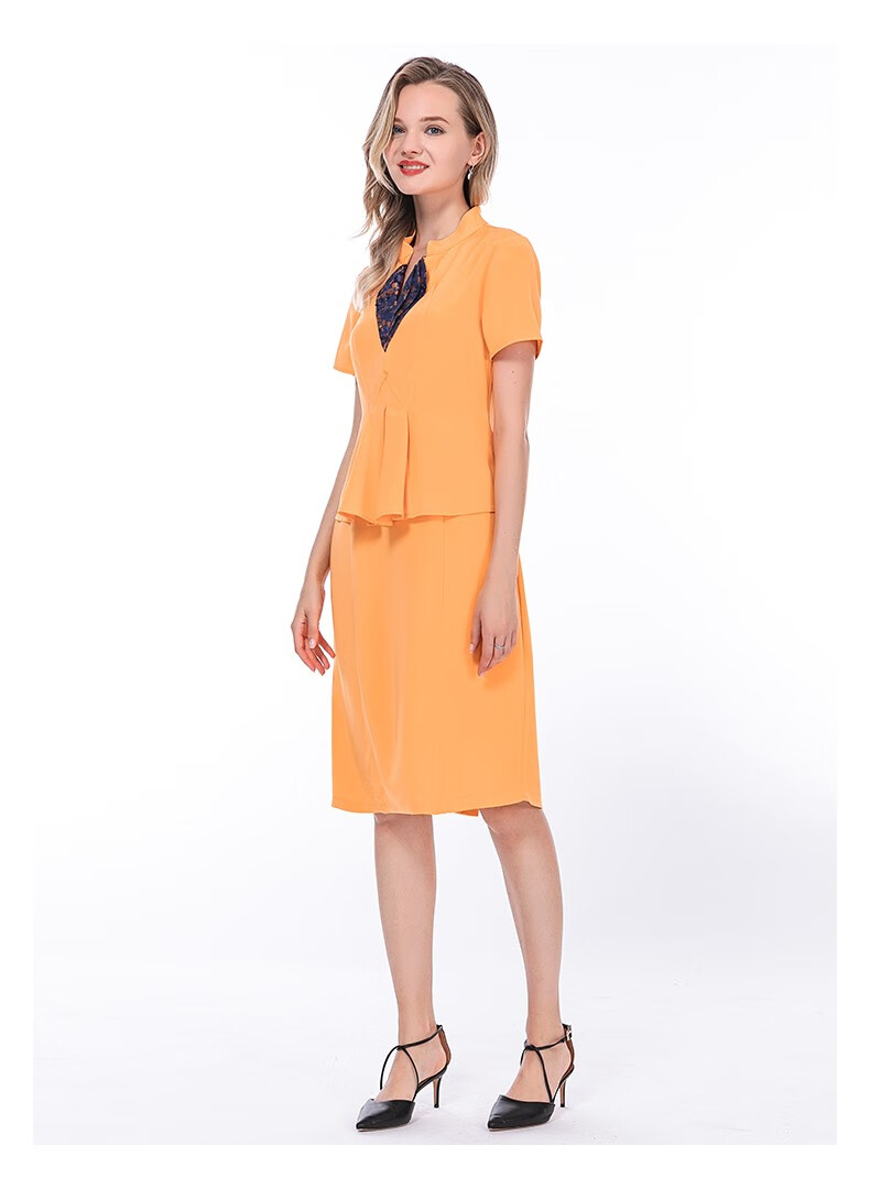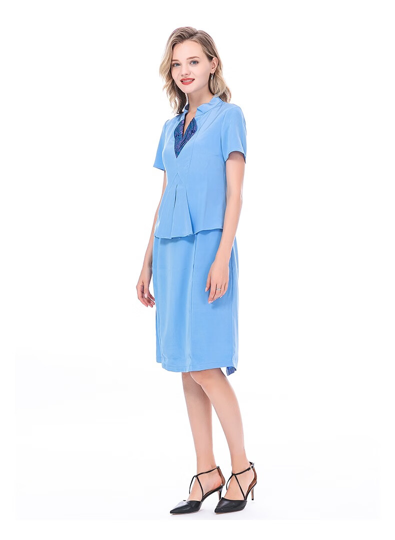 VOA36姆米蚕丝重磅立领提花拼接短袖收腰假两件职业装连衣裙 A82 流光蔚蓝(Q82) S
