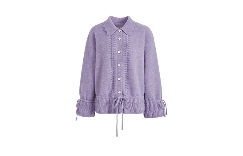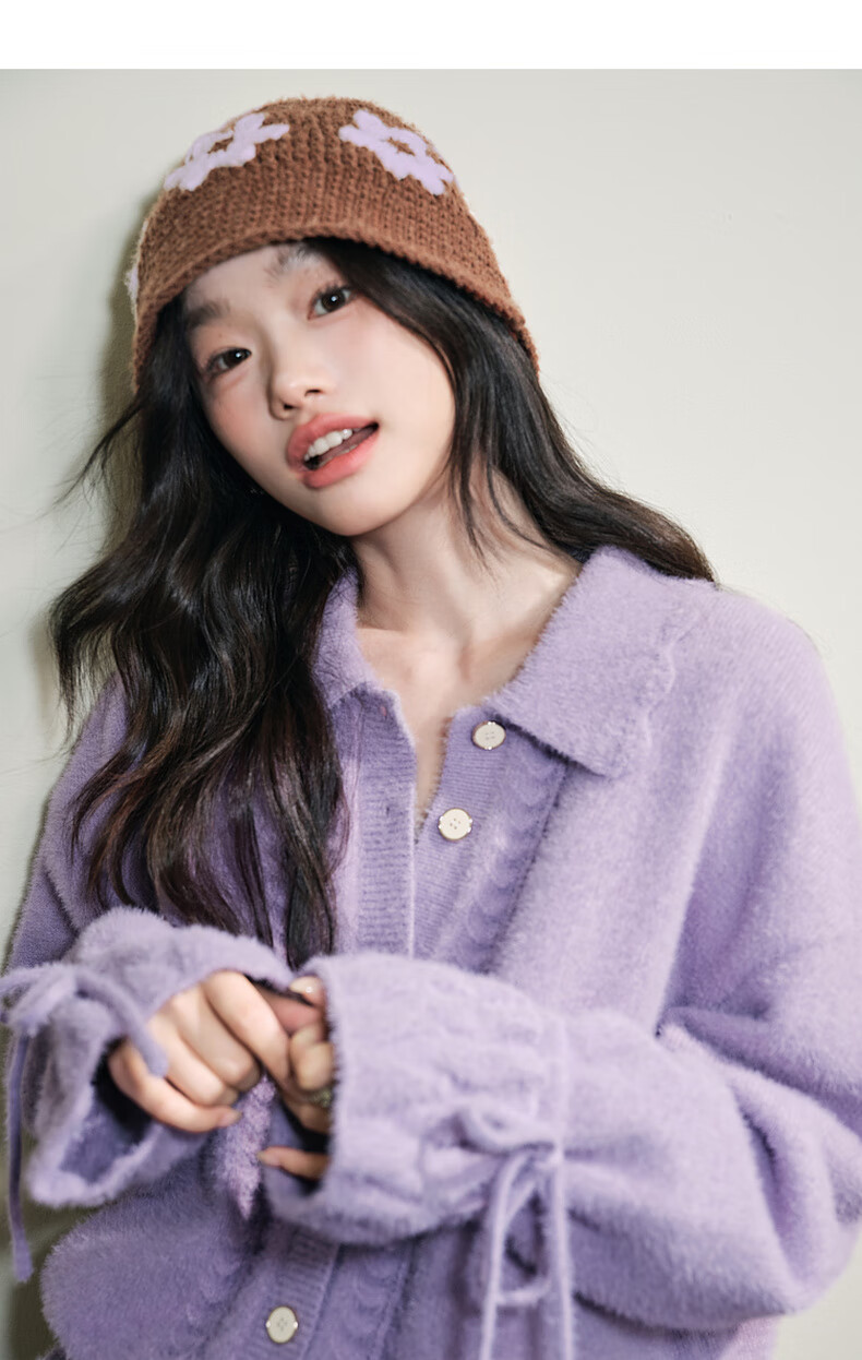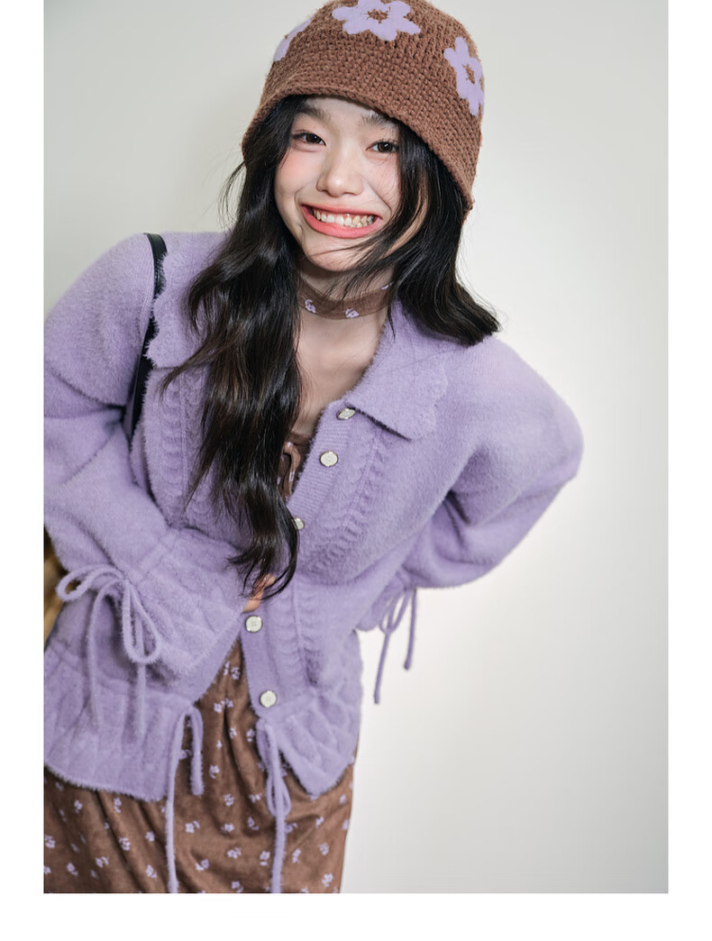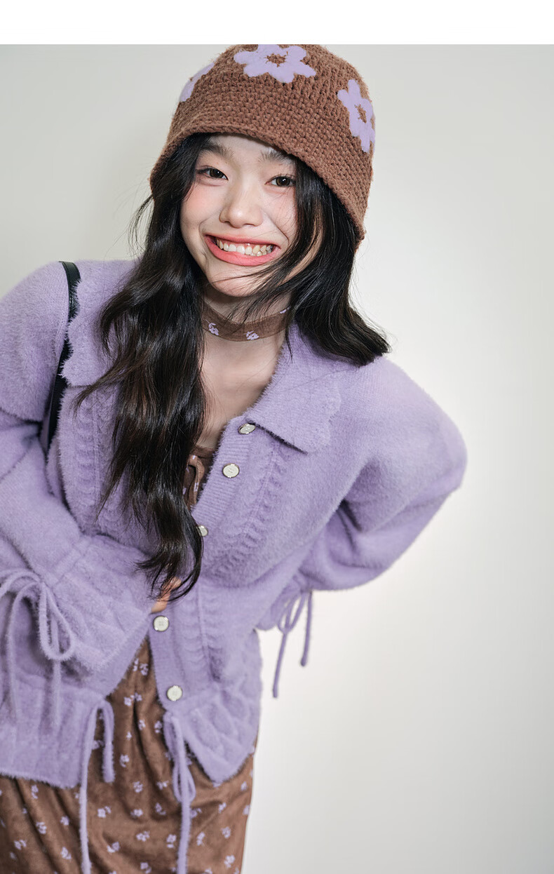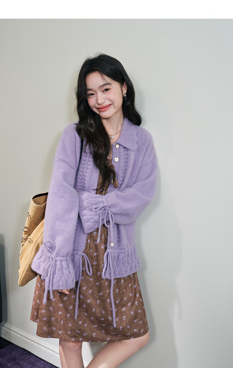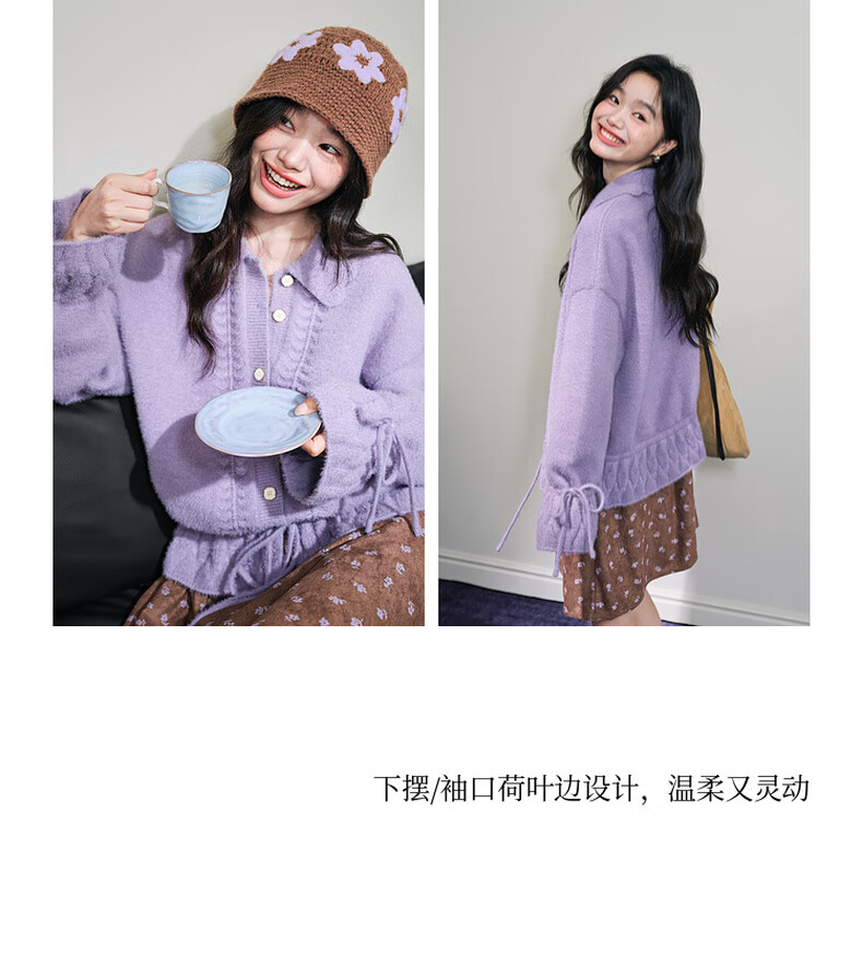 阔色浅紫色荷叶边针织开衫外套女2025秋冬季新款温柔风搭配毛衣 紫色 M