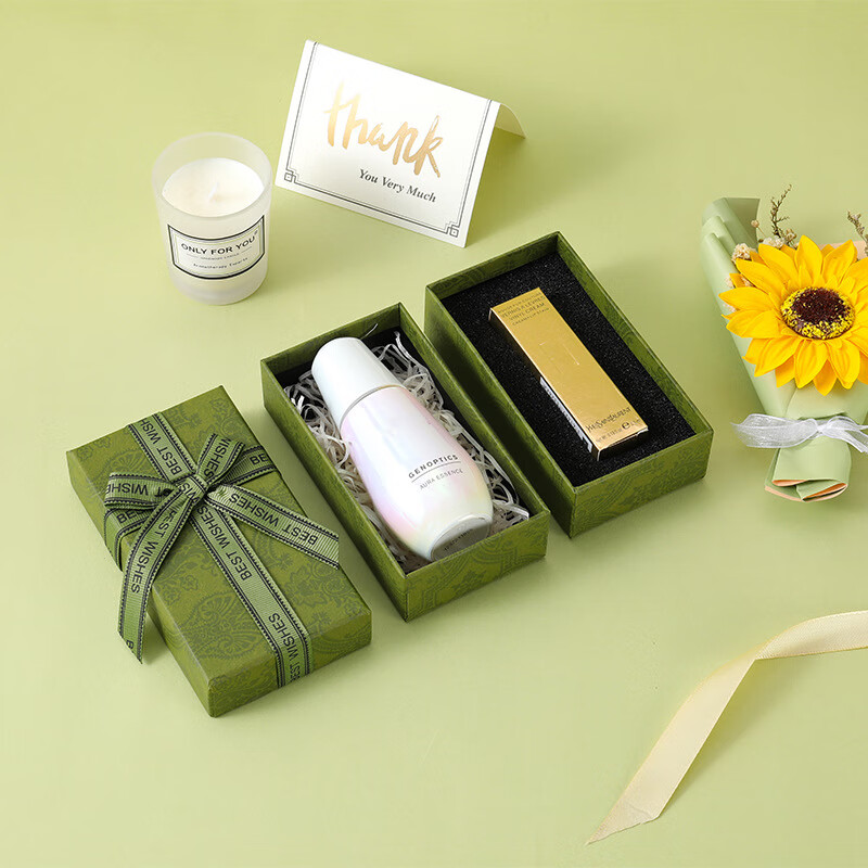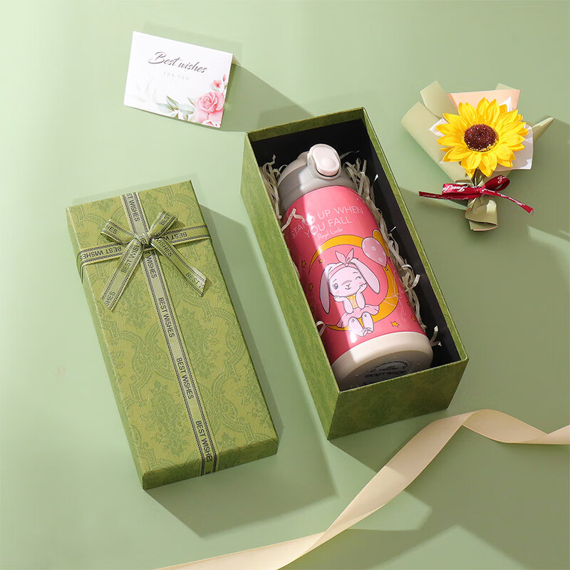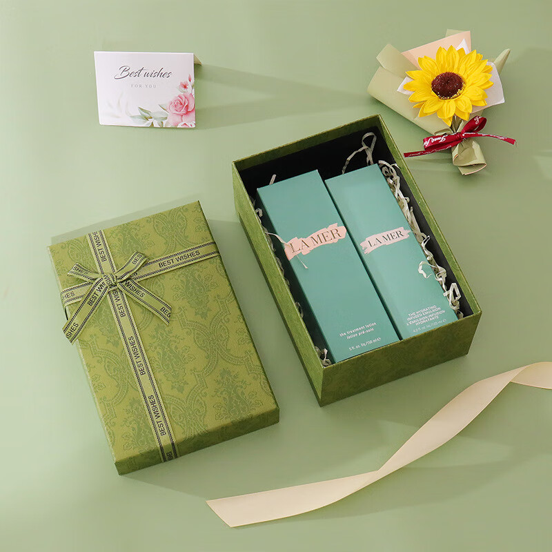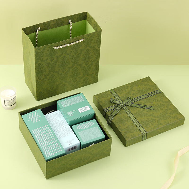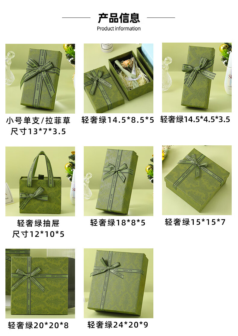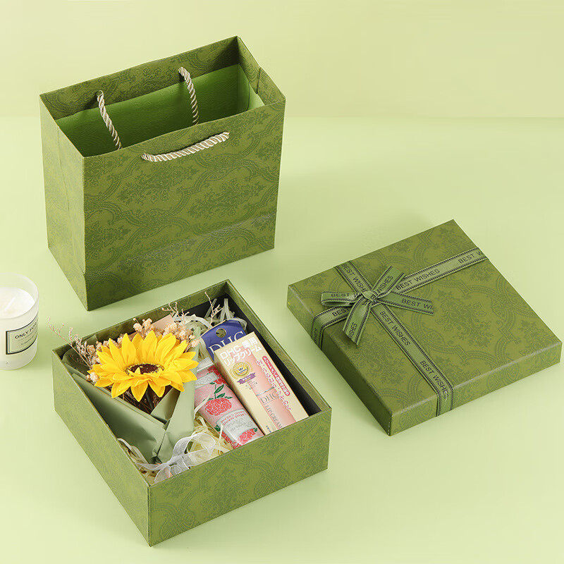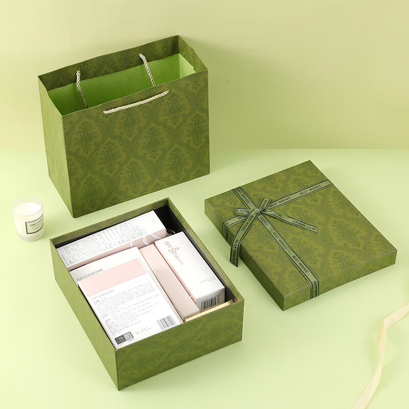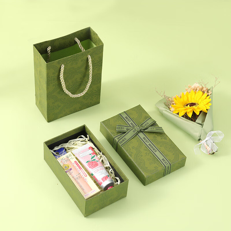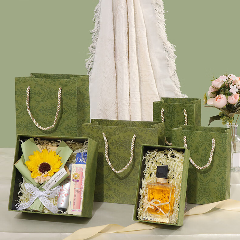 欧斯若 复古绿色礼品盒手提袋套装 保温杯礼盒 香水包装盒 生日礼物盒 空礼盒约14*8*5+拉菲草+袋子 天地盖礼盒