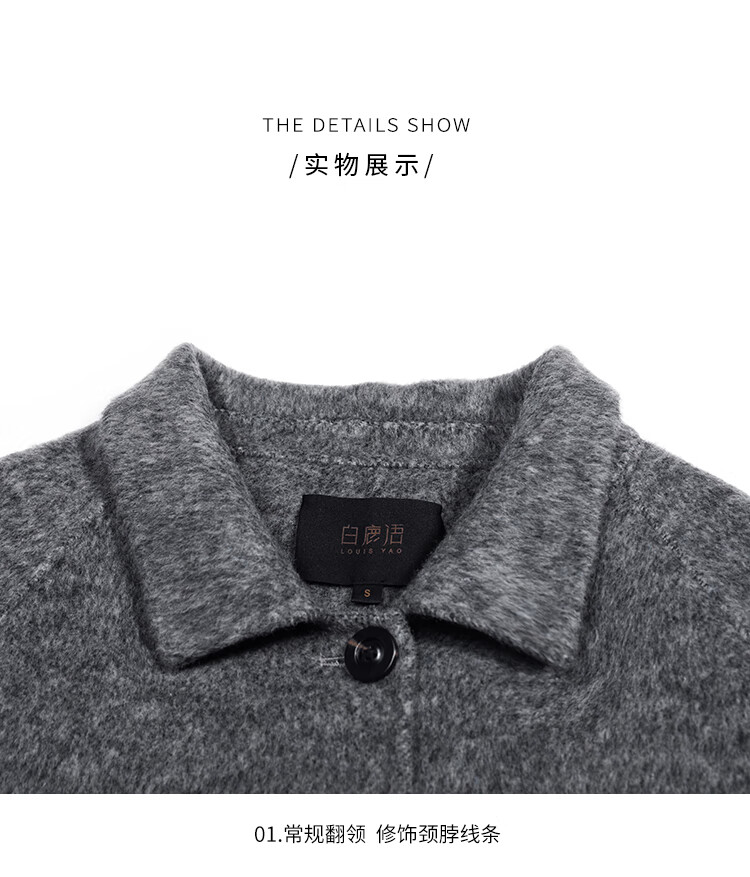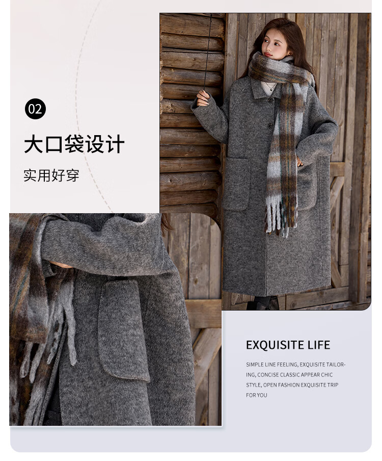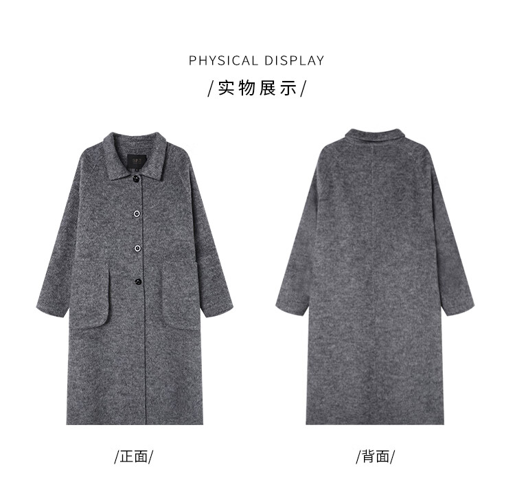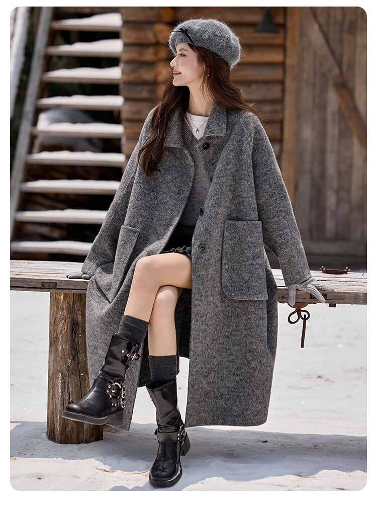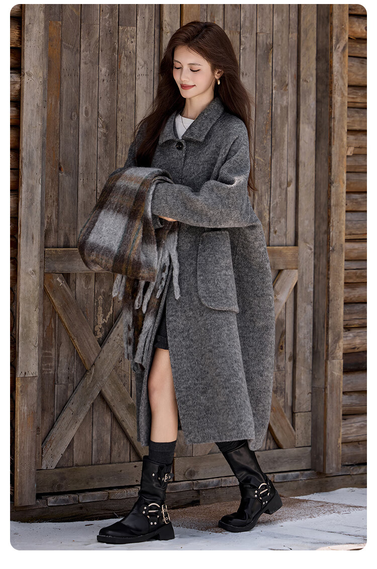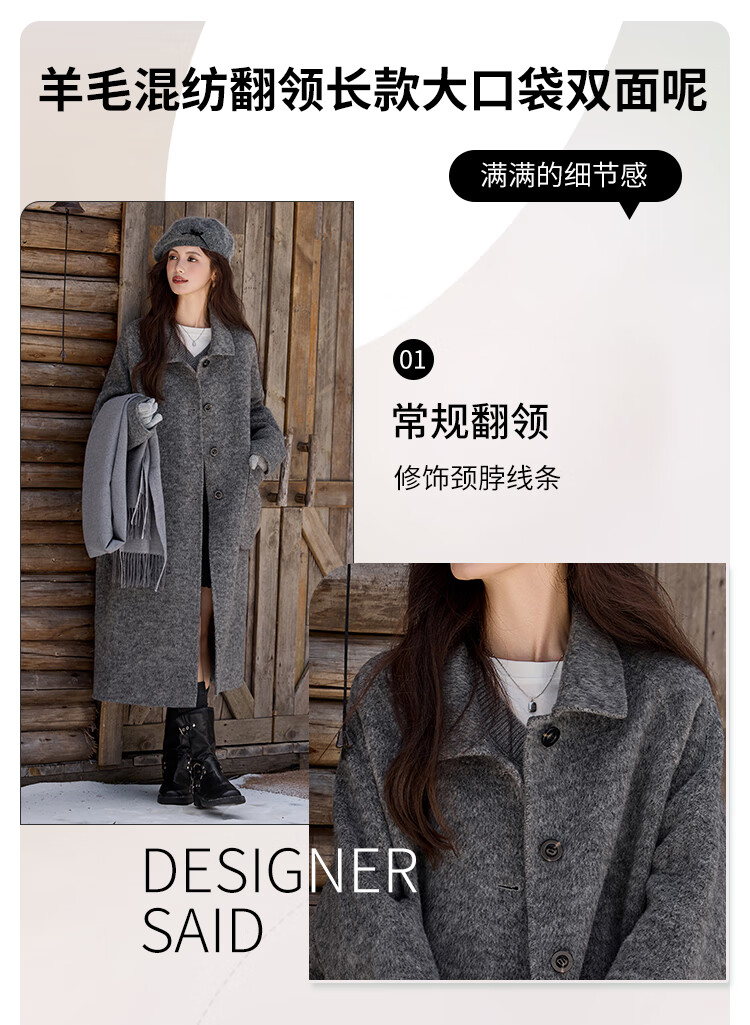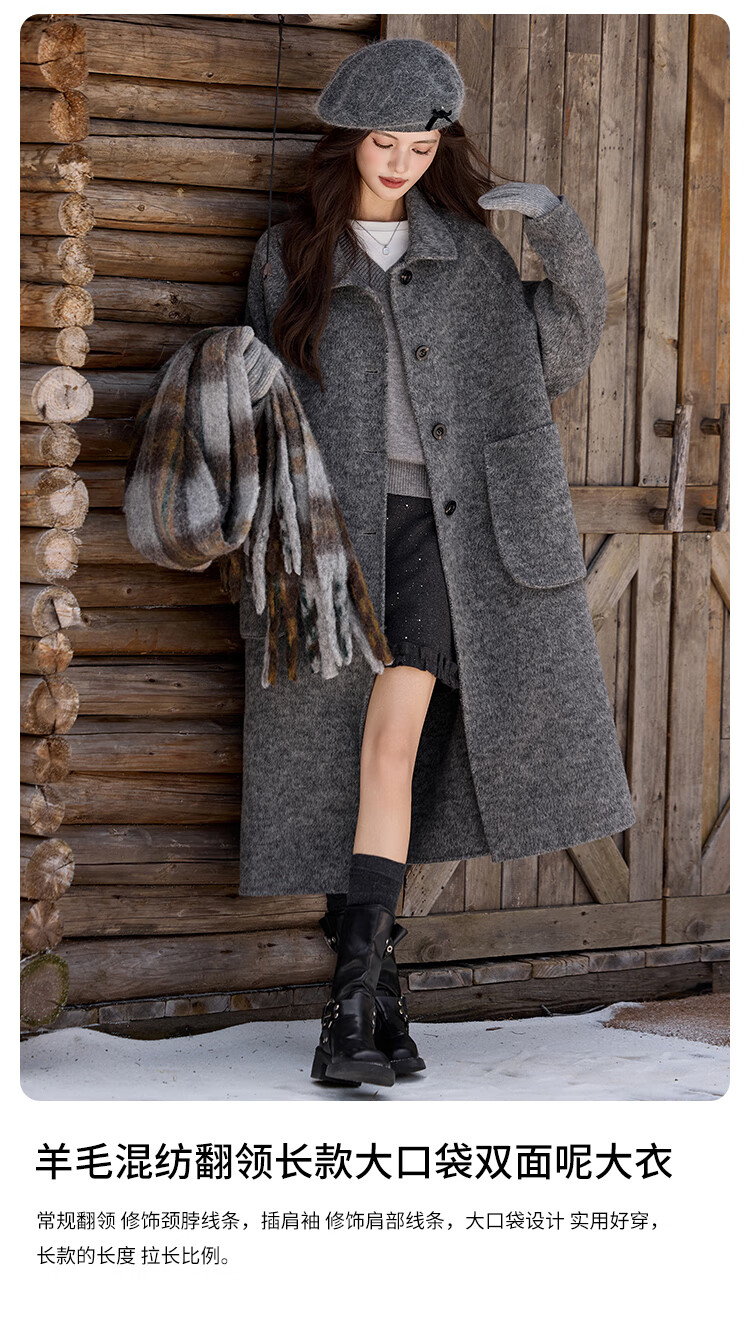 白鹿语翻领大口袋毛呢大衣25冬新年拜年羊毛混纺长款双面呢女 花灰色 S