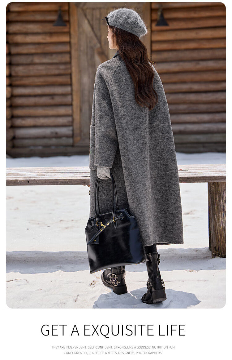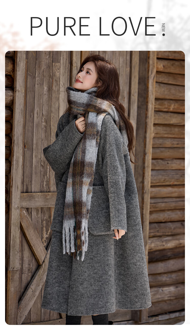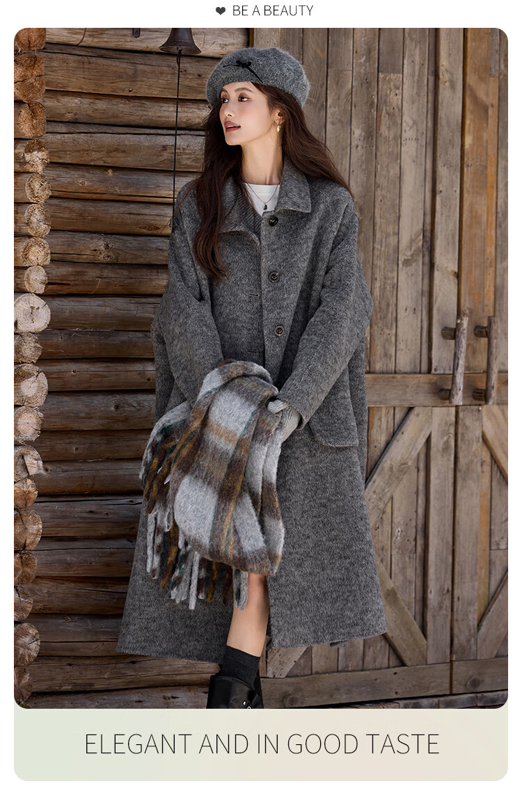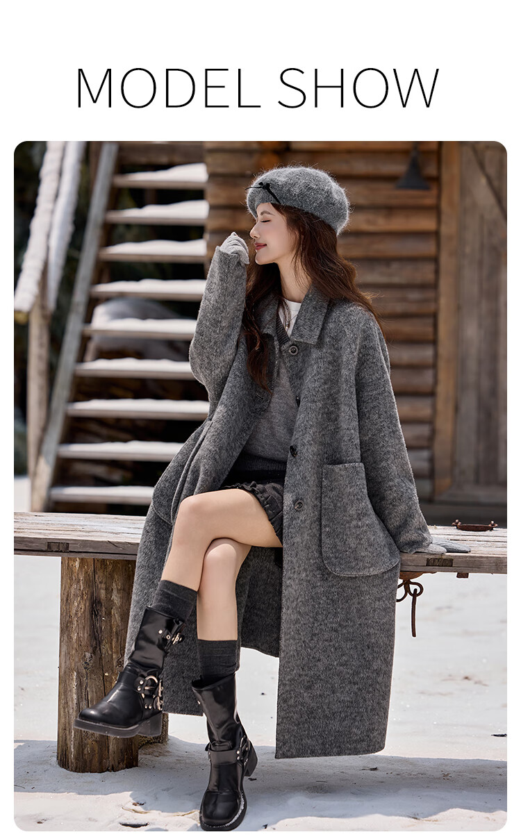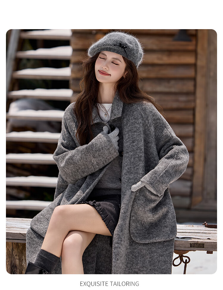 白鹿语翻领大口袋毛呢大衣25冬新年拜年羊毛混纺长款双面呢女 花灰色 S