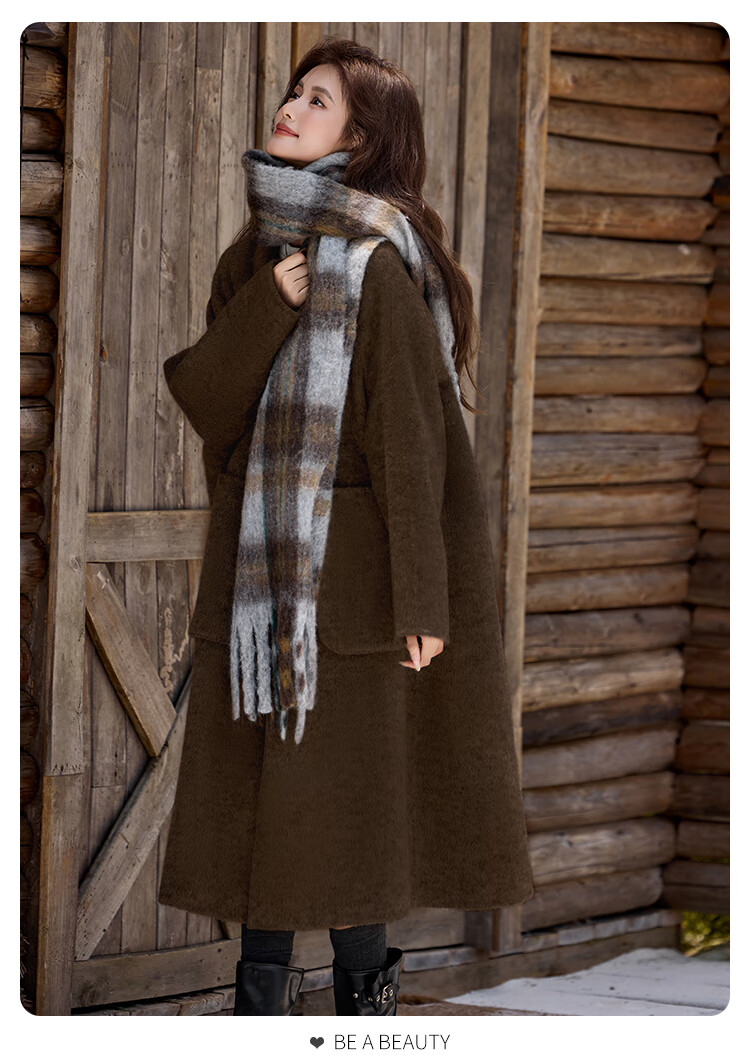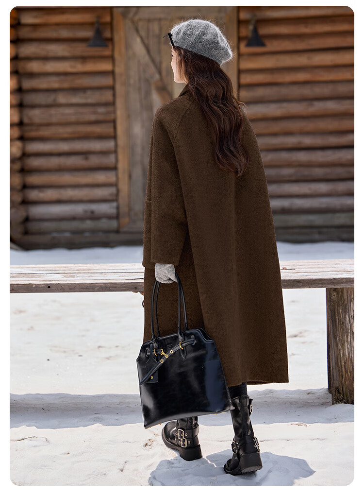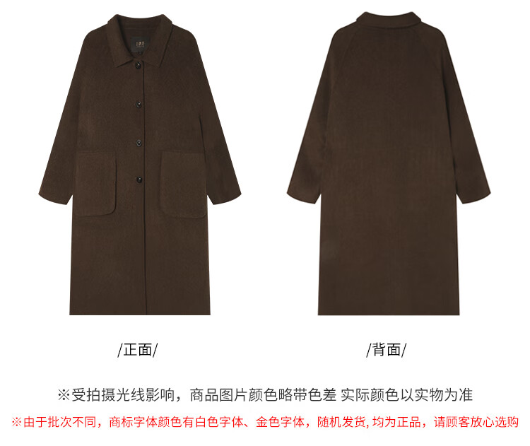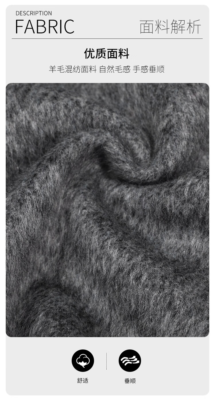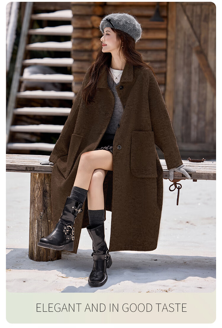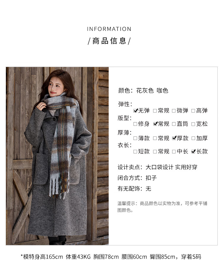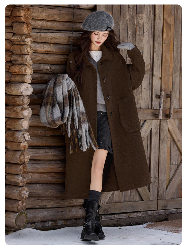 白鹿语翻领大口袋毛呢大衣25冬新年拜年羊毛混纺长款双面呢女 花灰色 S