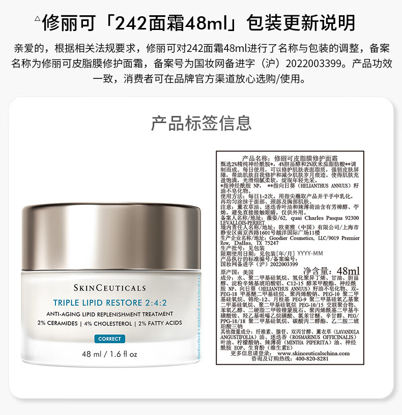 修丽可242皮脂膜修护面霜 膏状 紧致保湿滋润修护补水 48ml 【爆款热卖】修丽可242面霜48ml