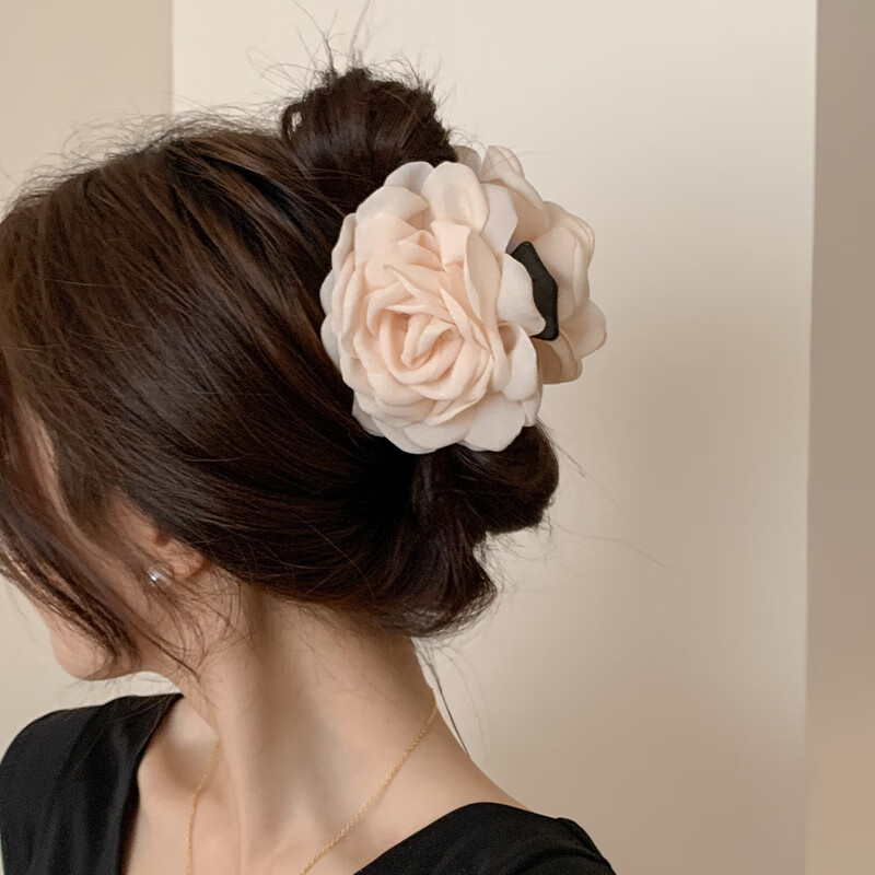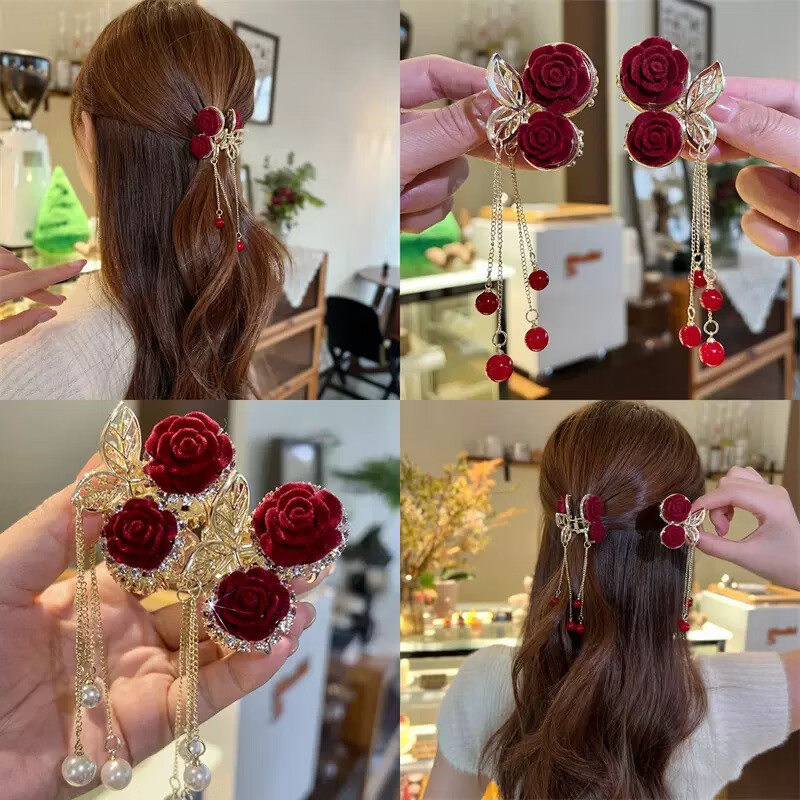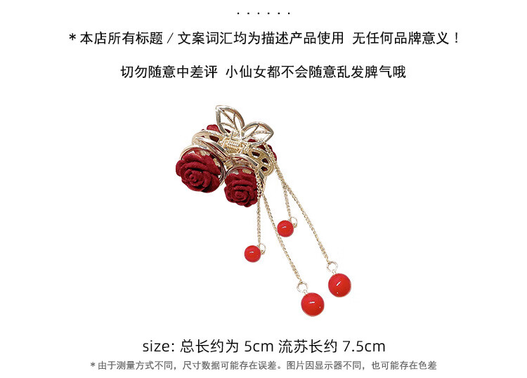 缪色(MiU Se)红色植绒玫瑰花抓夹女秋冬后脑勺半扎红豆发夹子头饰小号流苏发卡 两朵玫瑰花珍珠款A15-101