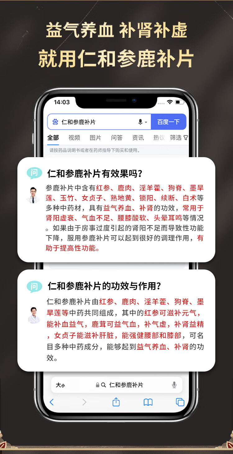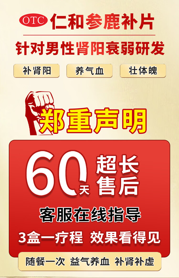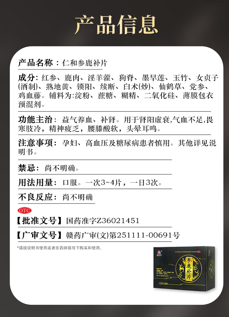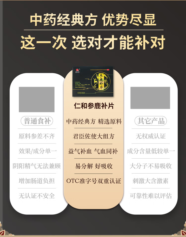 [仁和]参鹿补片 0.31g*24片 3盒装 正品补肾益气养血腰膝酸软肾虚衰气血不足精神疲乏有效期至26-2 效期内放心使用 滋补肾精深入巩固