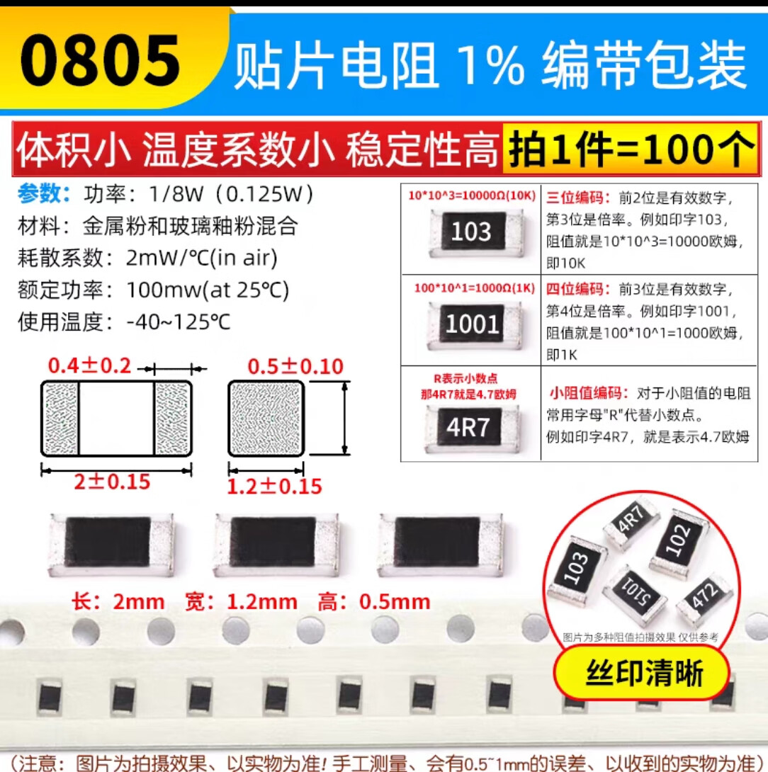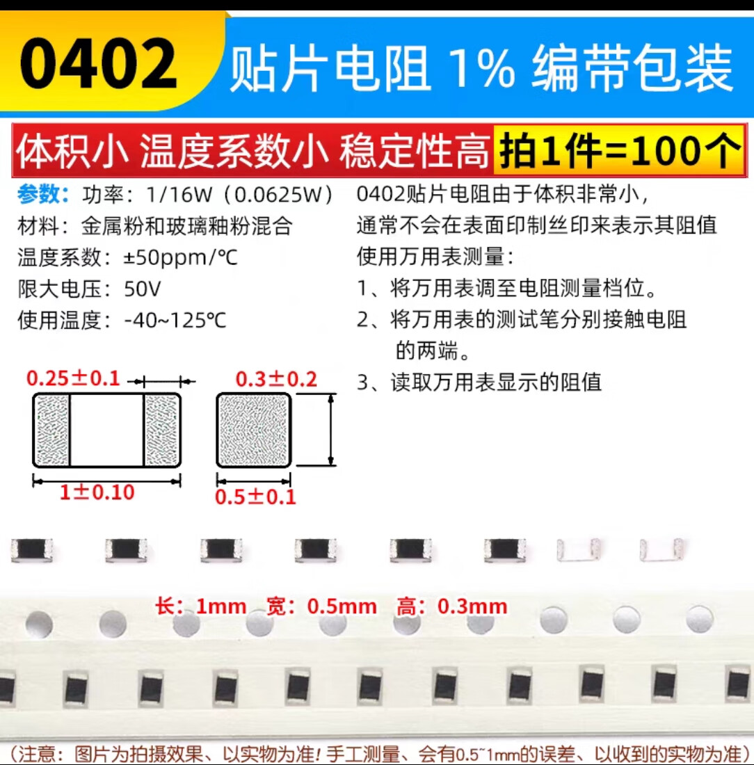 0603 0805 1206 0402贴片电阻器元件1k2k4.7k10k47k100k10欧姆 0603 1%(100个) 1欧