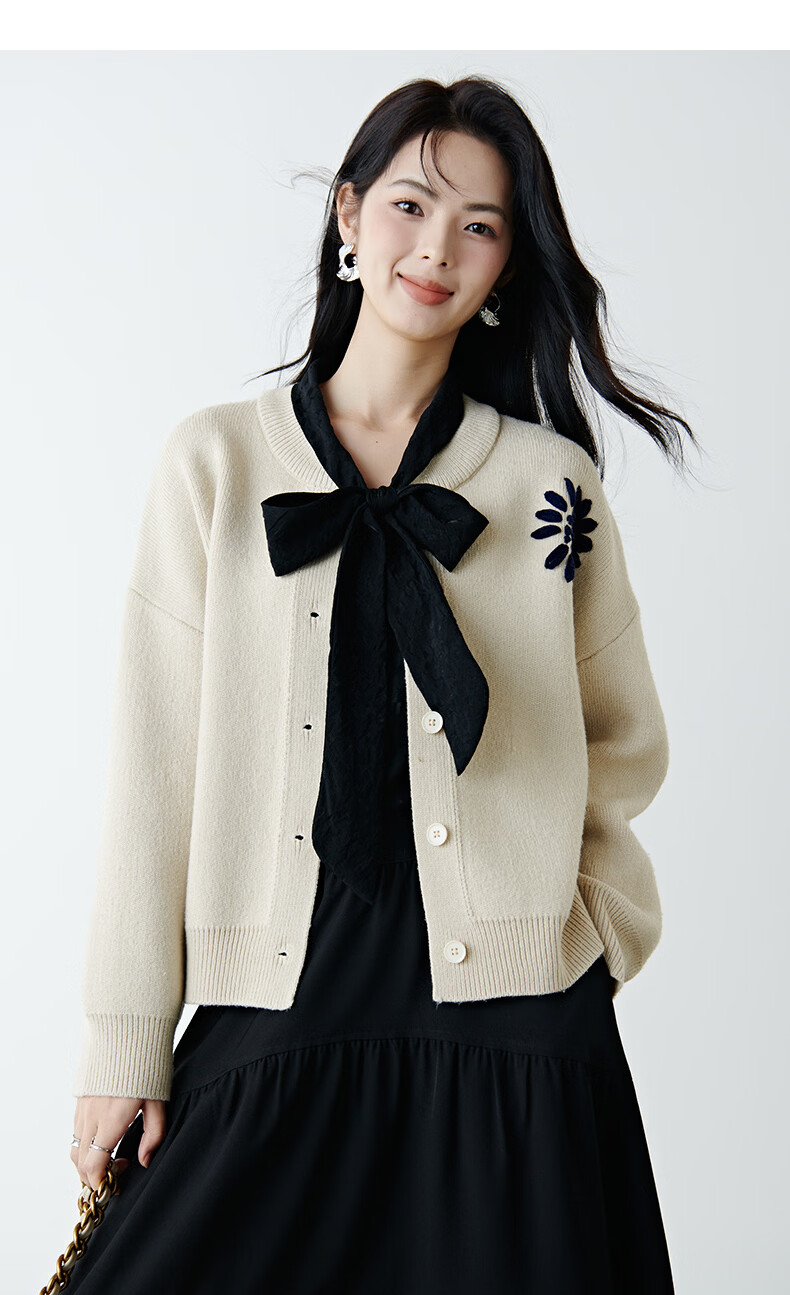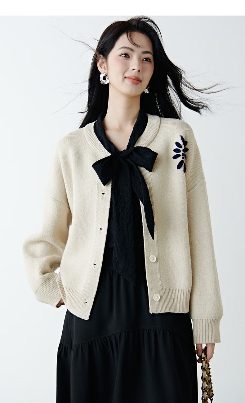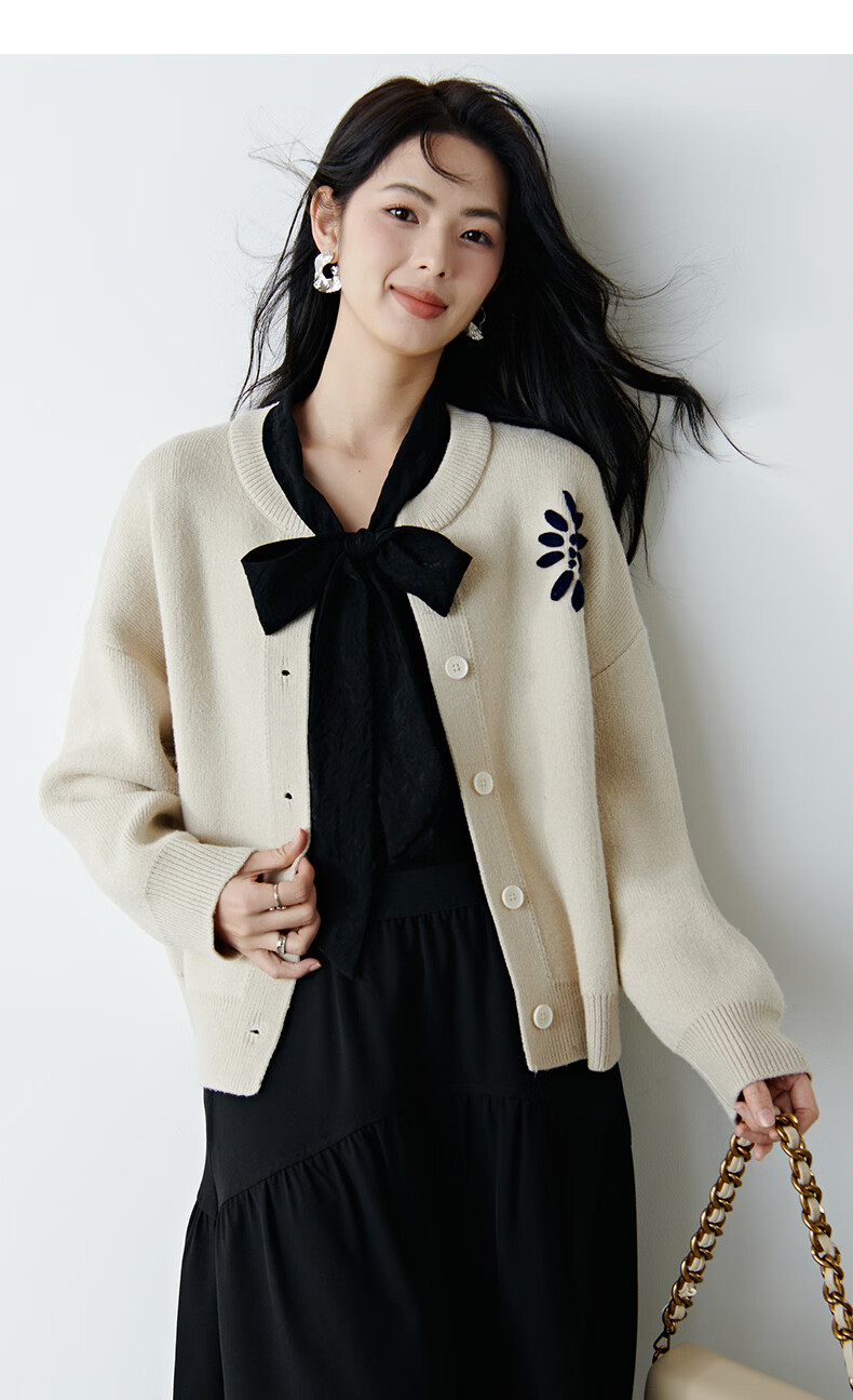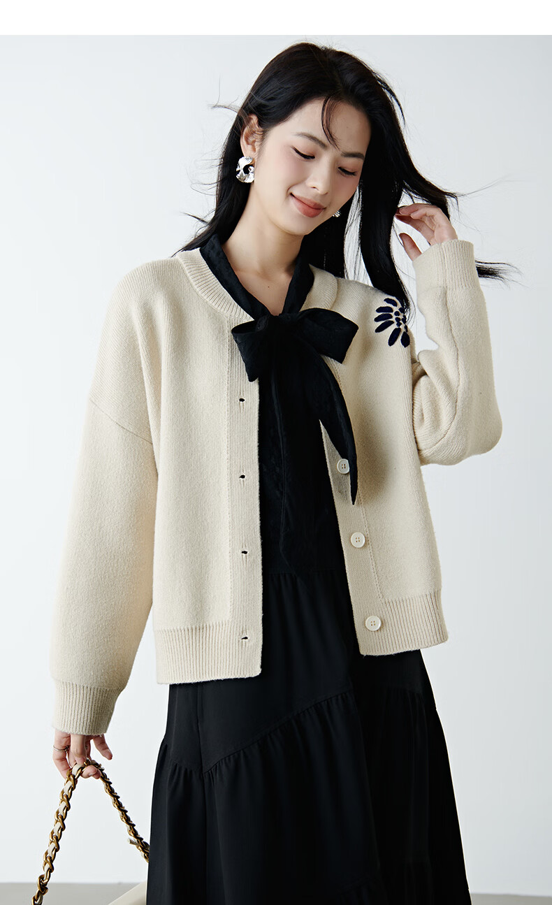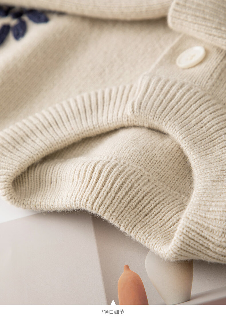 晚白2025年冬款时尚刺绣宽松圆领毛衣柔软舒适休闲针织开衫女 杏色 L