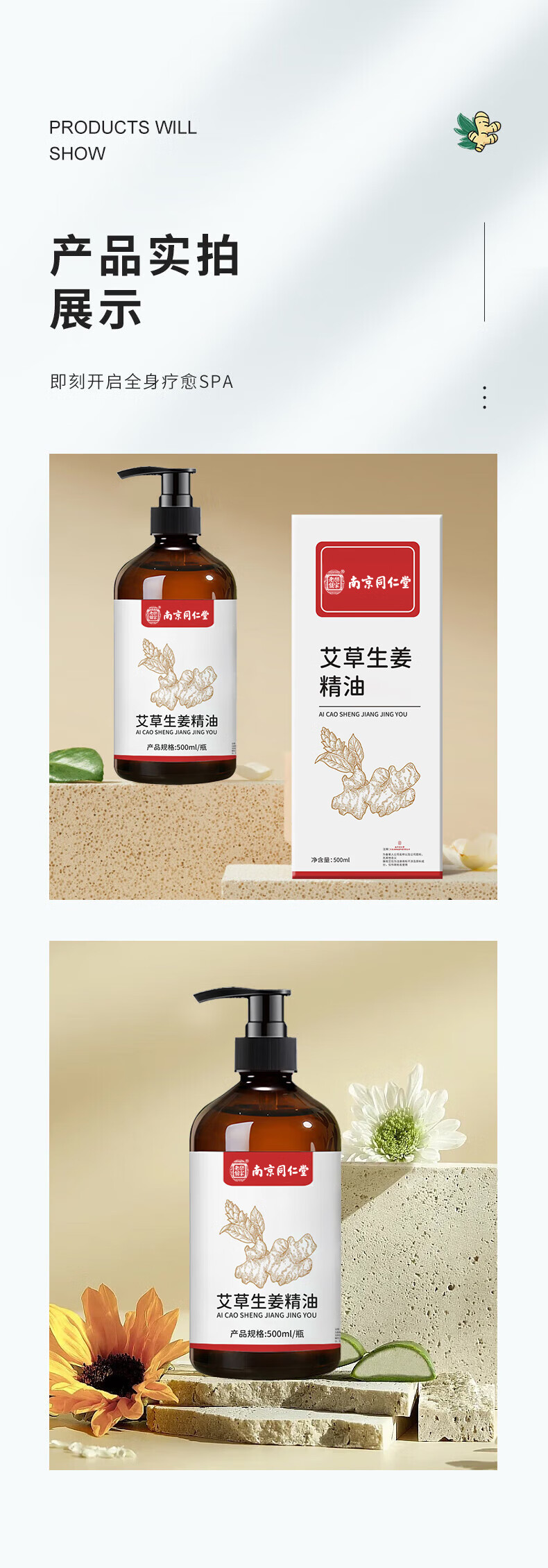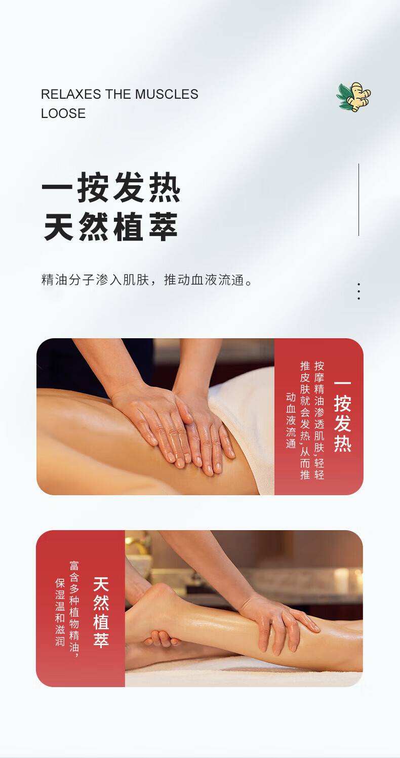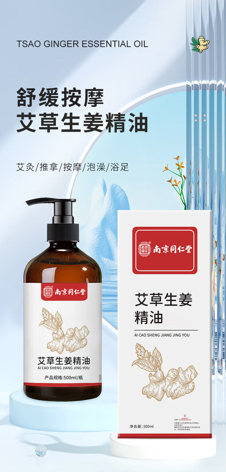 同仁堂艾草生姜精油按摩刮痧开背推拿spa通经络发热按摩油500ml
