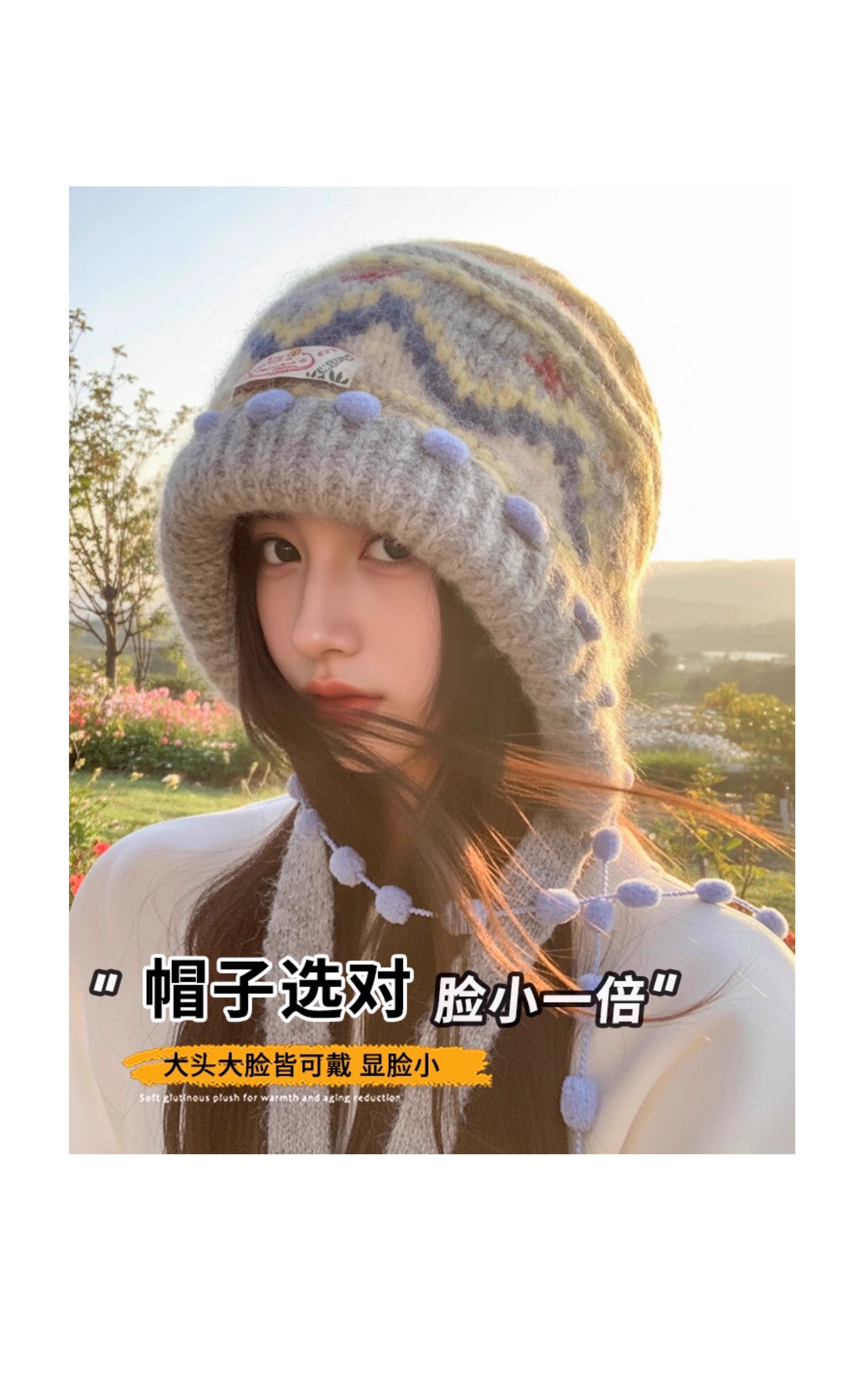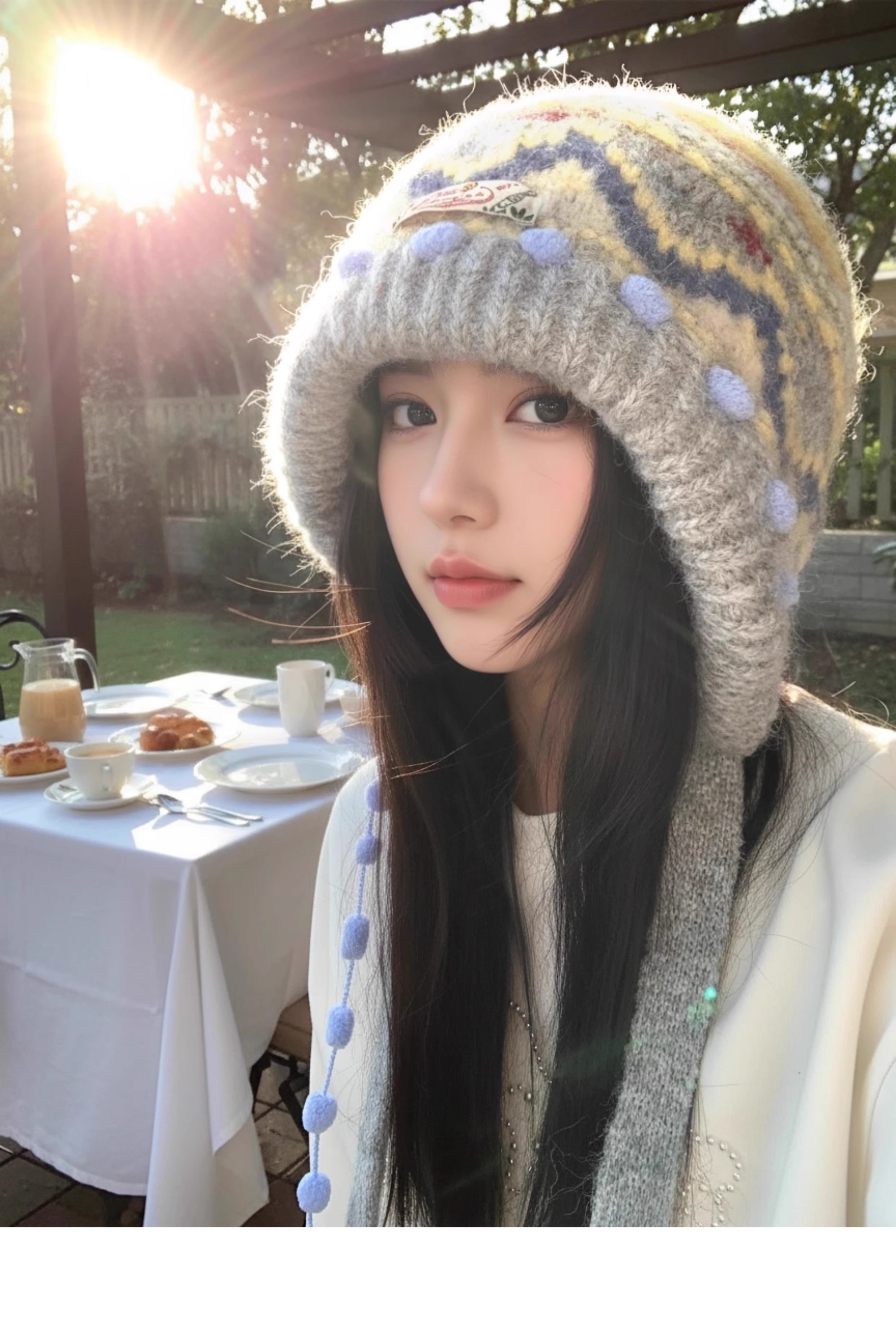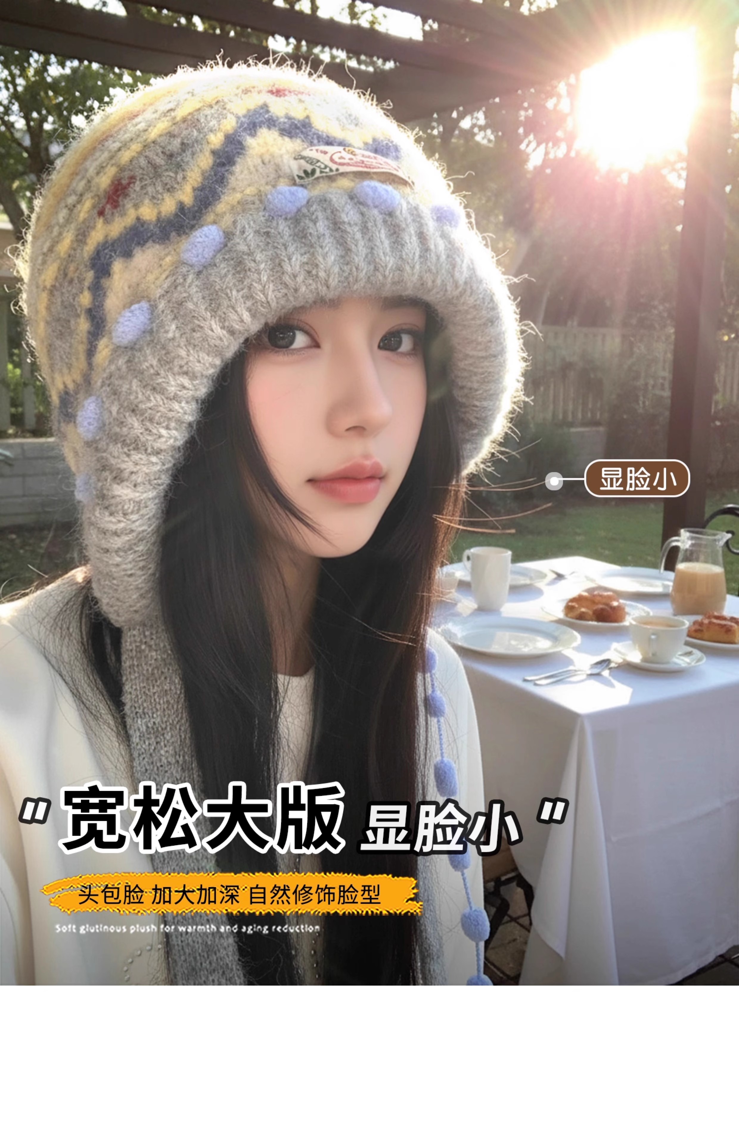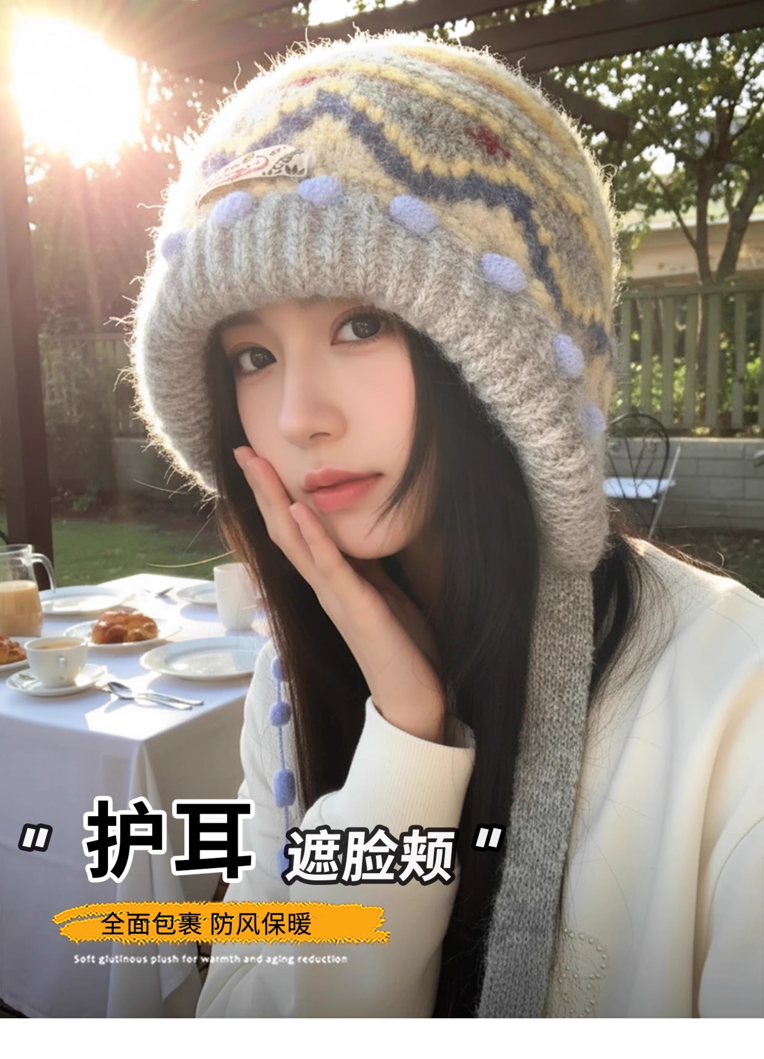 目丸复古费尔岛针织毛线帽女秋冬季保暖巴拉克拉法帽加厚护耳冬季帽子 灰色【主图款】
