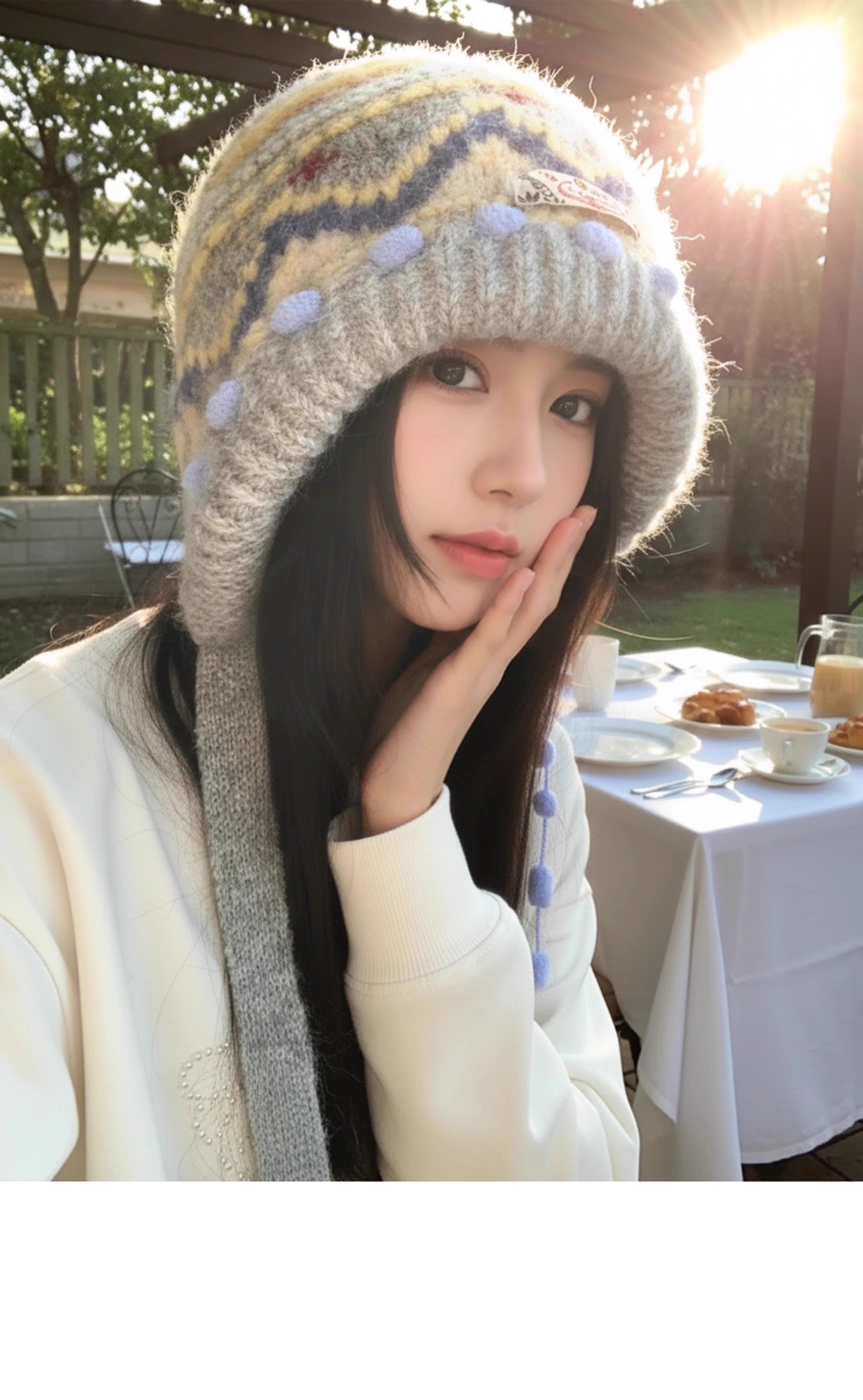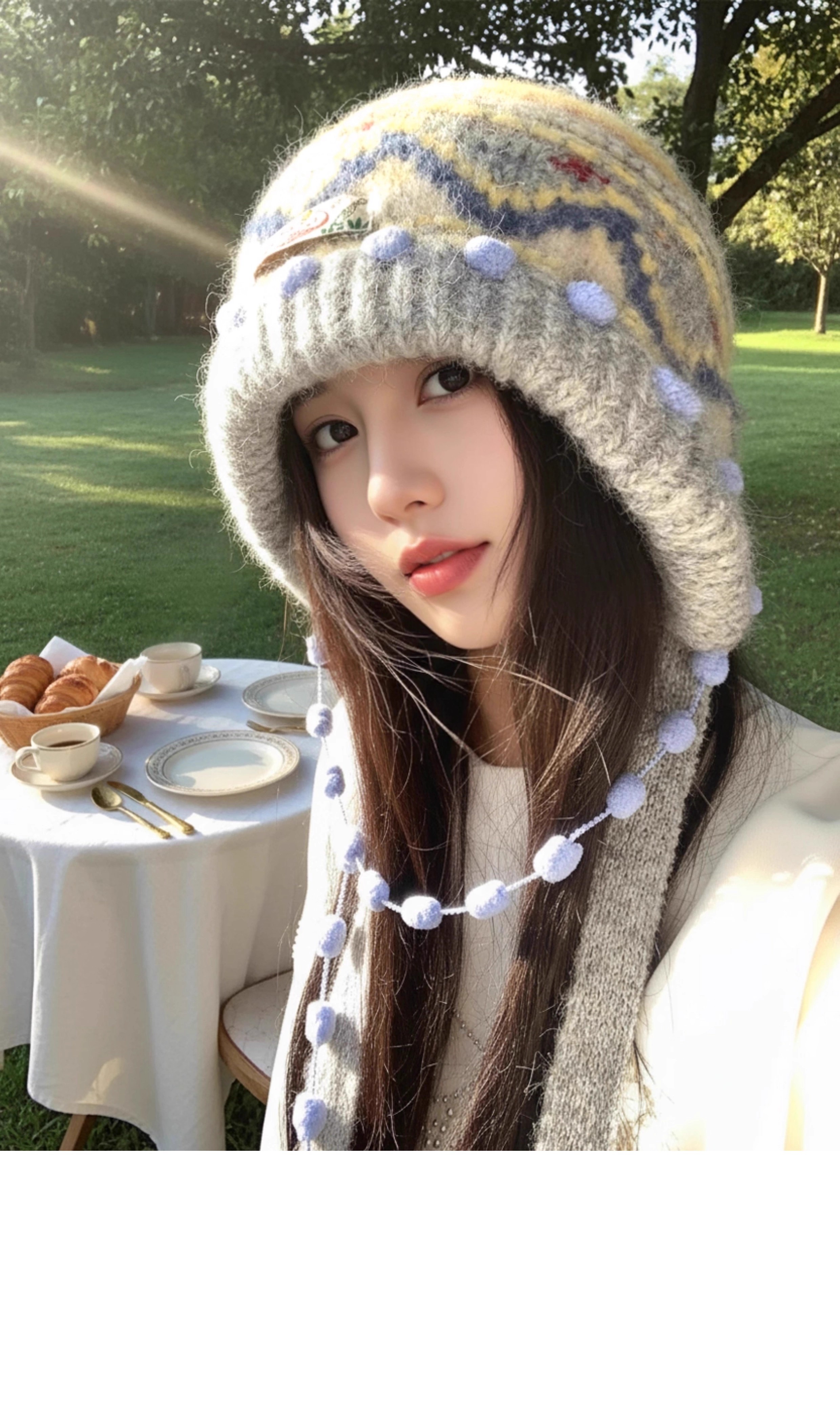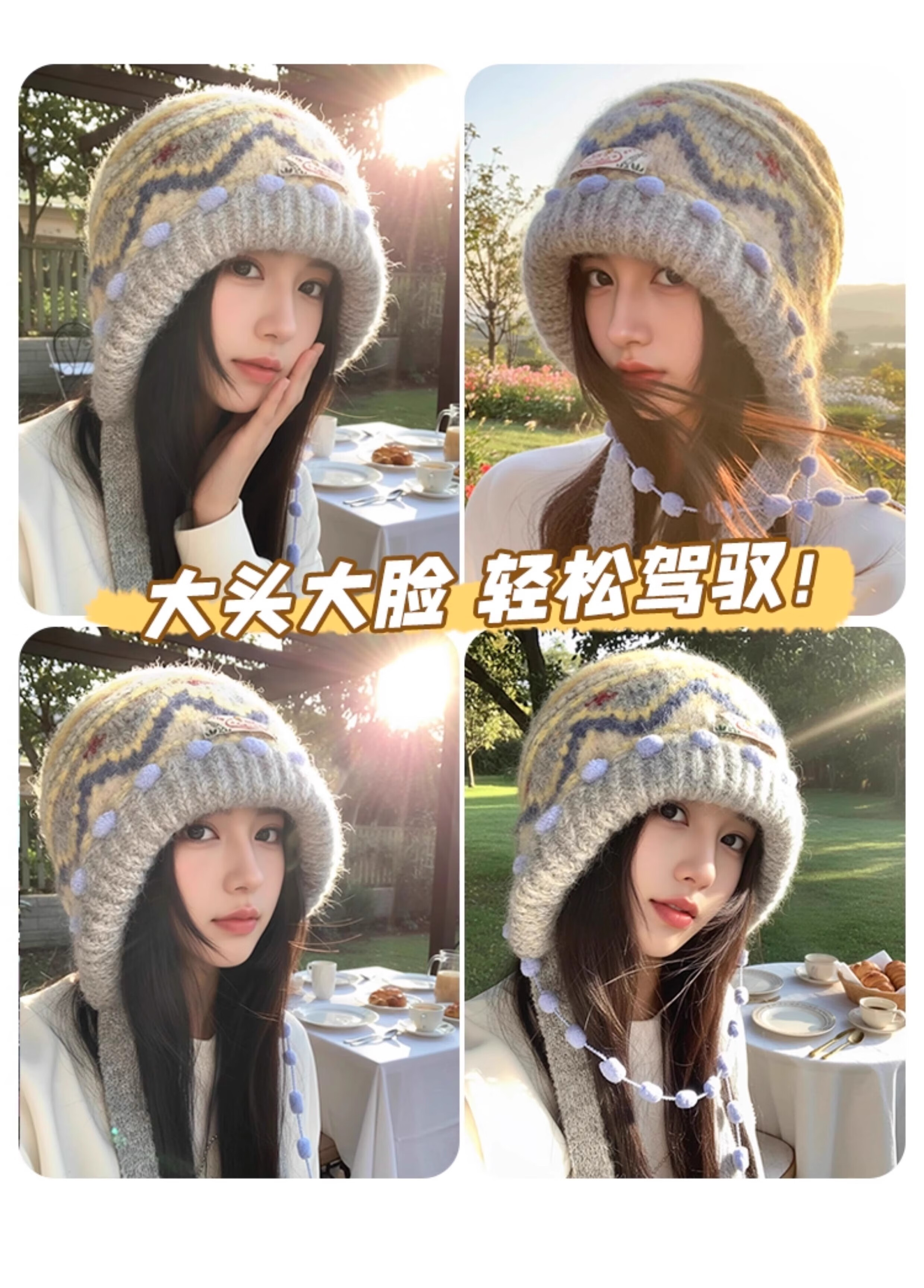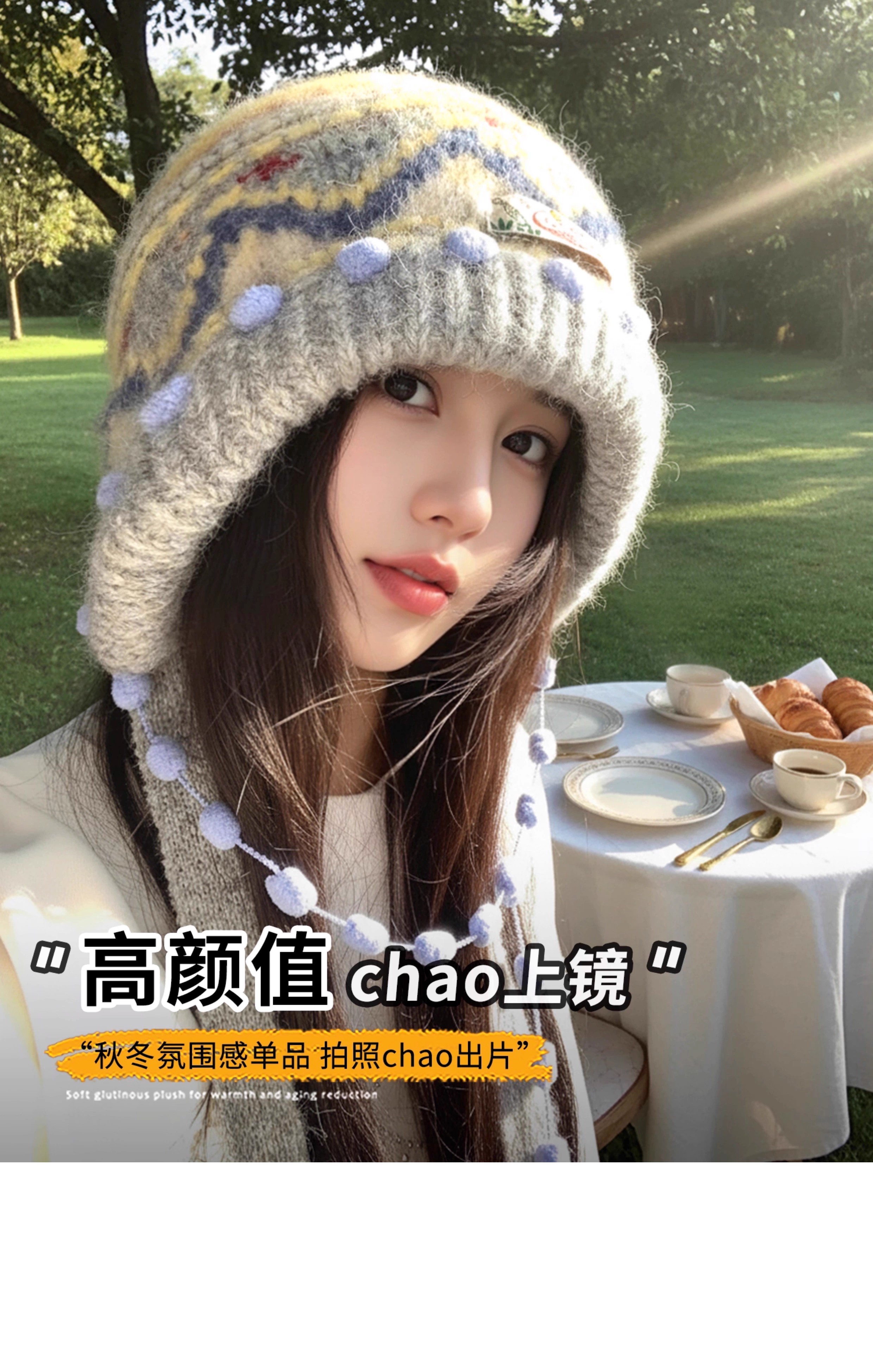 目丸复古费尔岛针织毛线帽女秋冬季保暖巴拉克拉法帽加厚护耳冬季帽子 灰色【主图款】