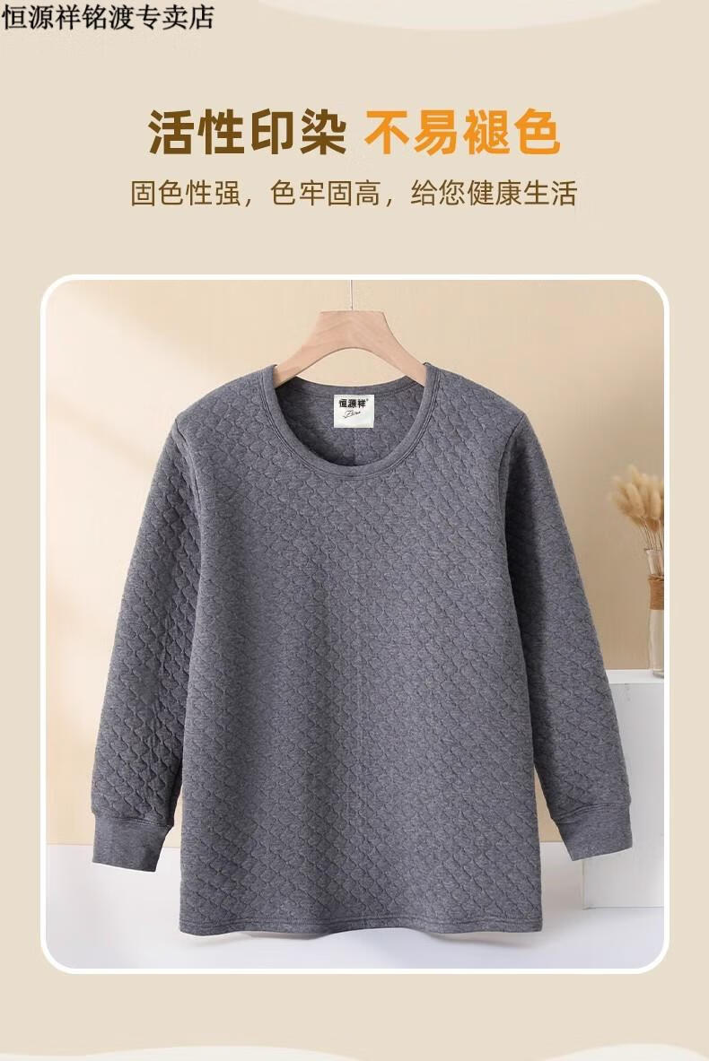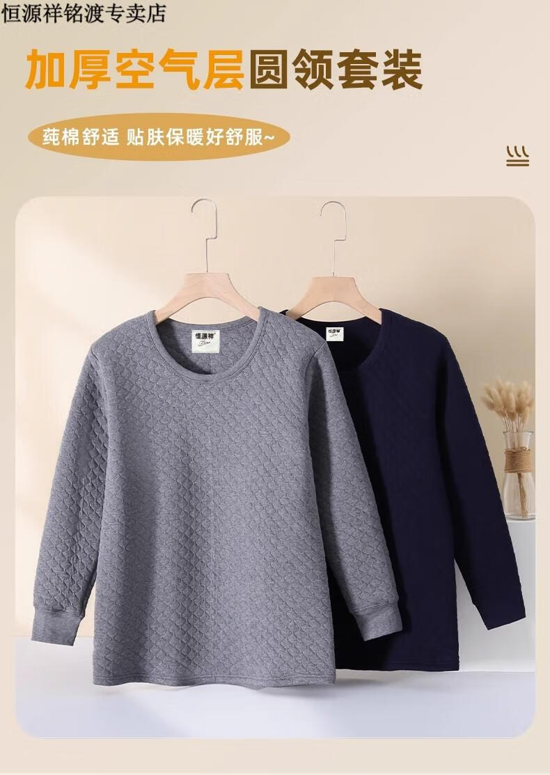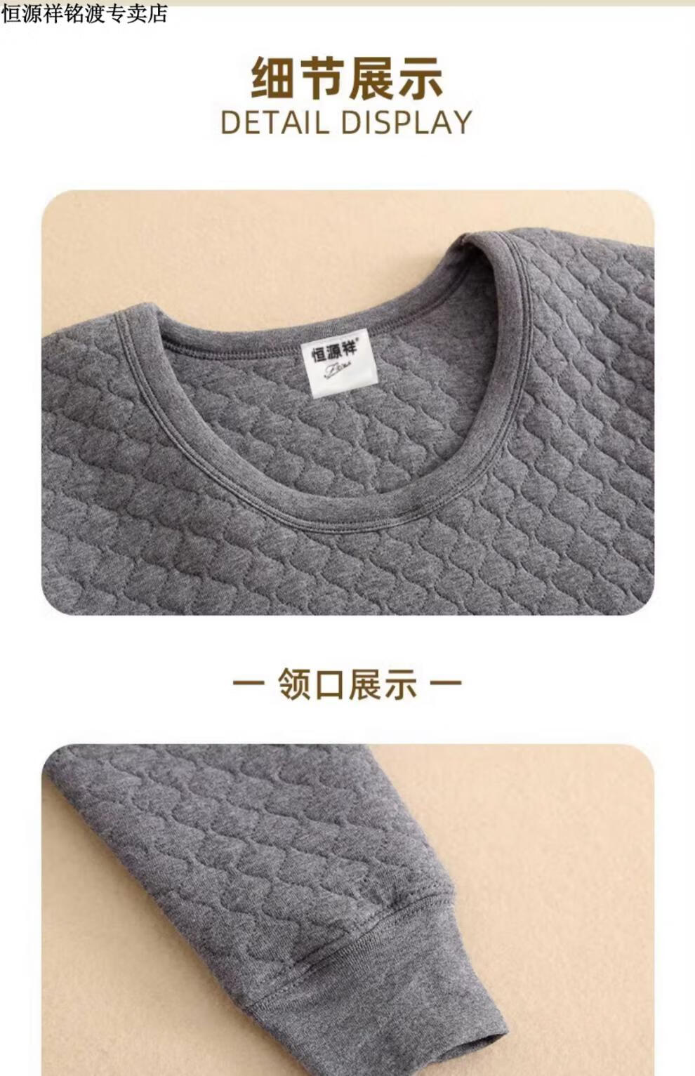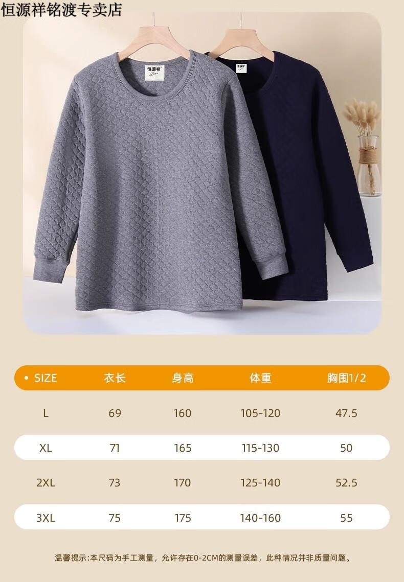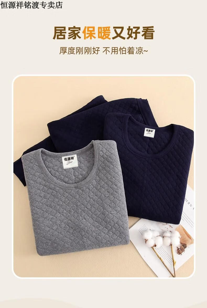 恒源祥三层加厚保暖内衣男士纯棉中老年人棉毛衫夹棉秋衣秋裤套装 藏青圆领 XL 175