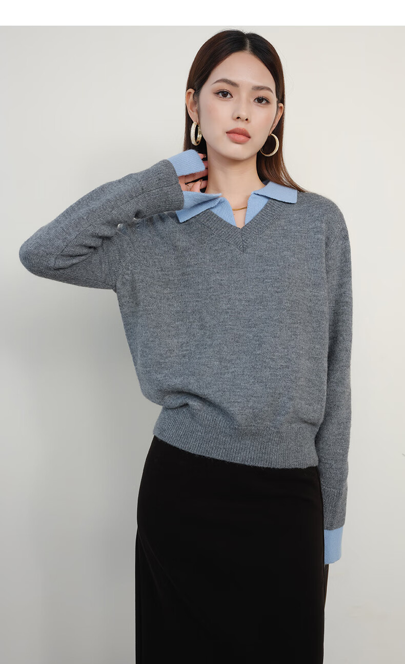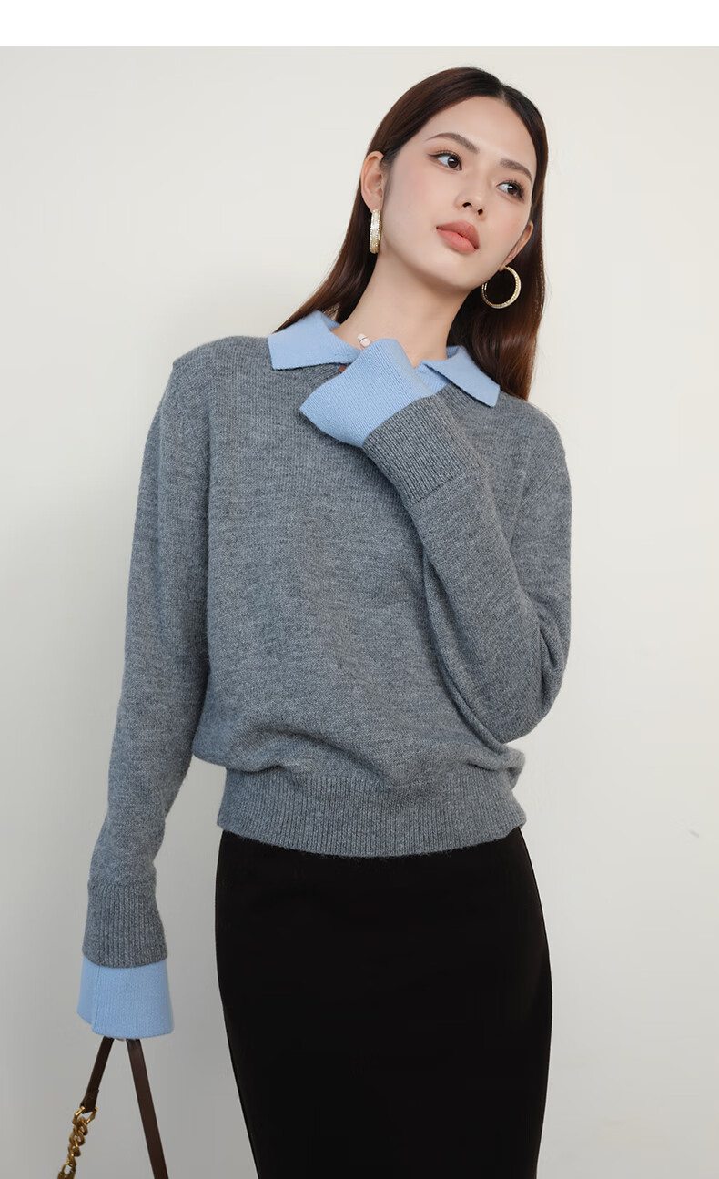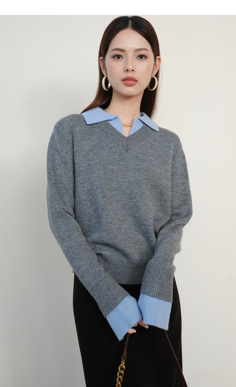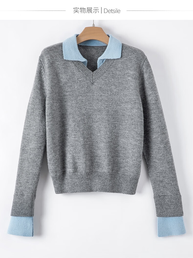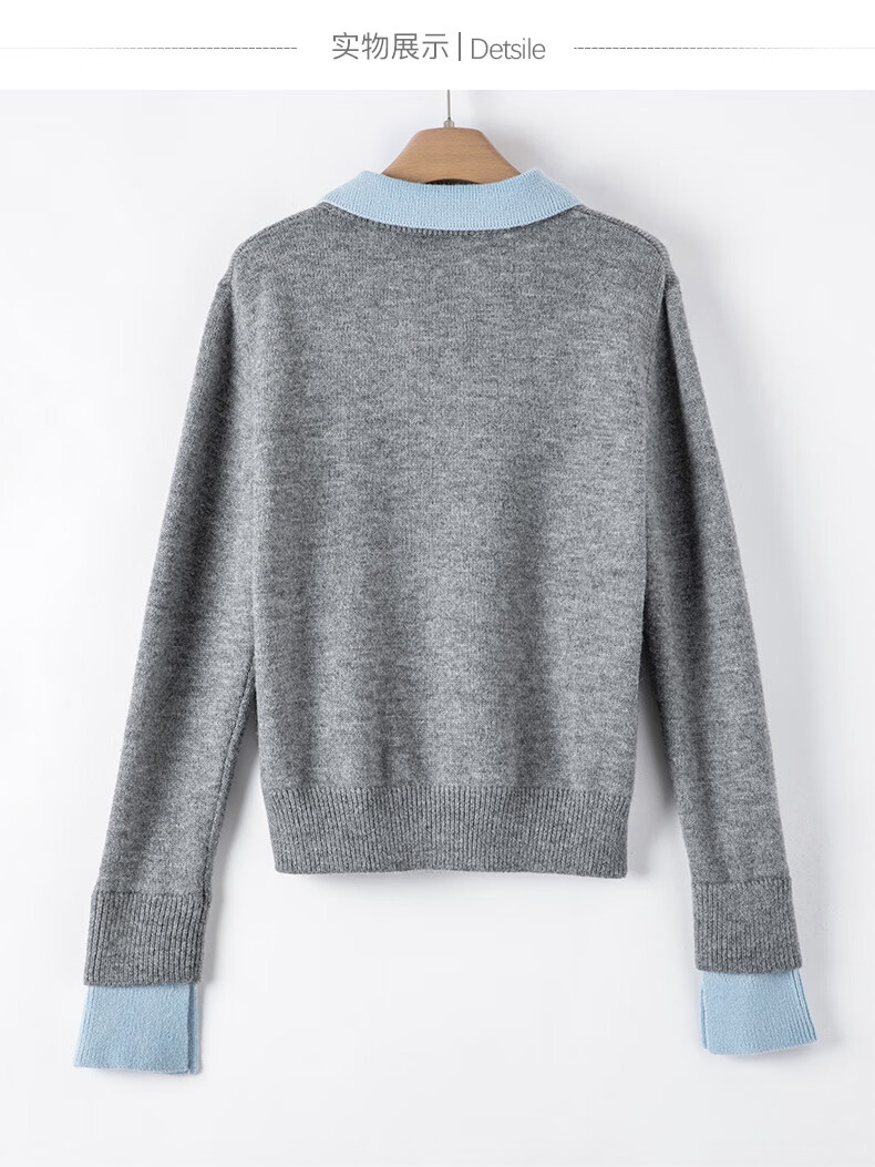 晚白【新品】2026春款翻领气质假两件毛衣简洁大方百搭宽松针织衫女 灰色 M