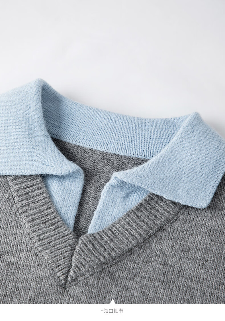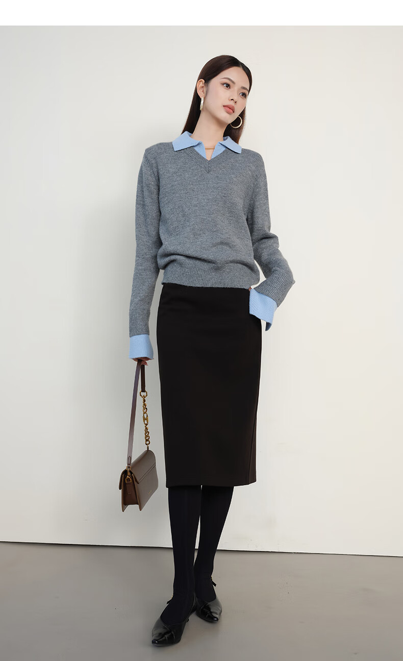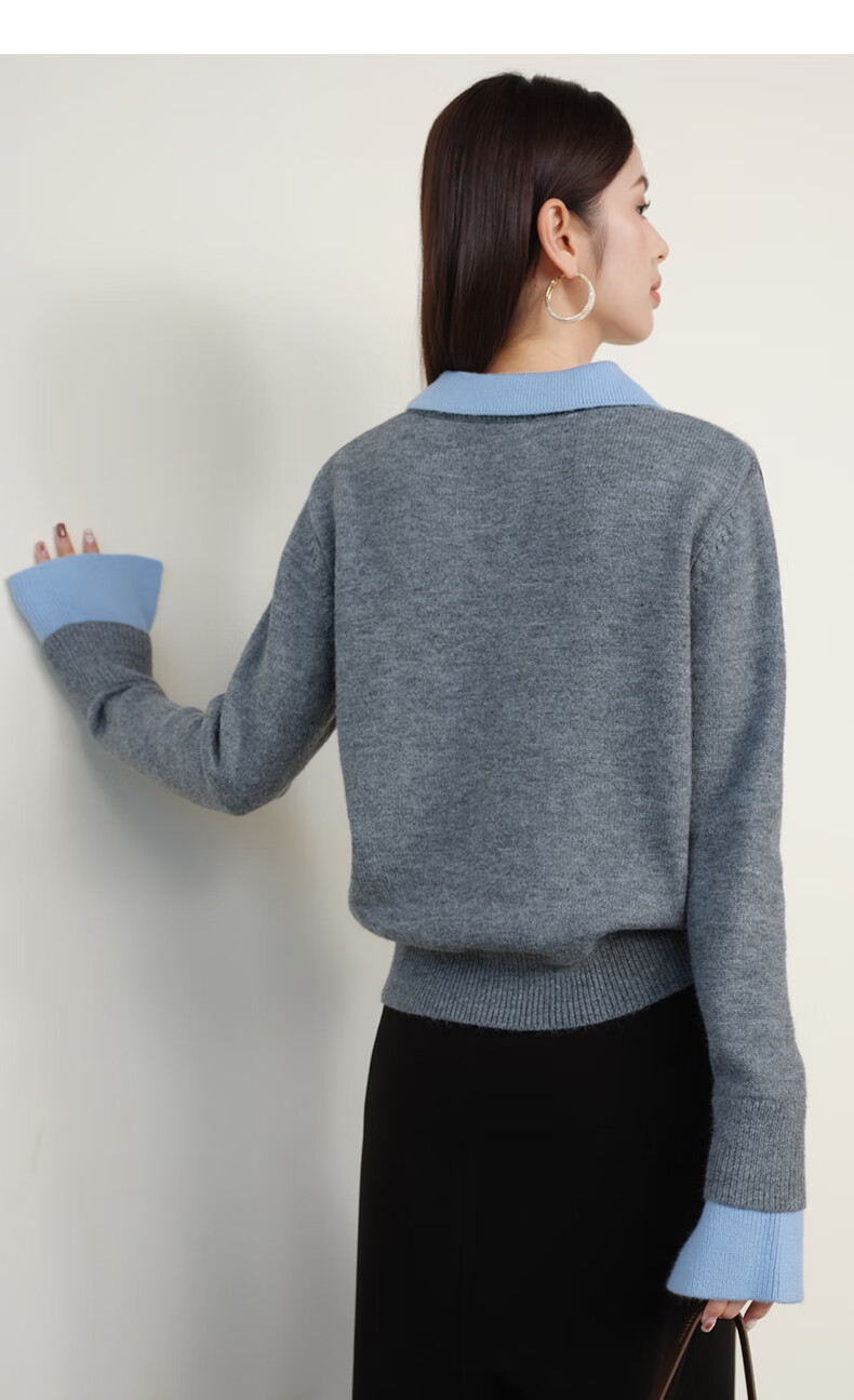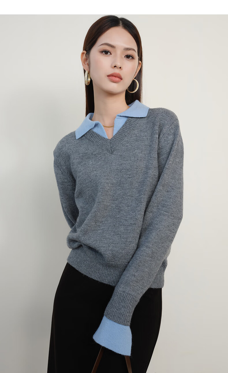 晚白【新品】2026春款翻领气质假两件毛衣简洁大方百搭宽松针织衫女 灰色 M