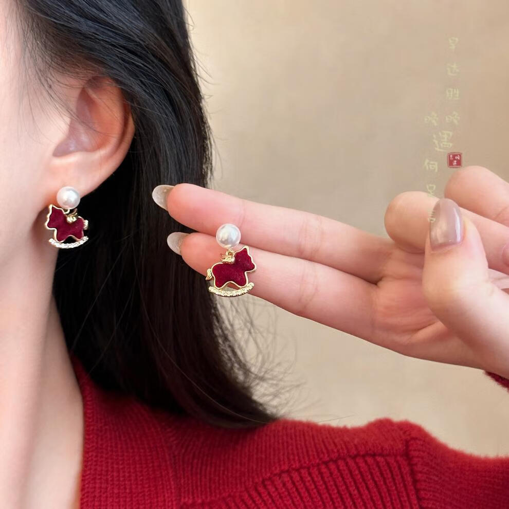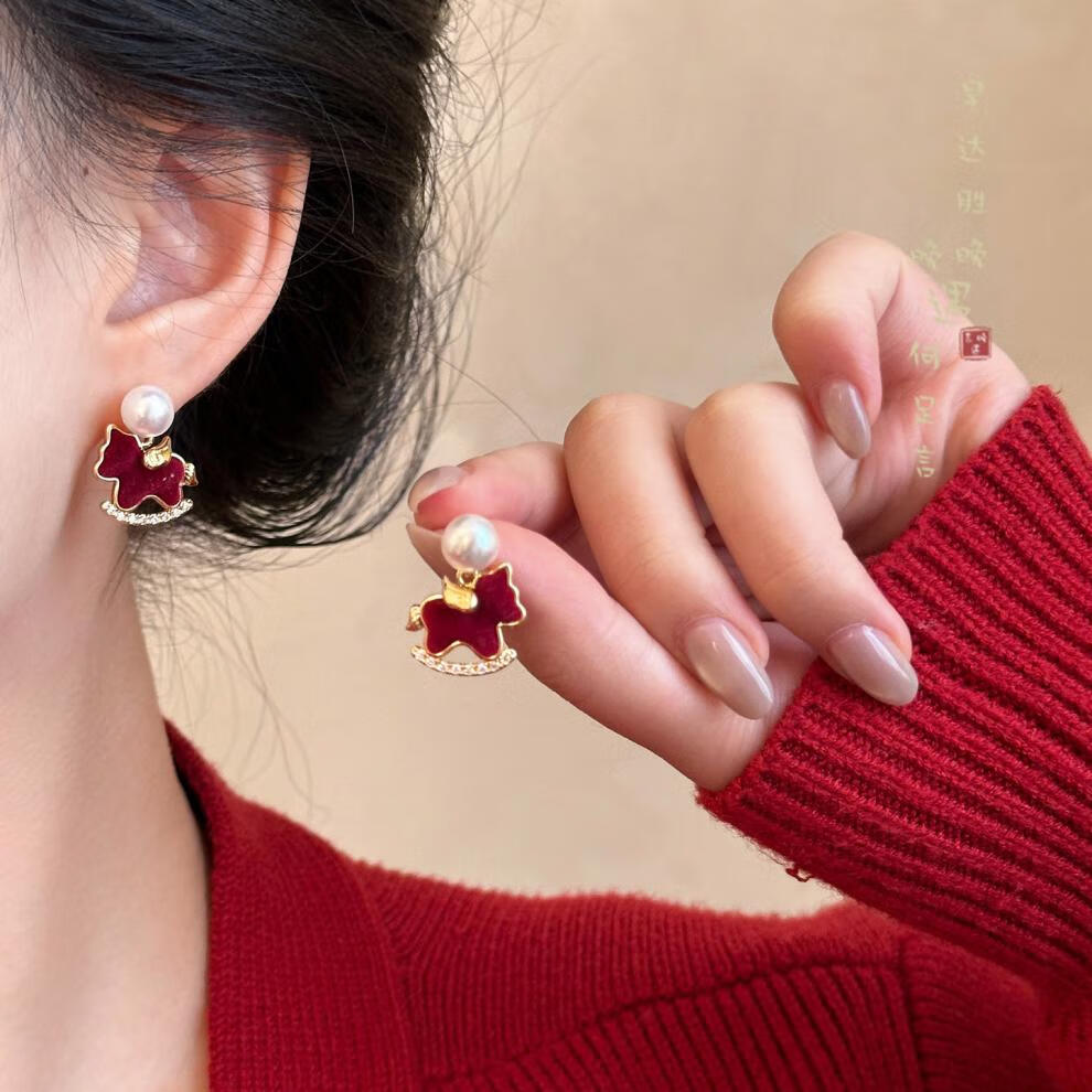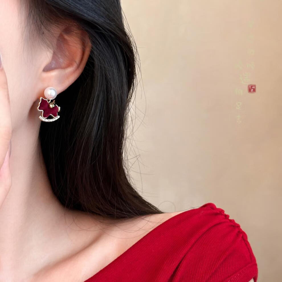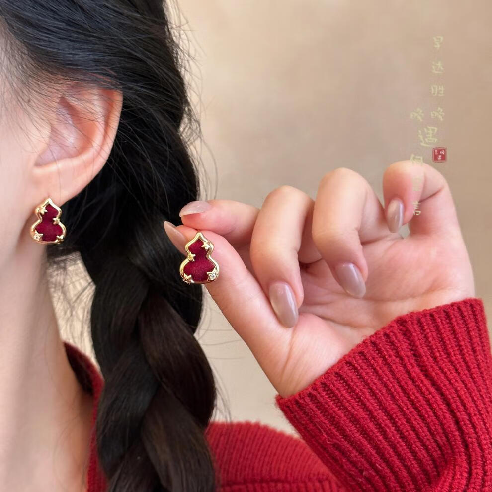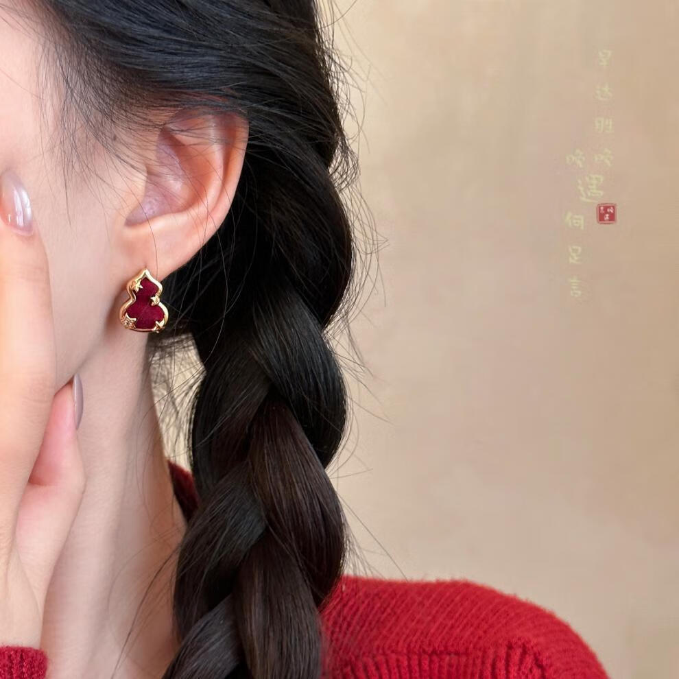 花饰庄园红色丝绒葫芦小马耳钉女秋冬轻奢感气质耳环小众独特漂亮耳饰 红色丝绒葫芦小马