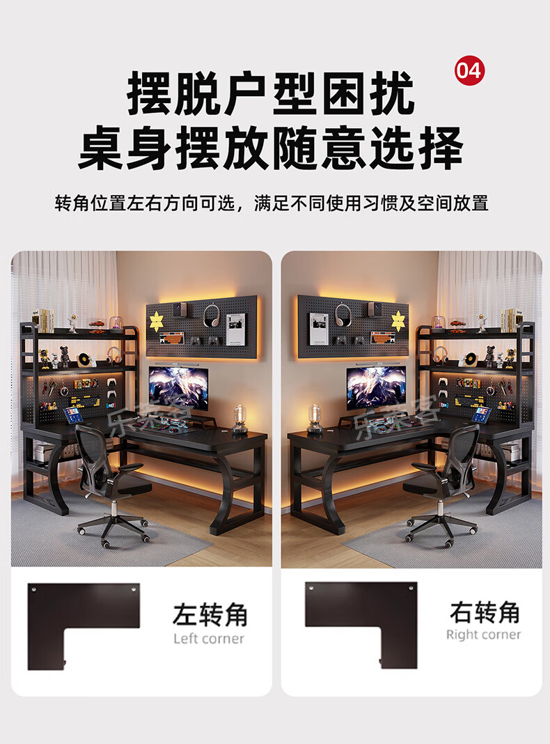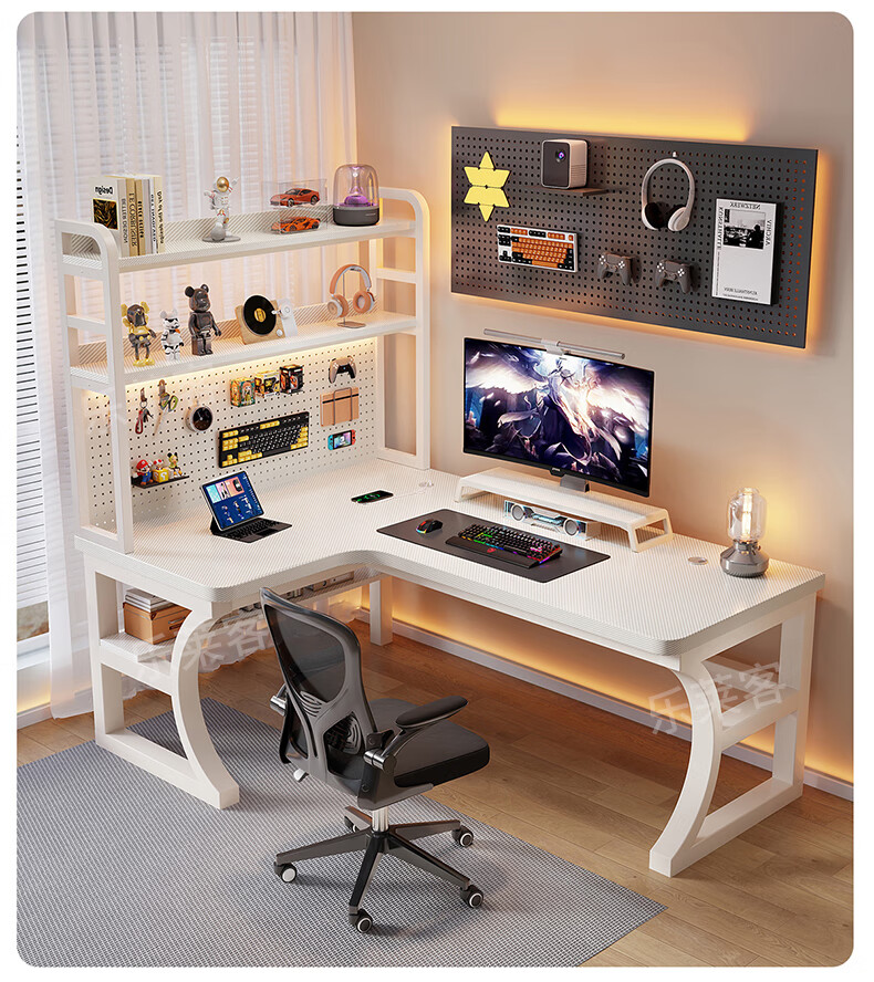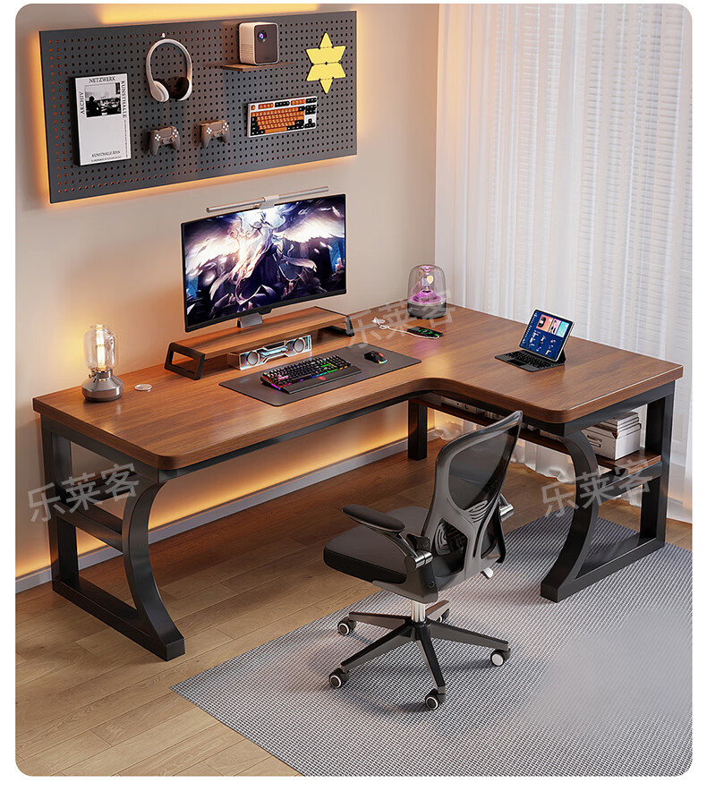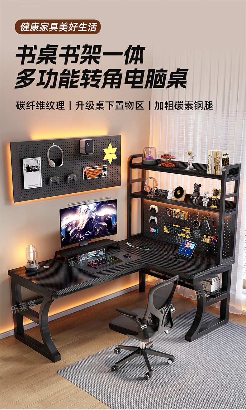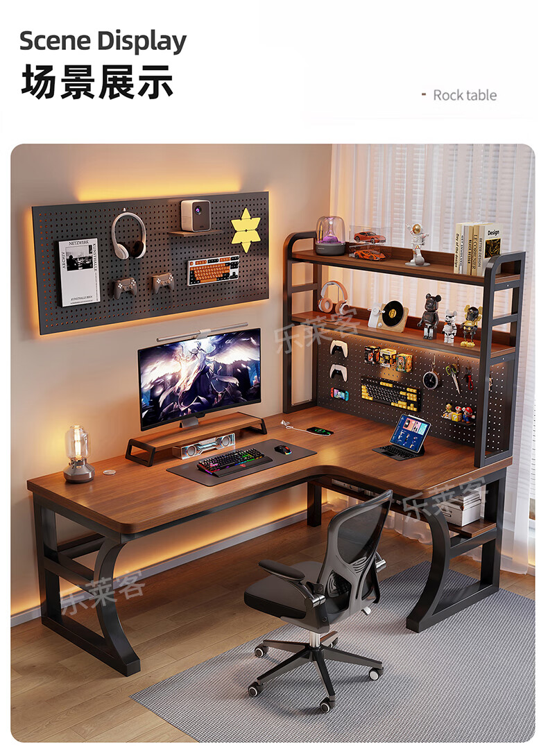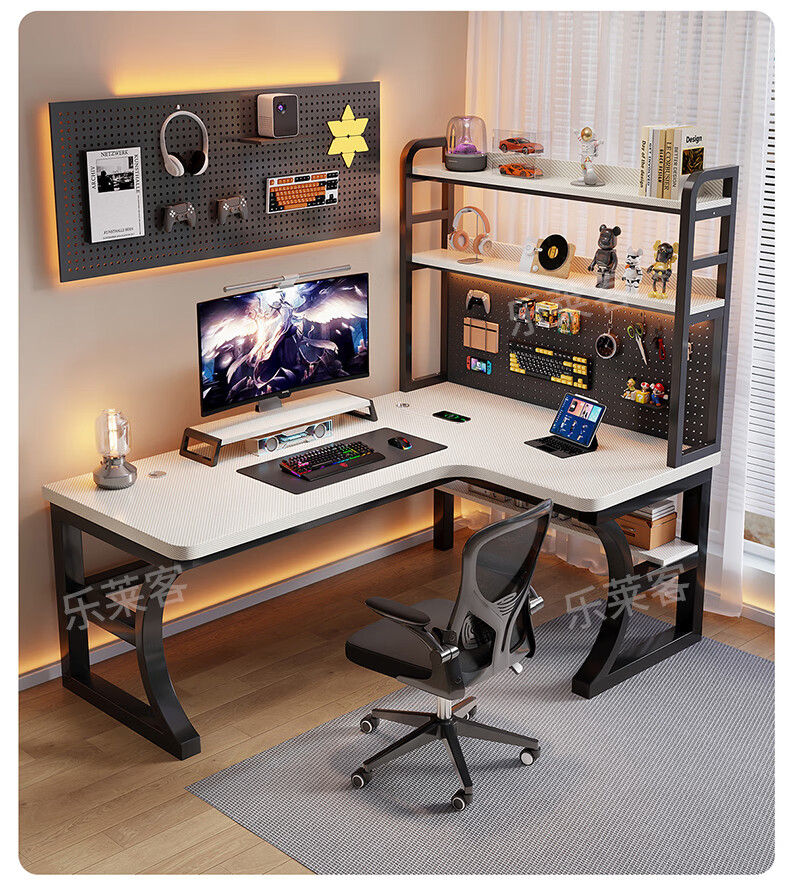 乐莱客实木转角电脑桌台式书桌书架一体双人电竞桌拐角学习办公桌 25mm实木桌面+洞洞板书架【胡桃色+白架】左转 140*80*74cm