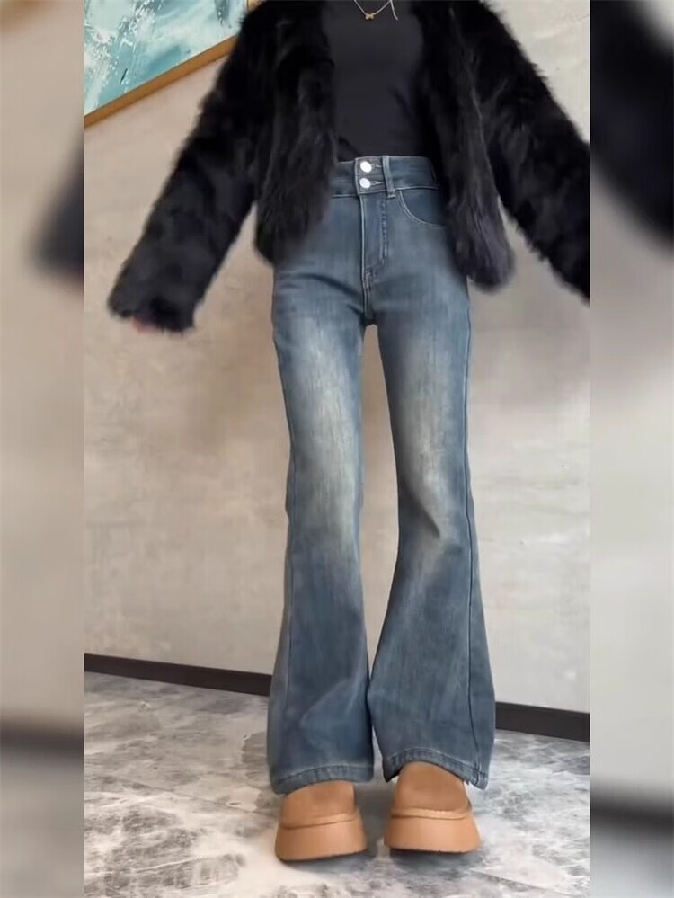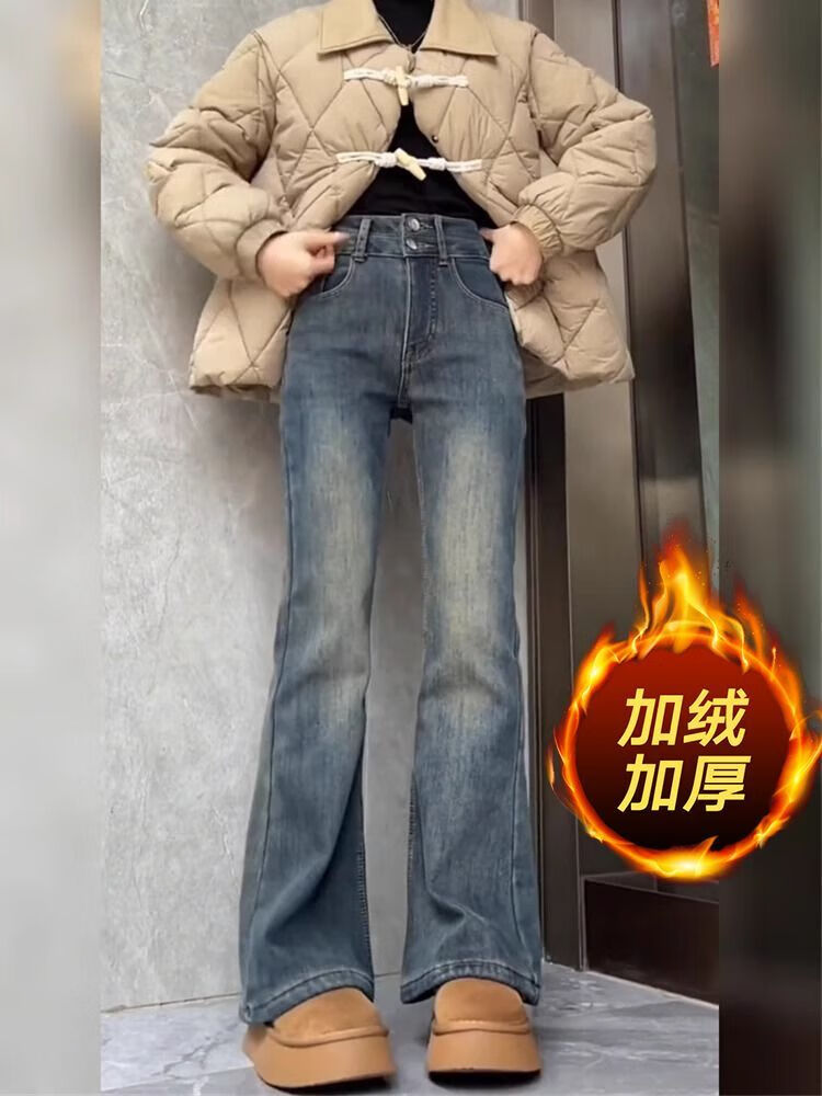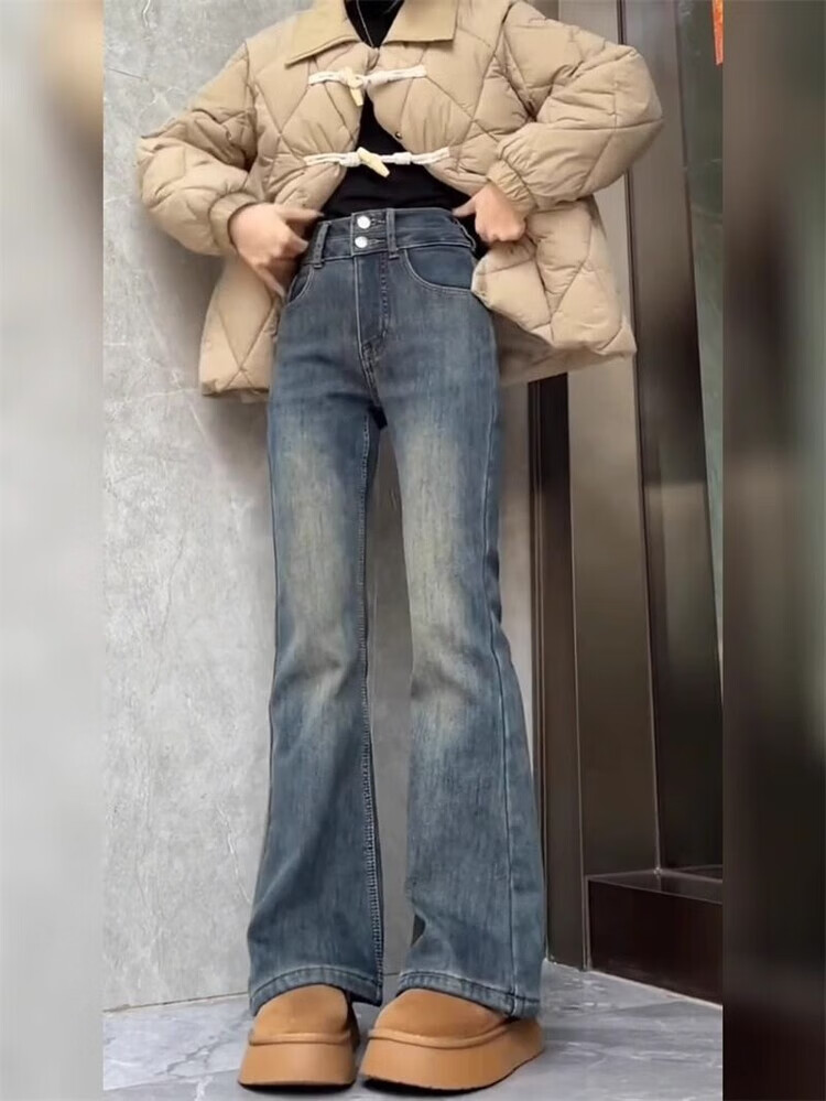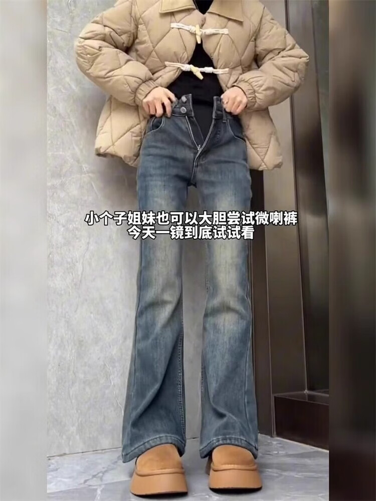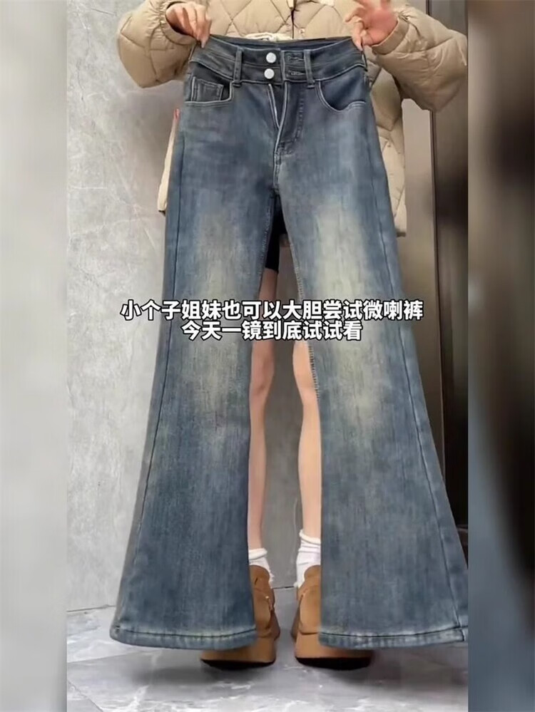 新塘加绒水泥灰微喇阔腿牛仔裤女小个子双扣弹力高腰显瘦喇叭裤冬 水泥灰-九分 单裤不加绒 XS (75-88斤)