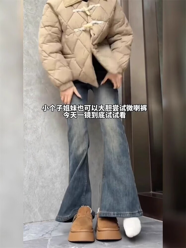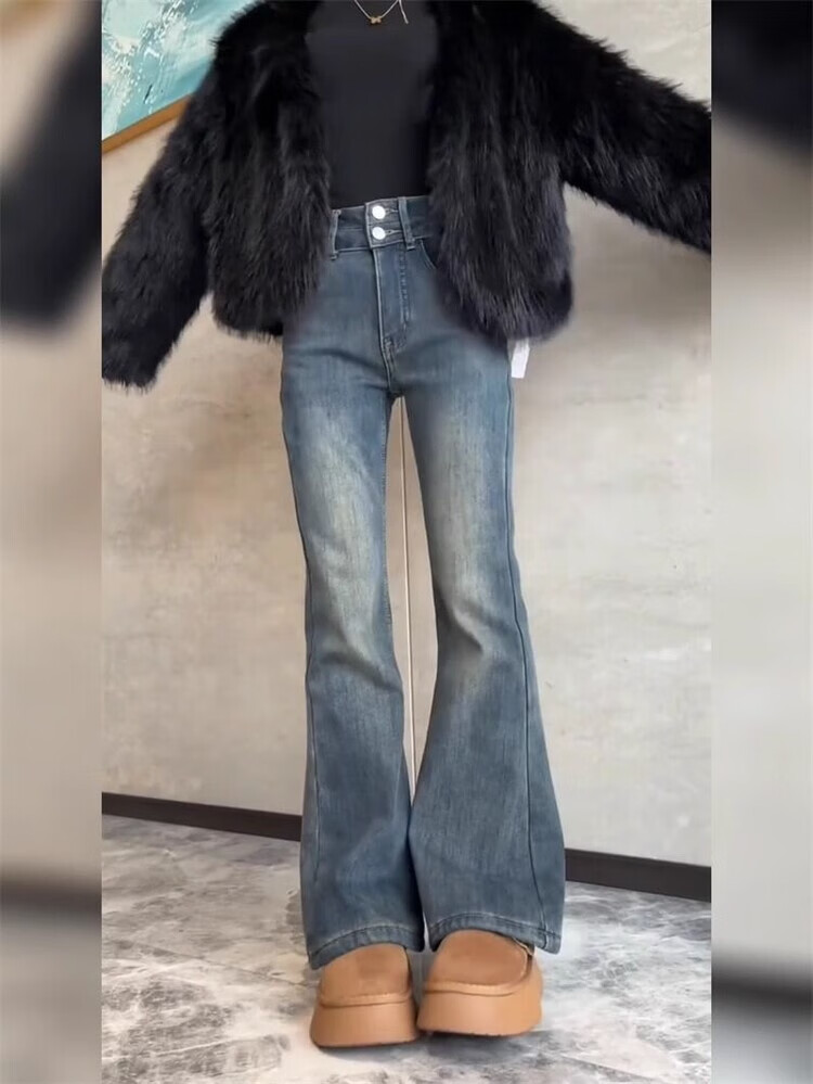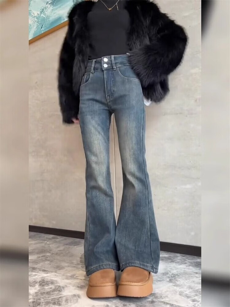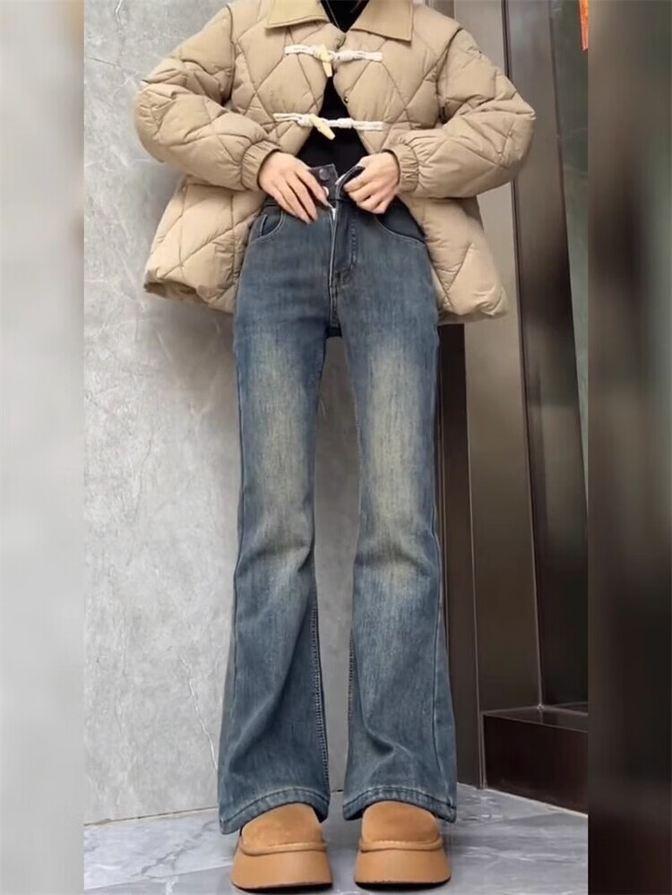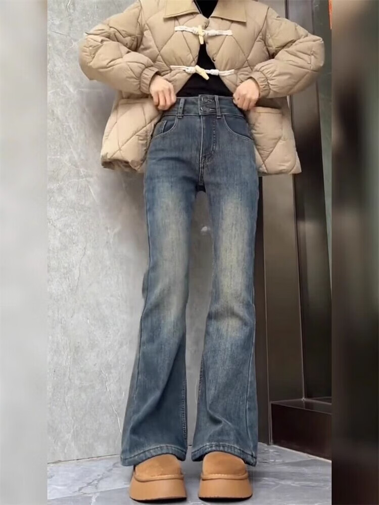 新塘加绒水泥灰微喇阔腿牛仔裤女小个子双扣弹力高腰显瘦喇叭裤冬 水泥灰-九分 单裤不加绒 XS (75-88斤)