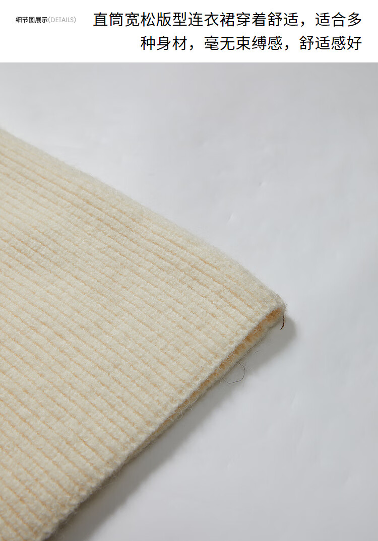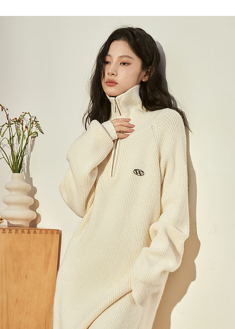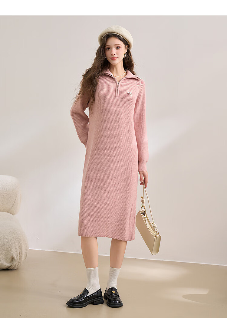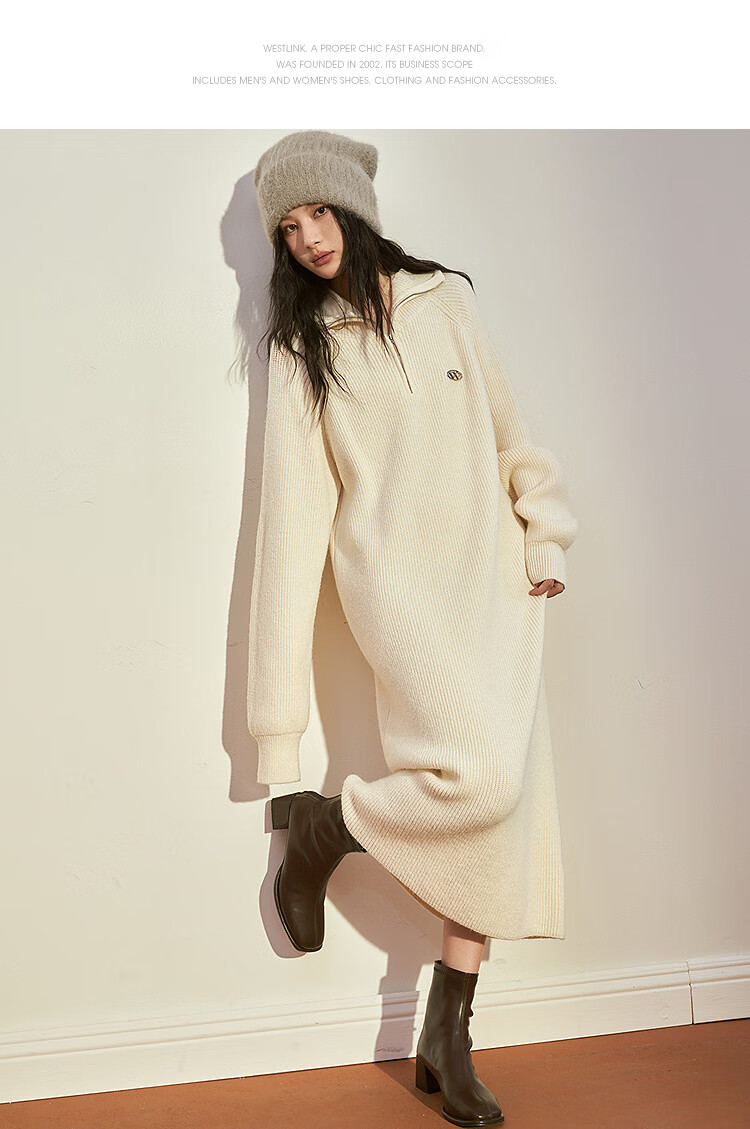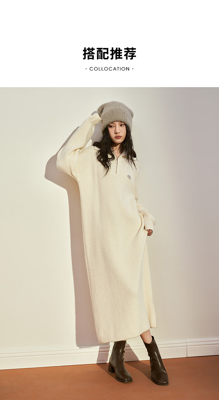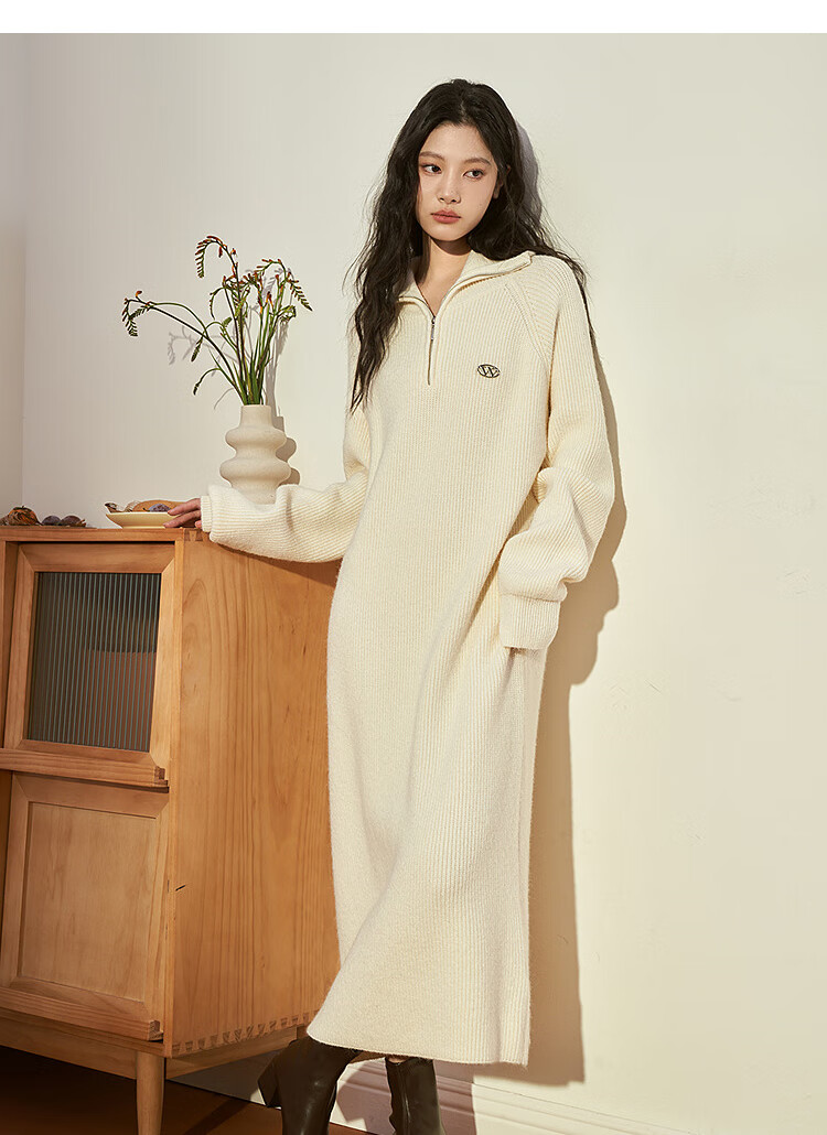 西遇法式长袖针织连衣裙女2025年春冬新款拉链设计感中长款打底裙 杏色 S