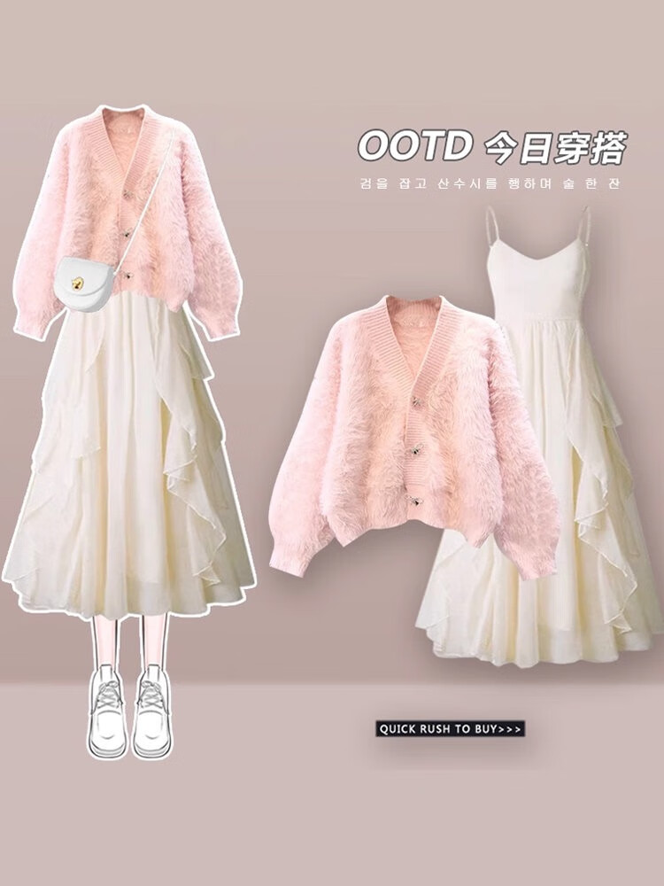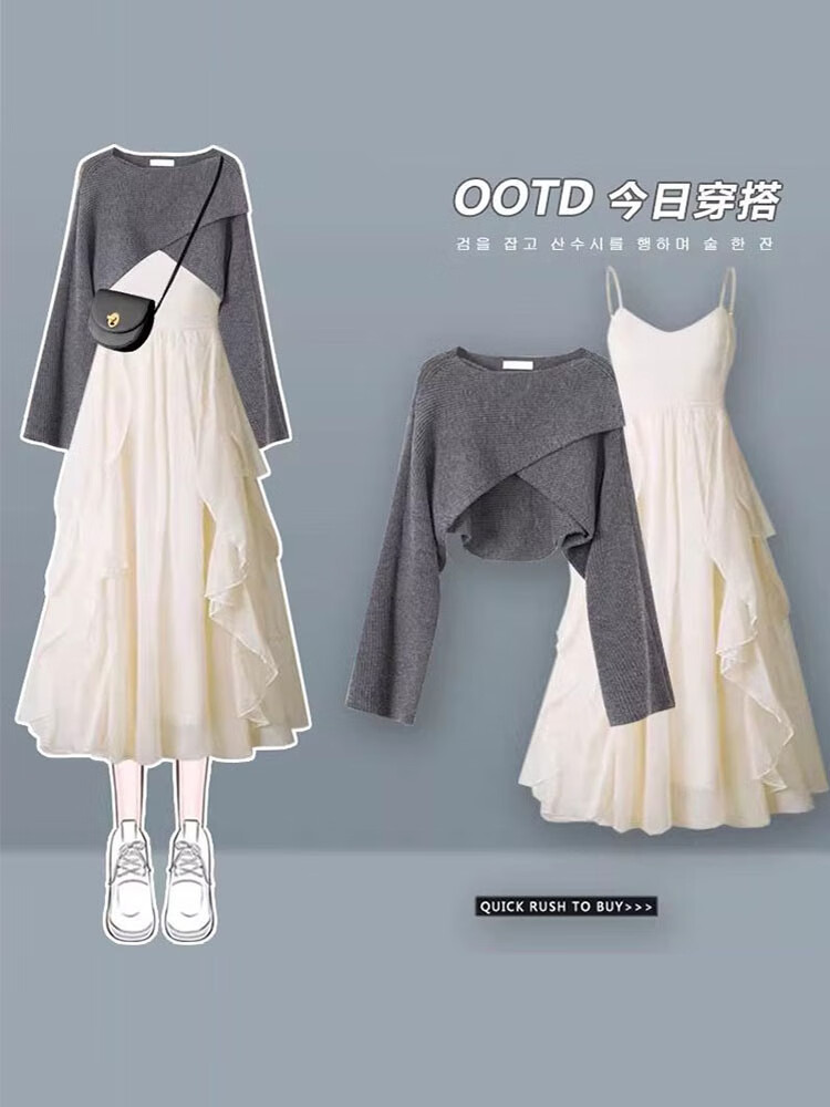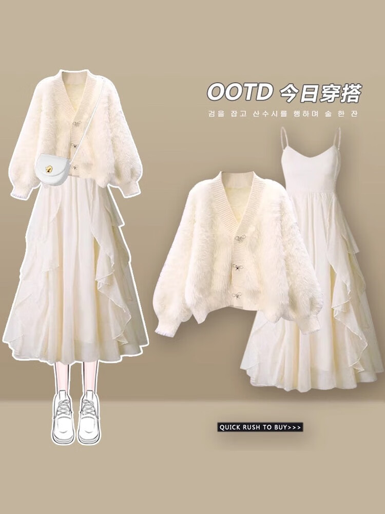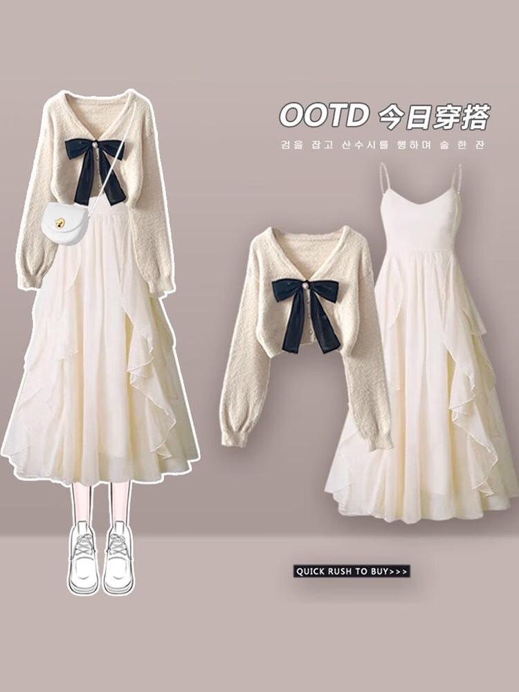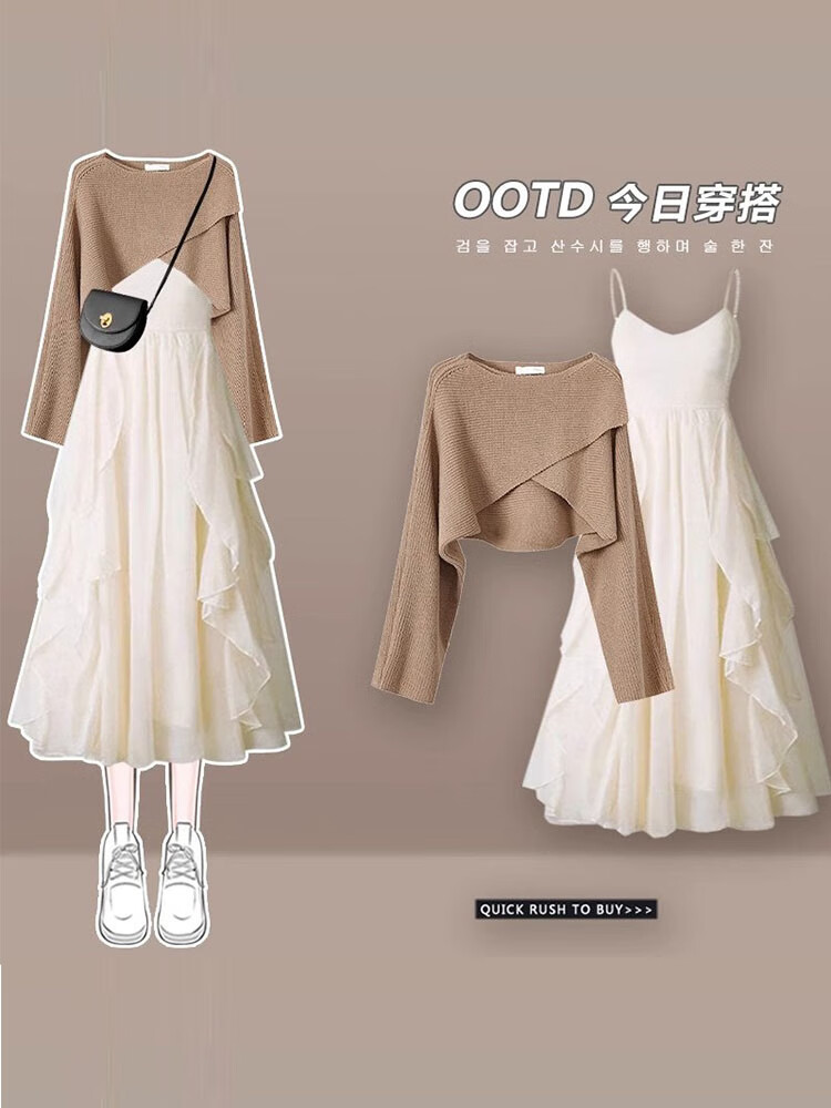 雪妃蓝琪秋冬连衣裙女装2025冬季新款小香风法式针织毛衣吊带裙子穿搭套装 白色毛衣+杏色连衣裙 M 【建议95-120斤】