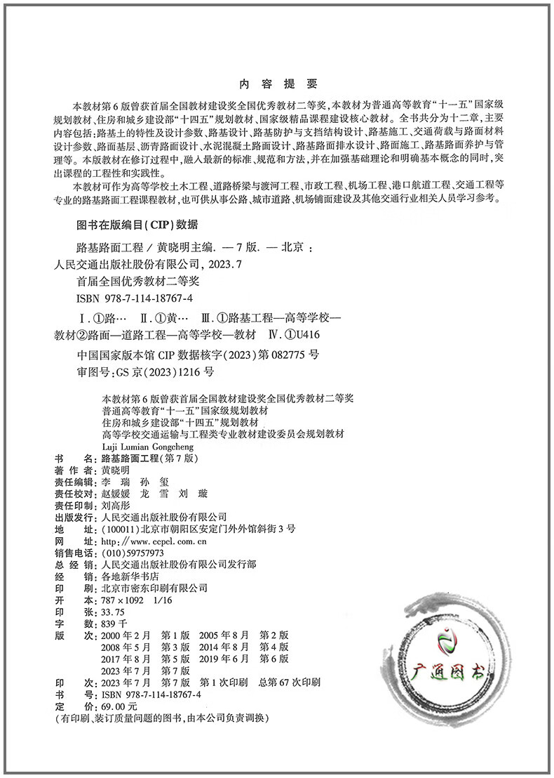 2023年新版 路基路面工程 黄晓明主编 第7版 高等学校交通运输工程类专业规划教材 人民交通出版社 9787114154171 2023年版 路基路面工程(第7版)黄晓明