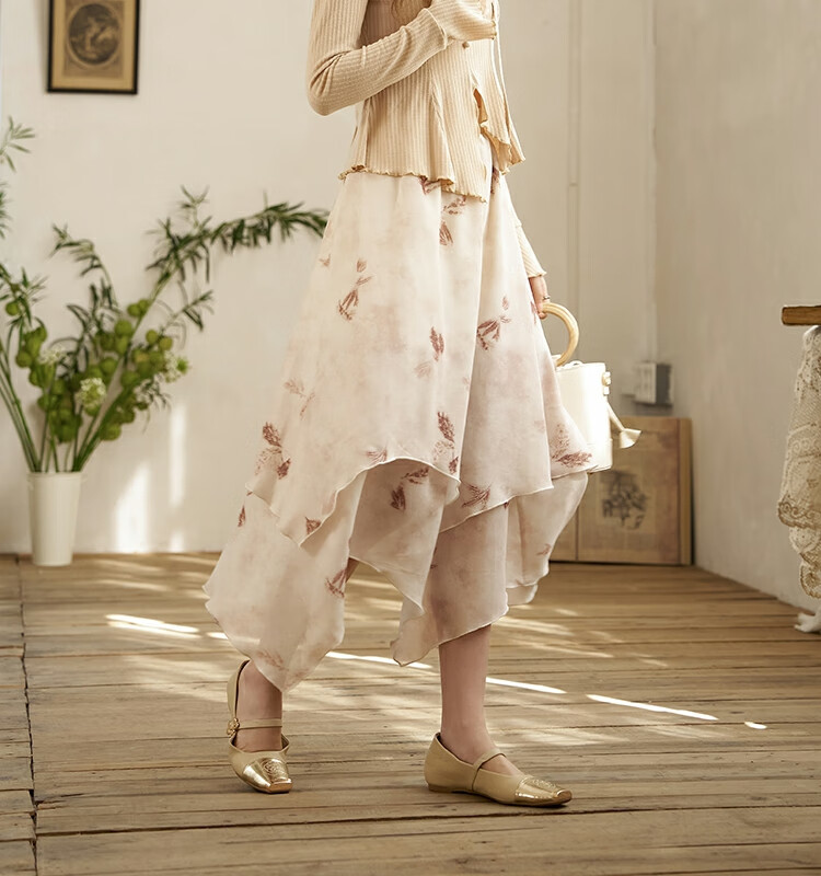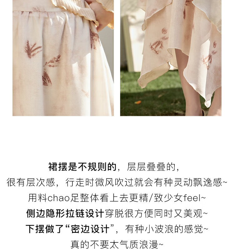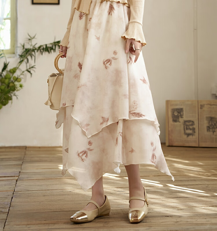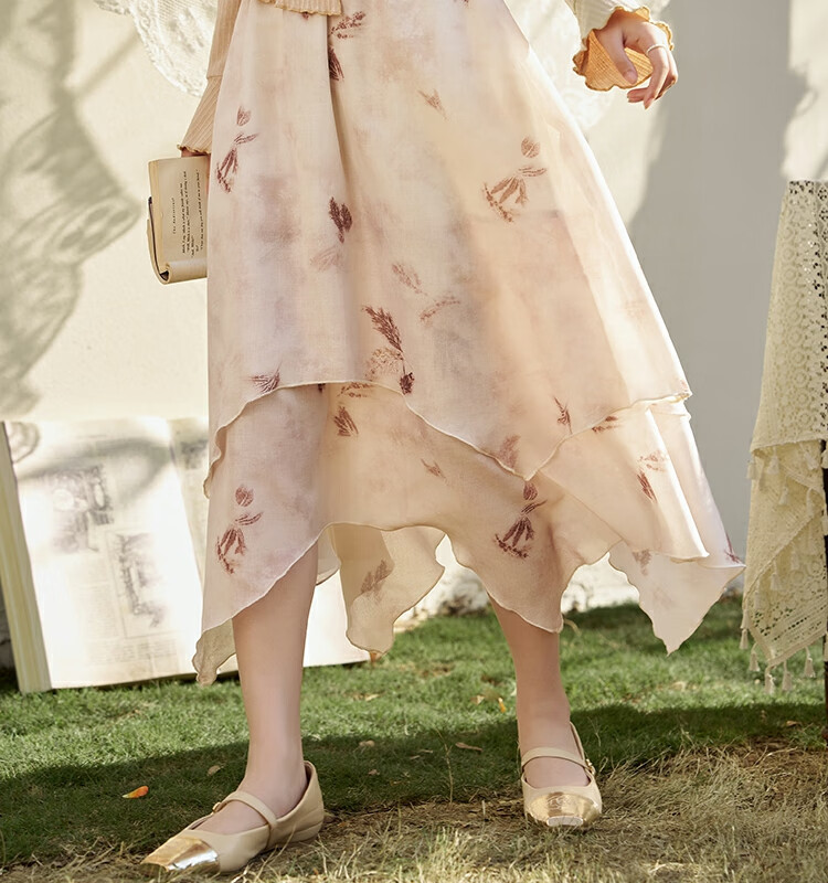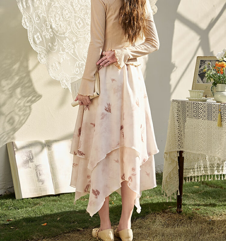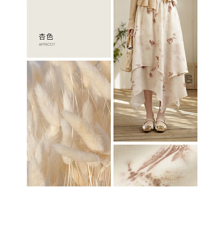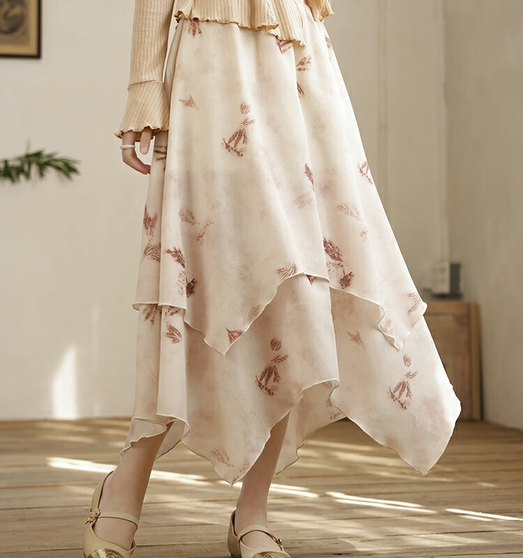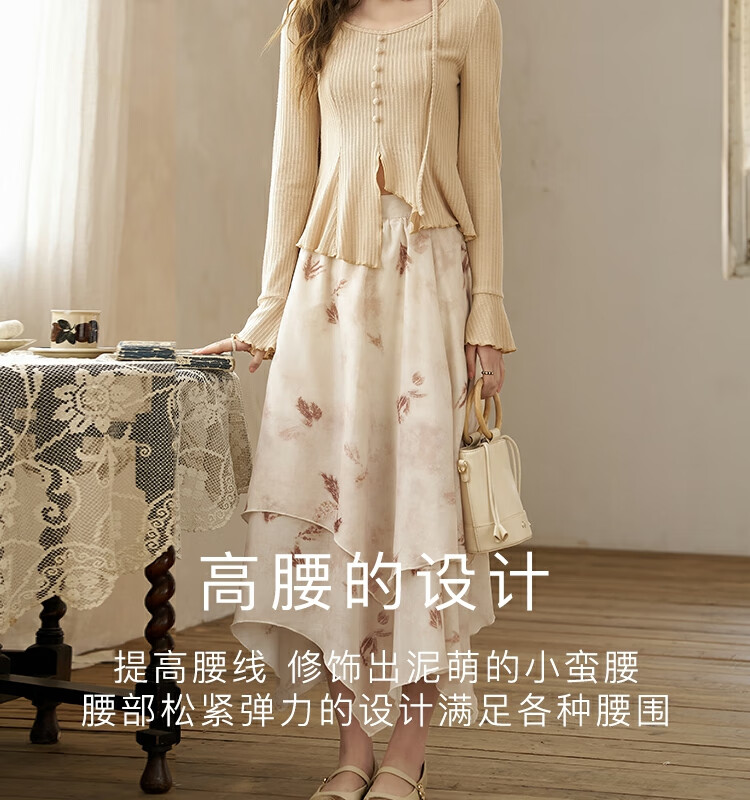 谜秀设计感不规则半身裙女装2025春秋季新款腰显瘦A字裙花长裙 杏色 半身裙 M