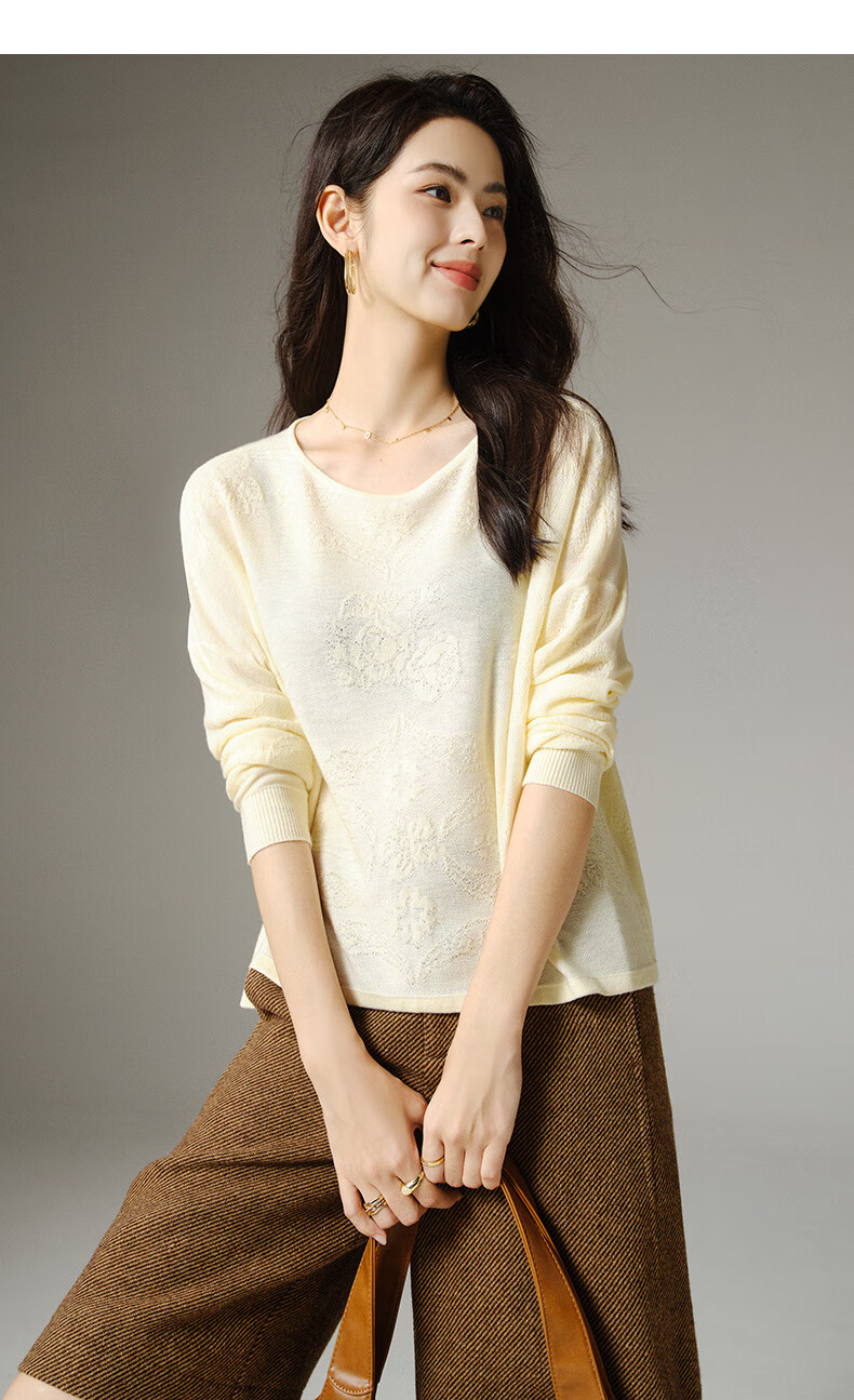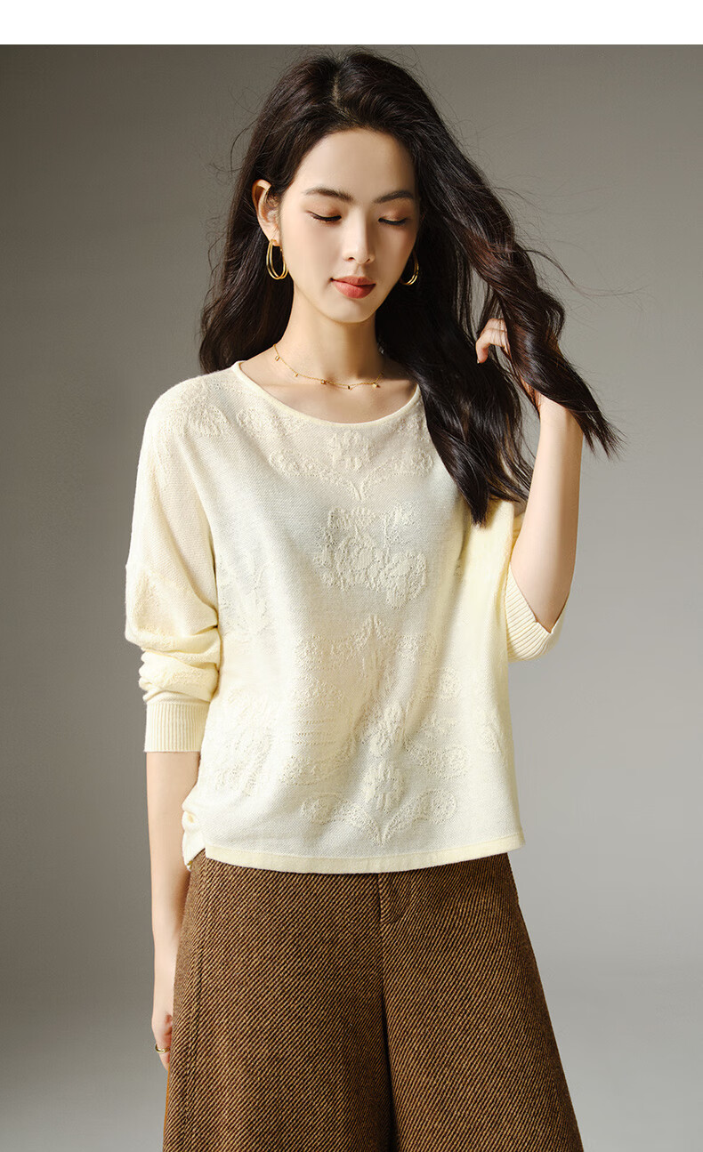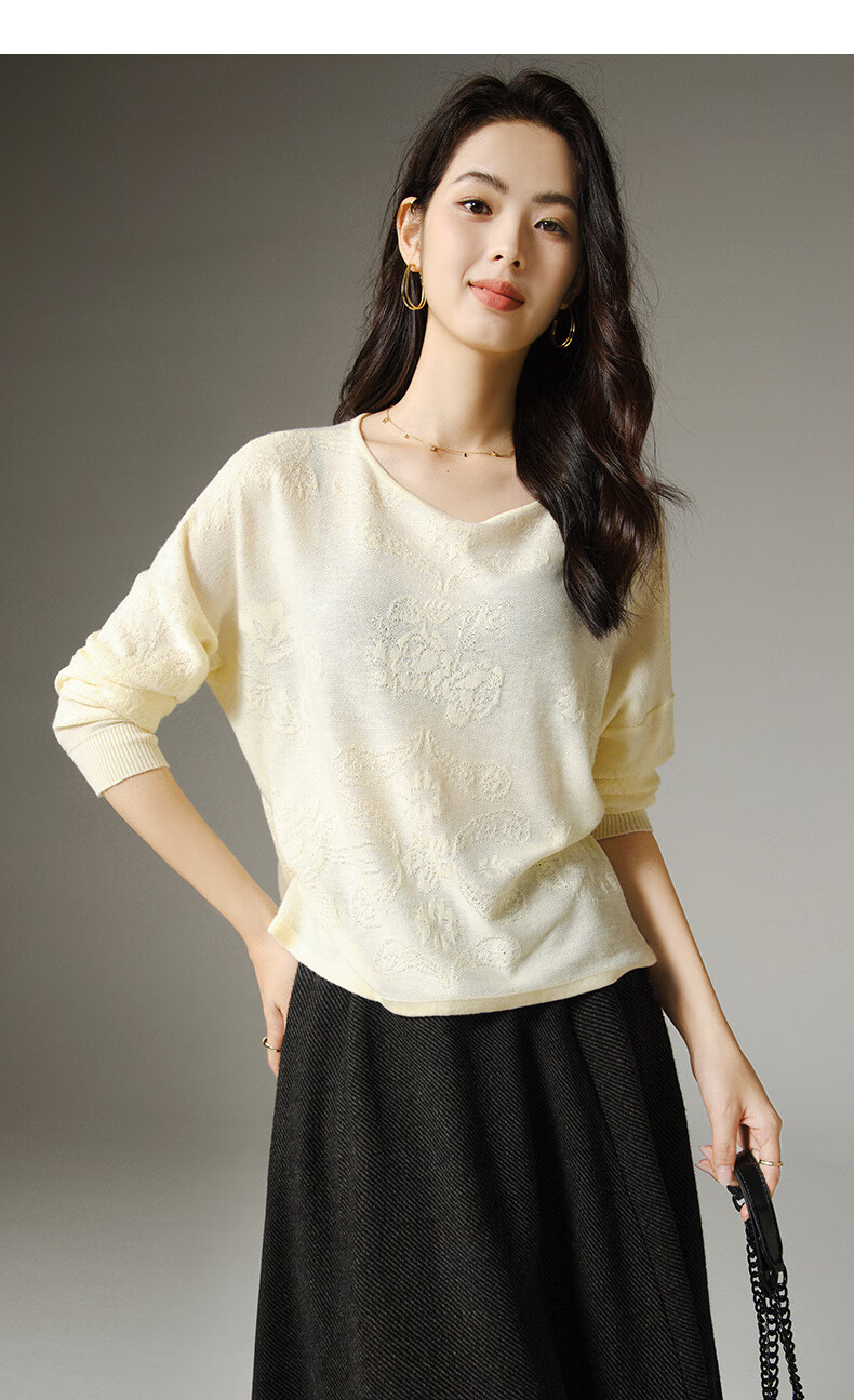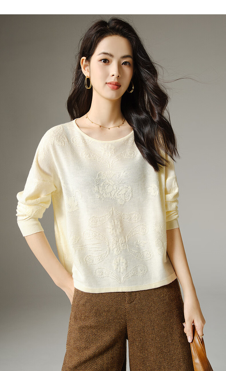 晚白【新品】含绵羊毛百搭针织衫女2026春季气质弹力修身显瘦上衣 米杏色 M
