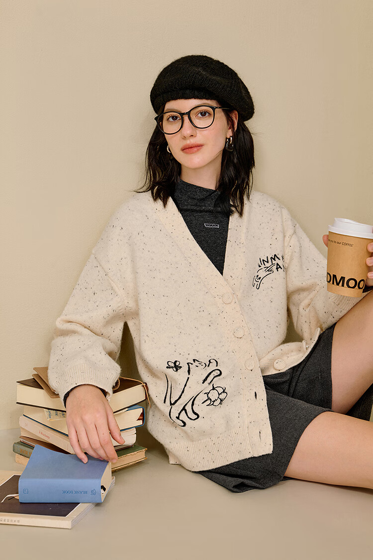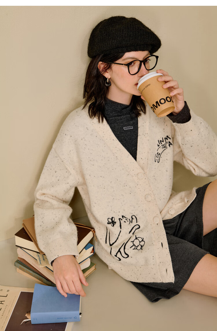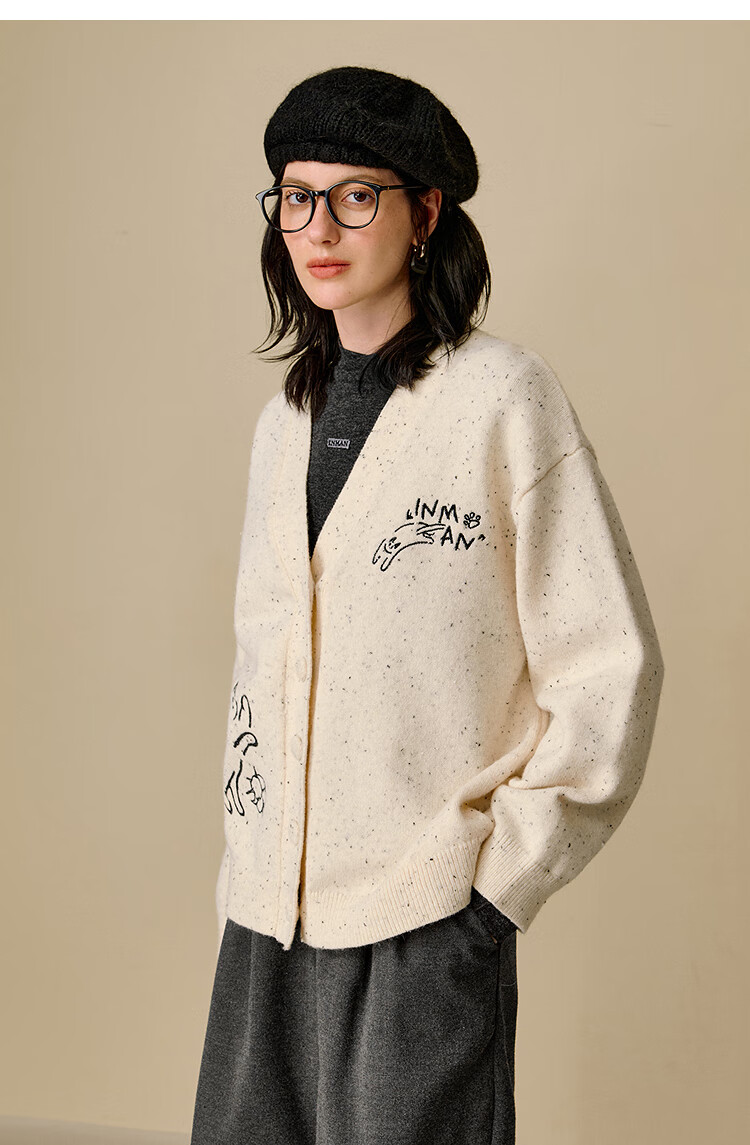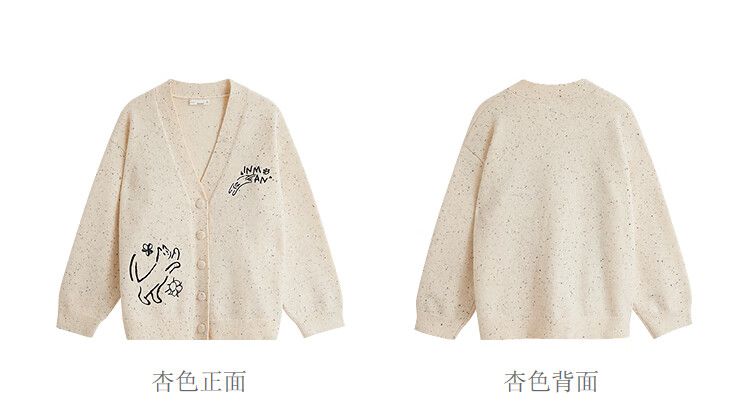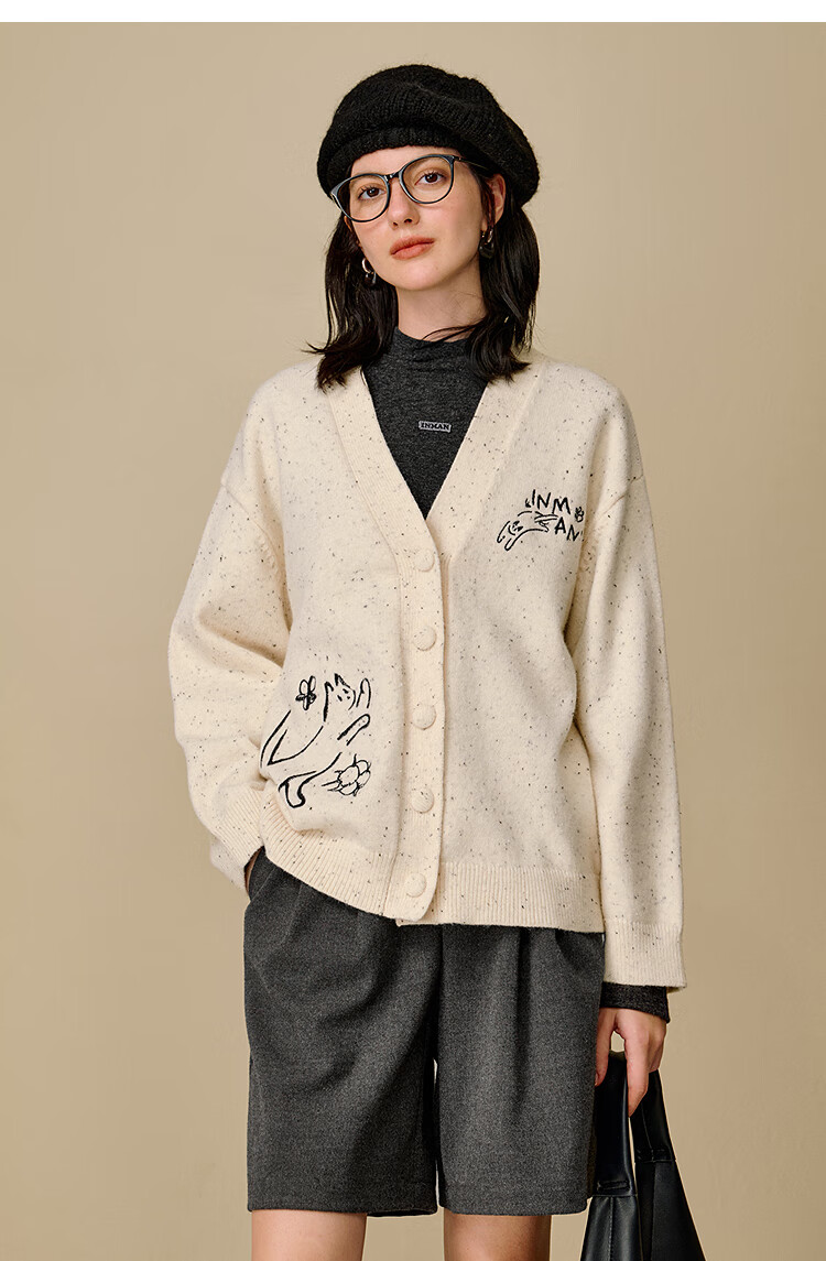 茵曼(INMAN)茵曼彩点纱萌宠刺绣针织开衫2025冬女装新款显瘦毛衣外套 杏色 M