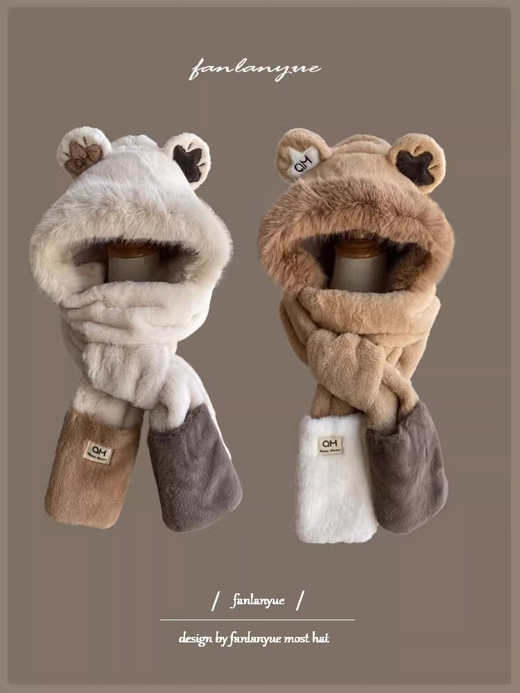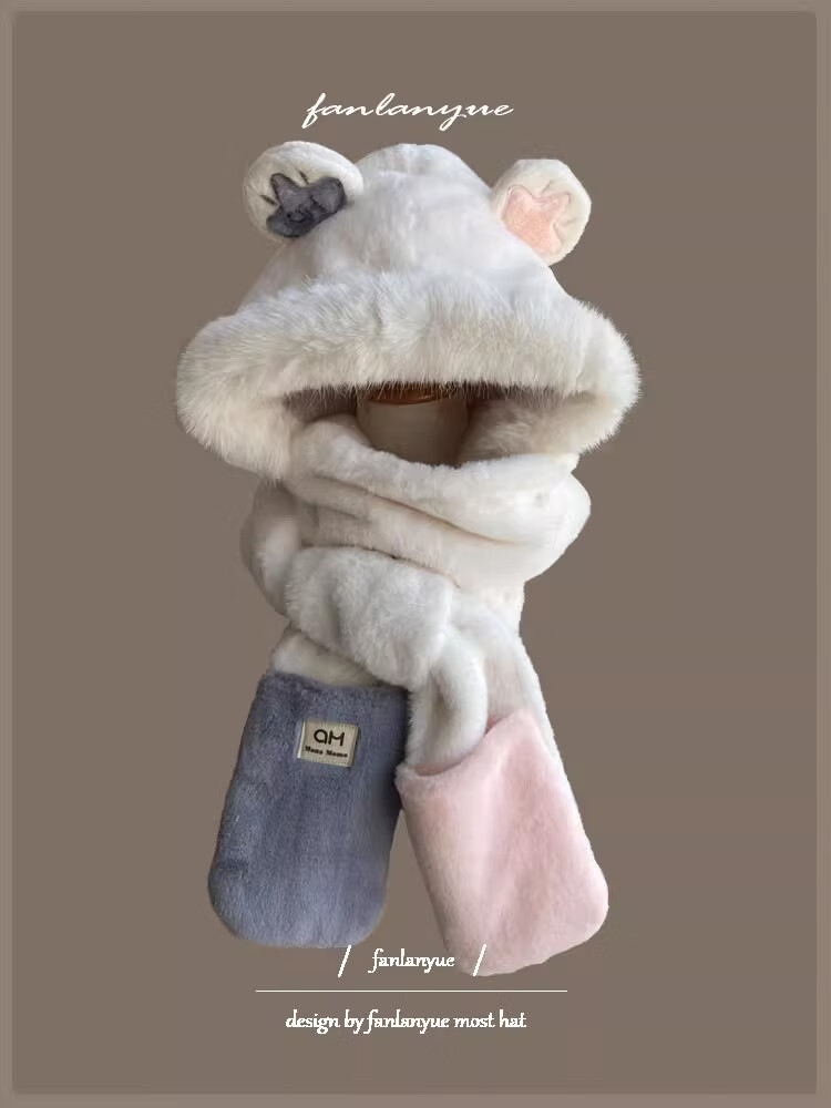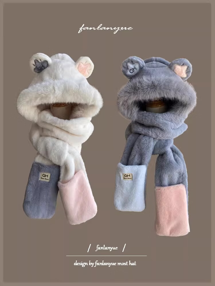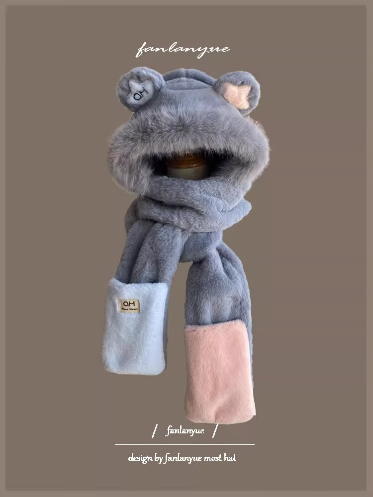 天丝巾画围巾帽子一体女秋冬加绒户外保暖围脖三件套圣诞礼物送女生手套 粉色(三件套) 无规格