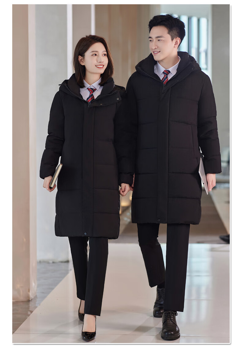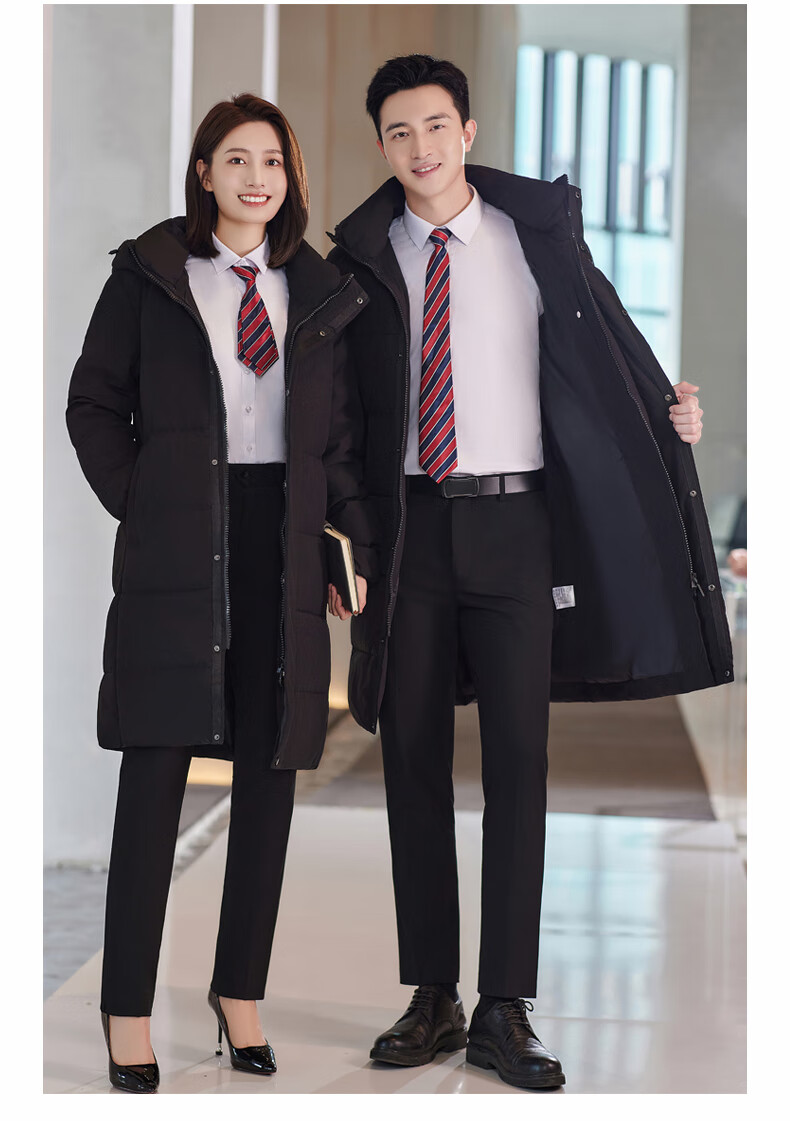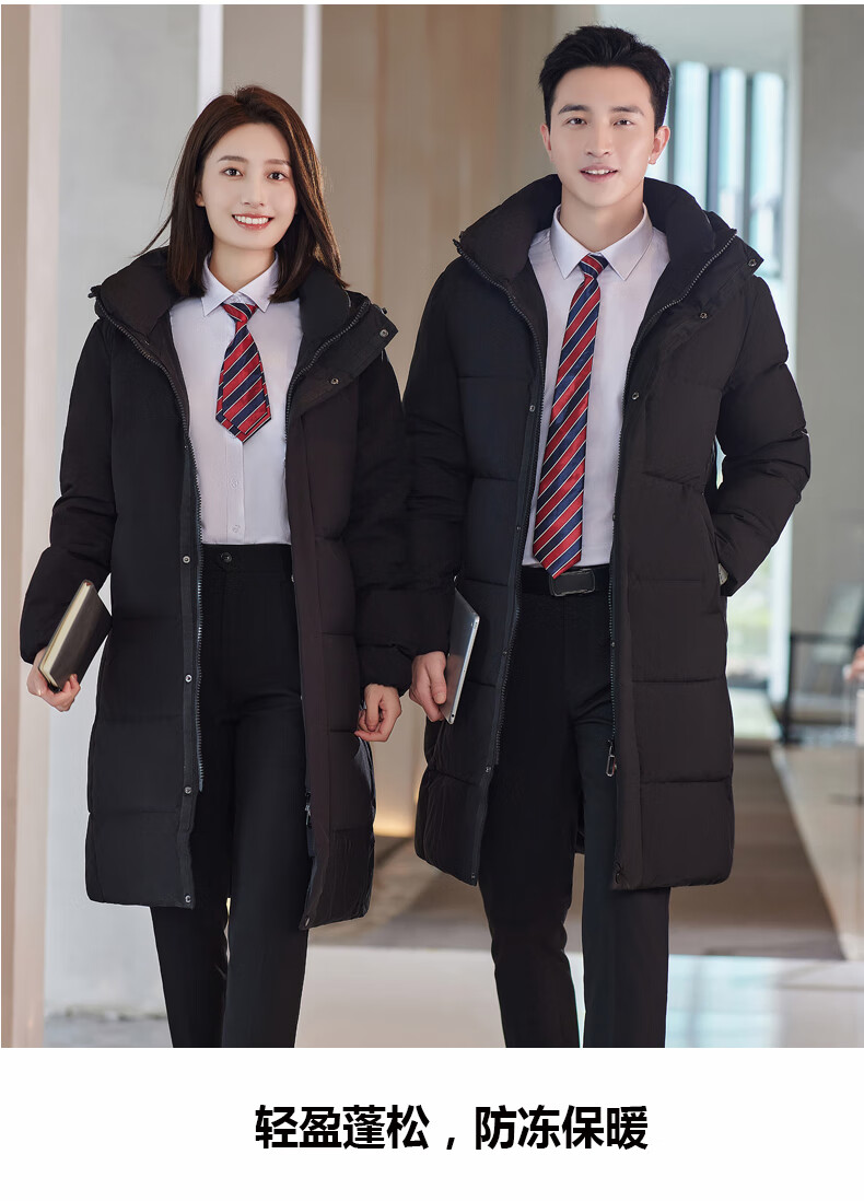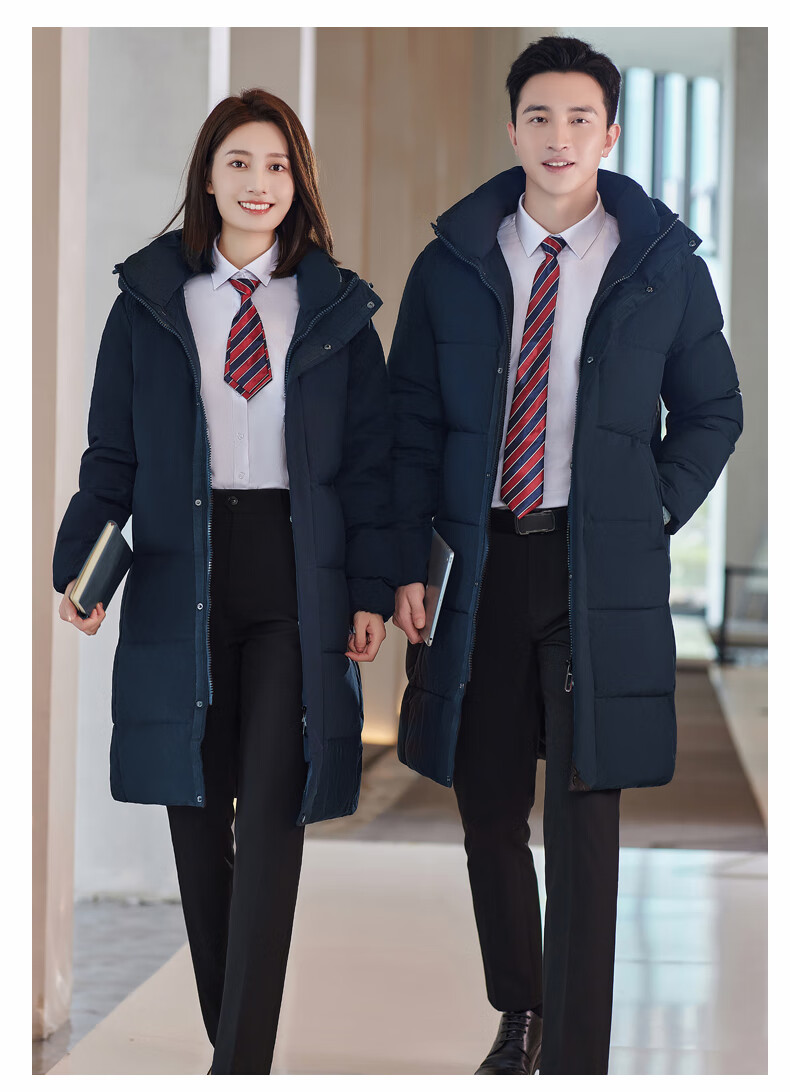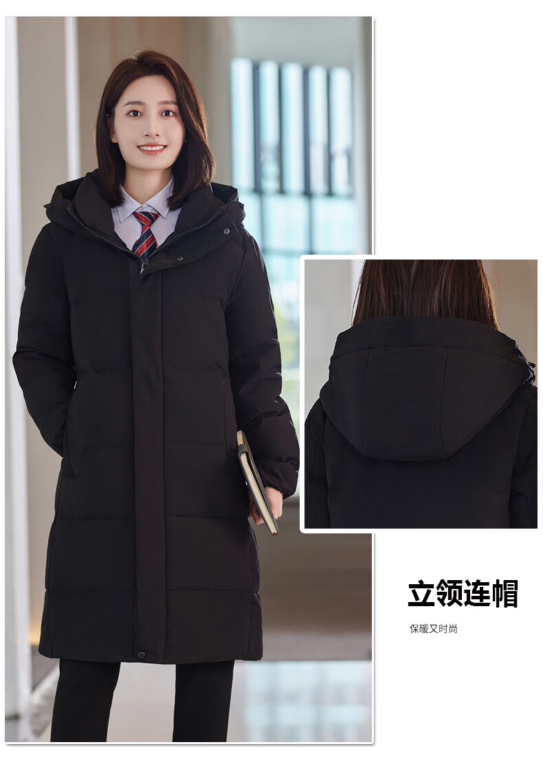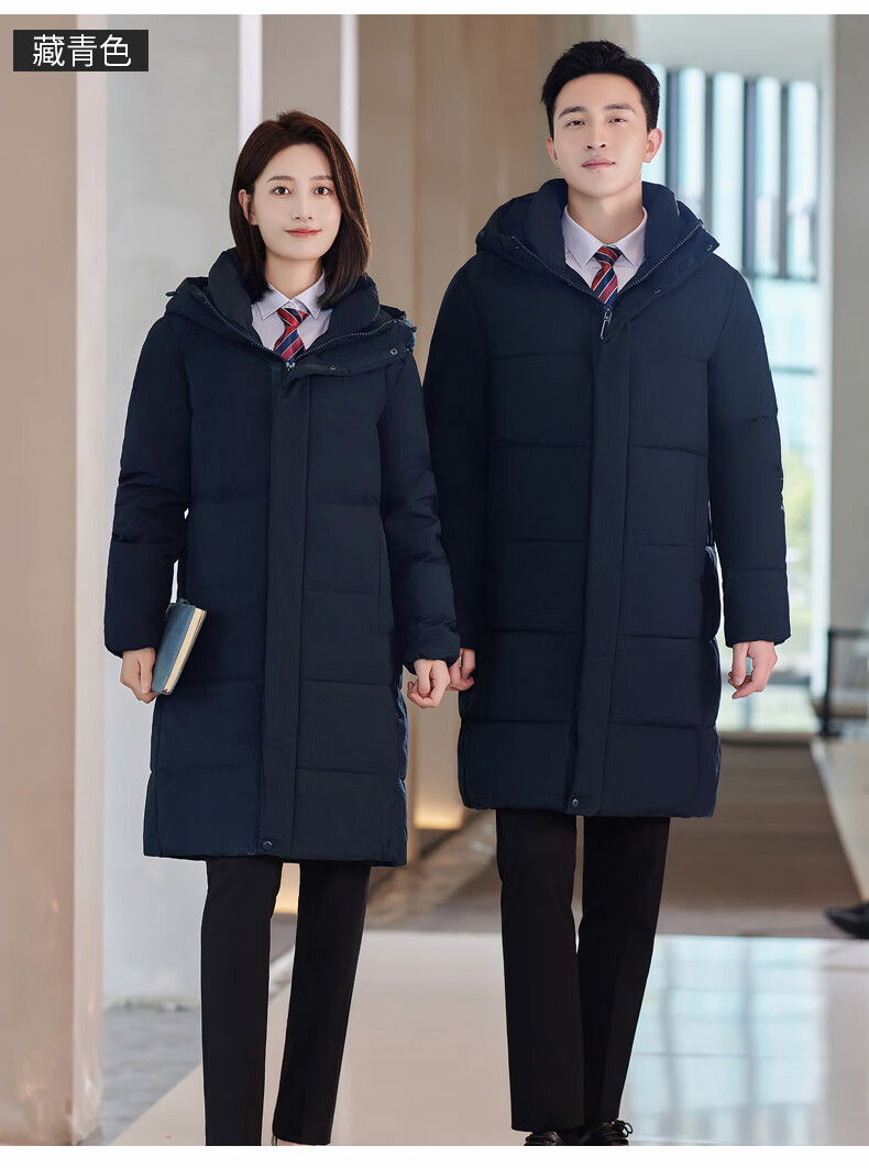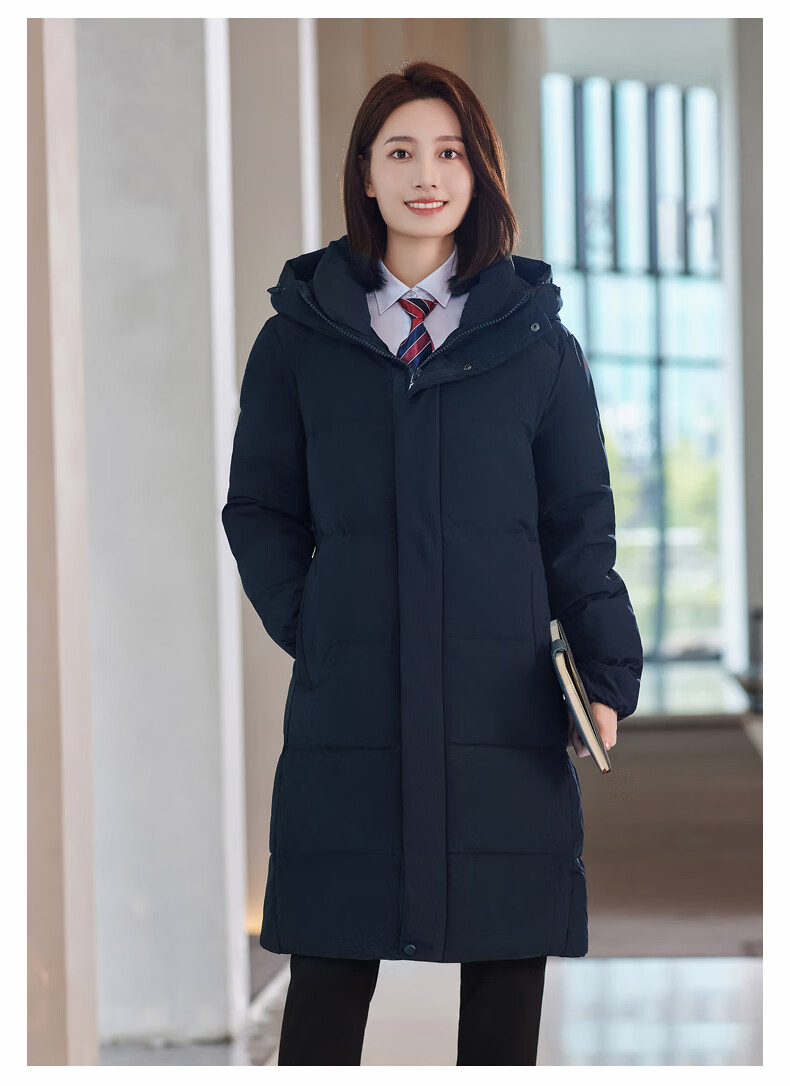 啄木鸟藏青色职业装羽绒服男女冬中长款银行酒店4S店经理工作服logo 黑色白鸭.绒羽绒服【女通码】 可拆卸帽子 S 【建议90-斤】