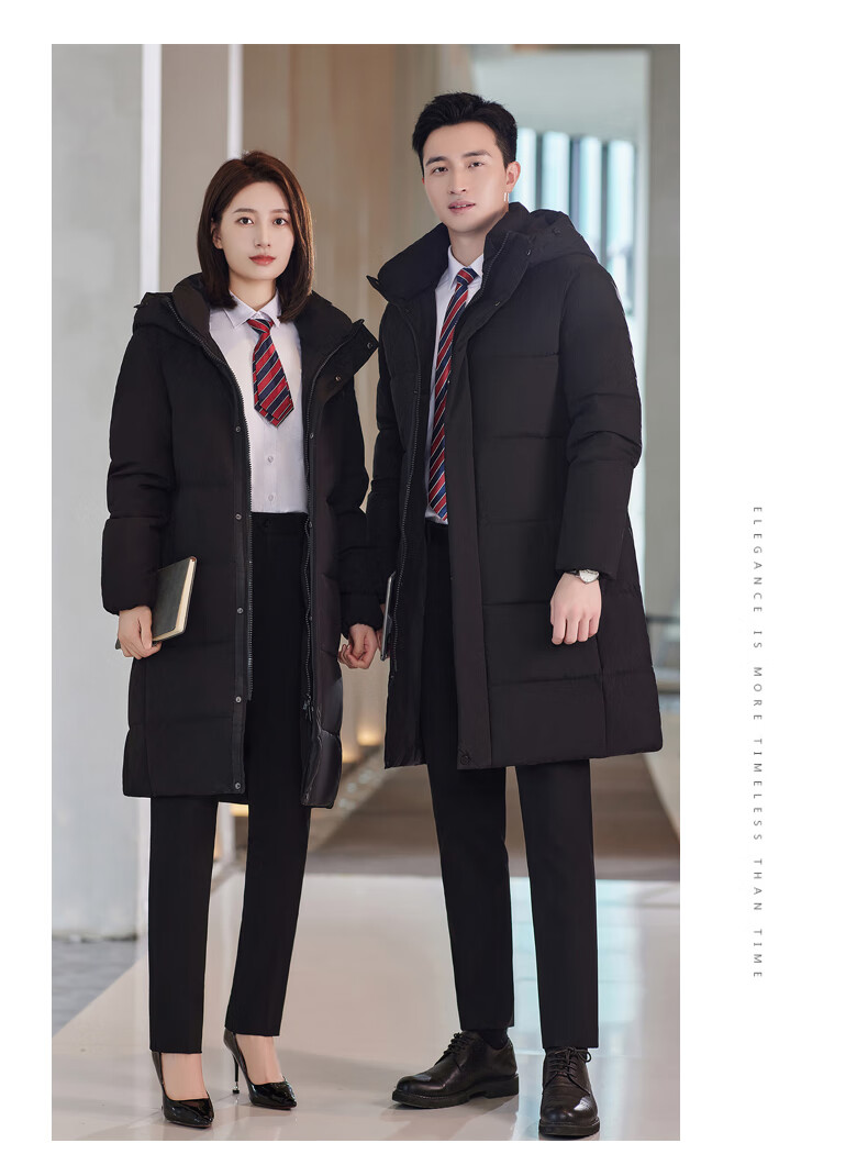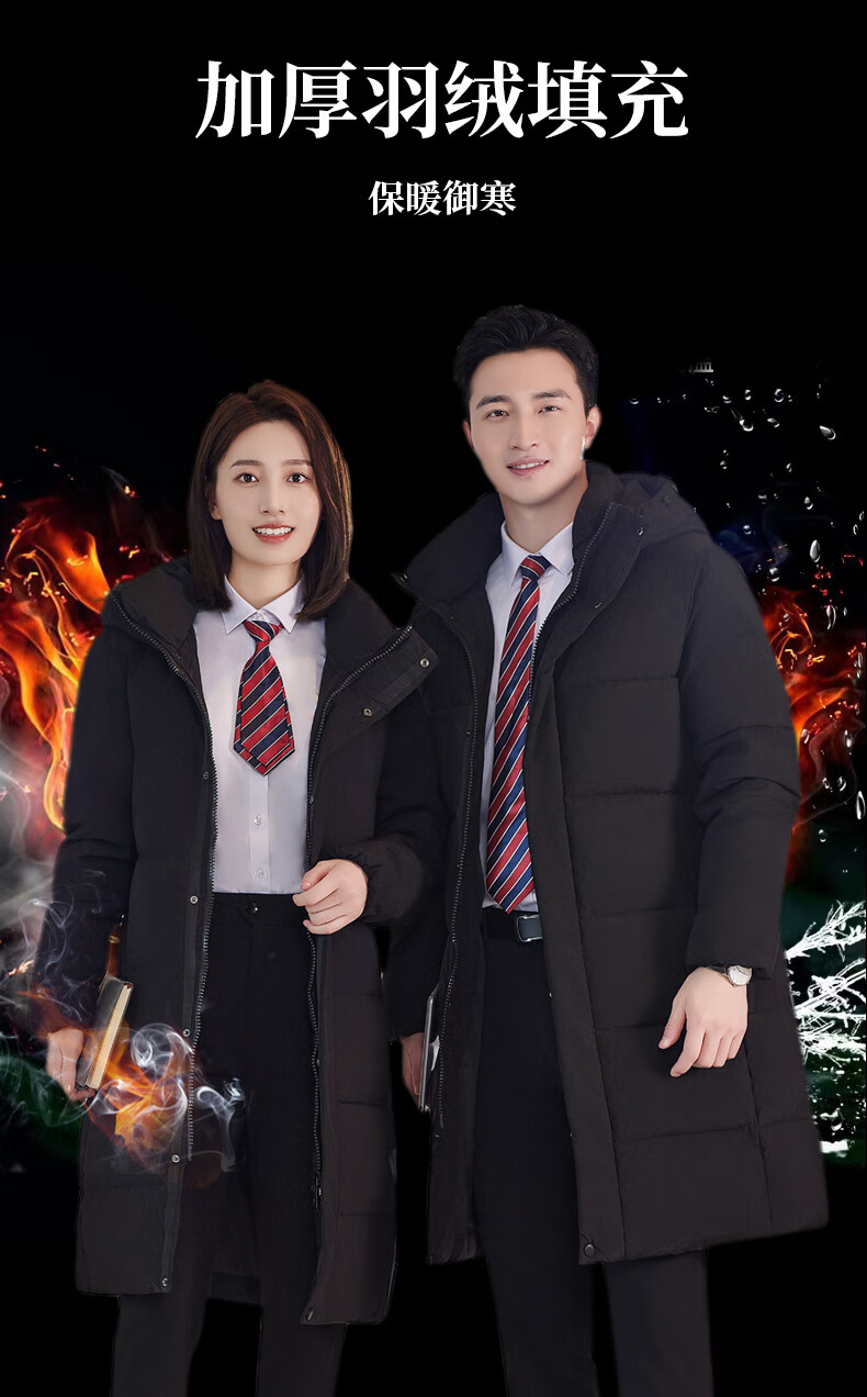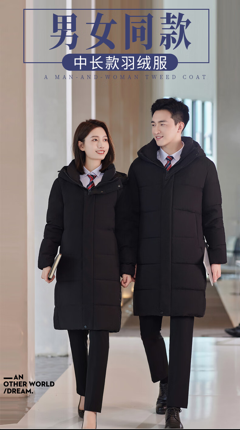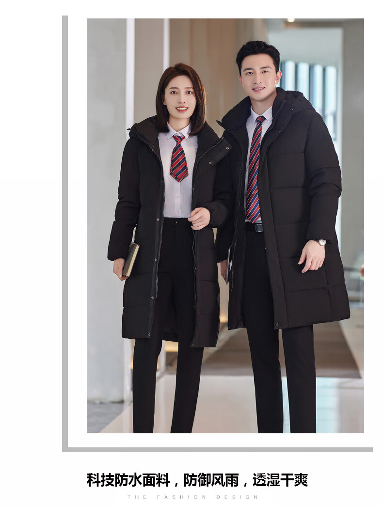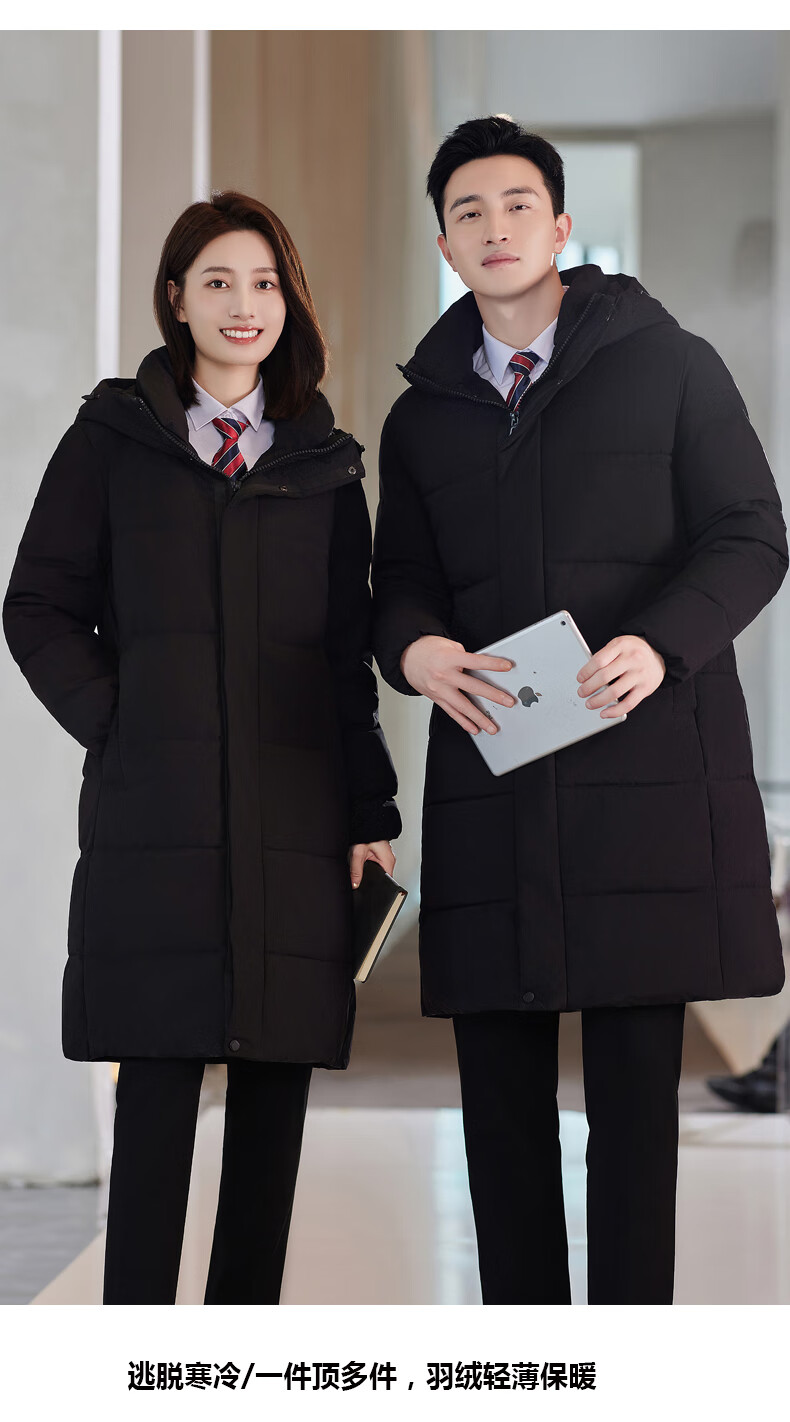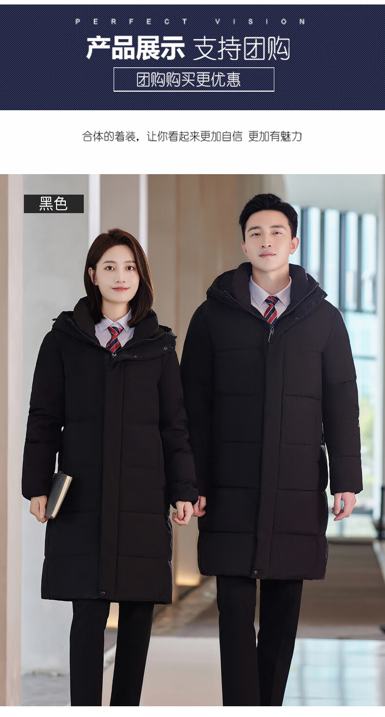 啄木鸟藏青色职业装羽绒服男女冬中长款银行酒店4S店经理工作服logo 黑色白鸭.绒羽绒服【女通码】 可拆卸帽子 S 【建议90-斤】