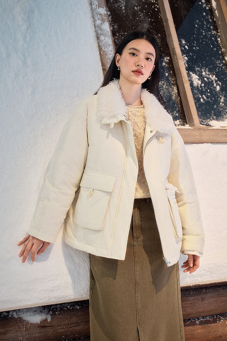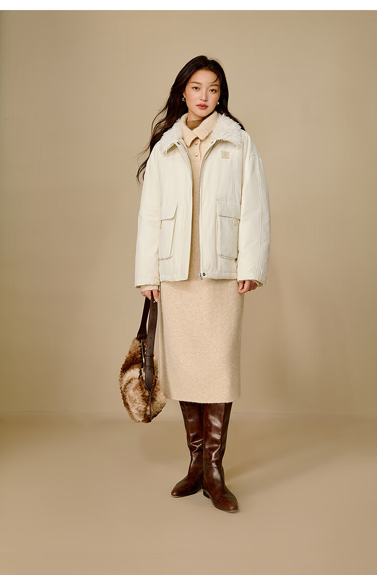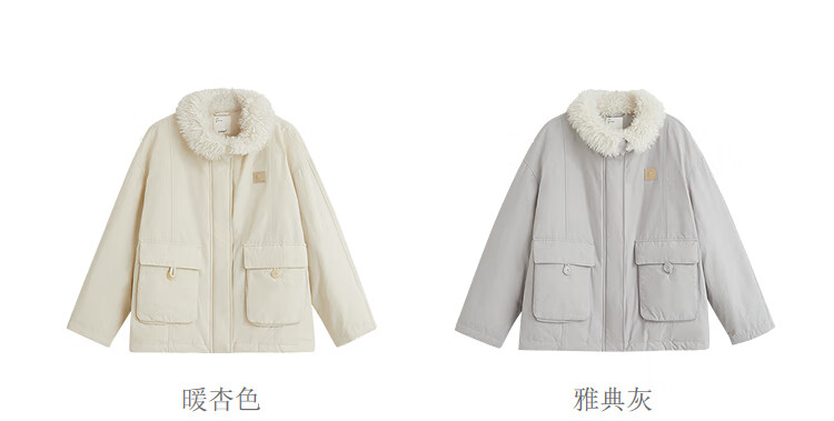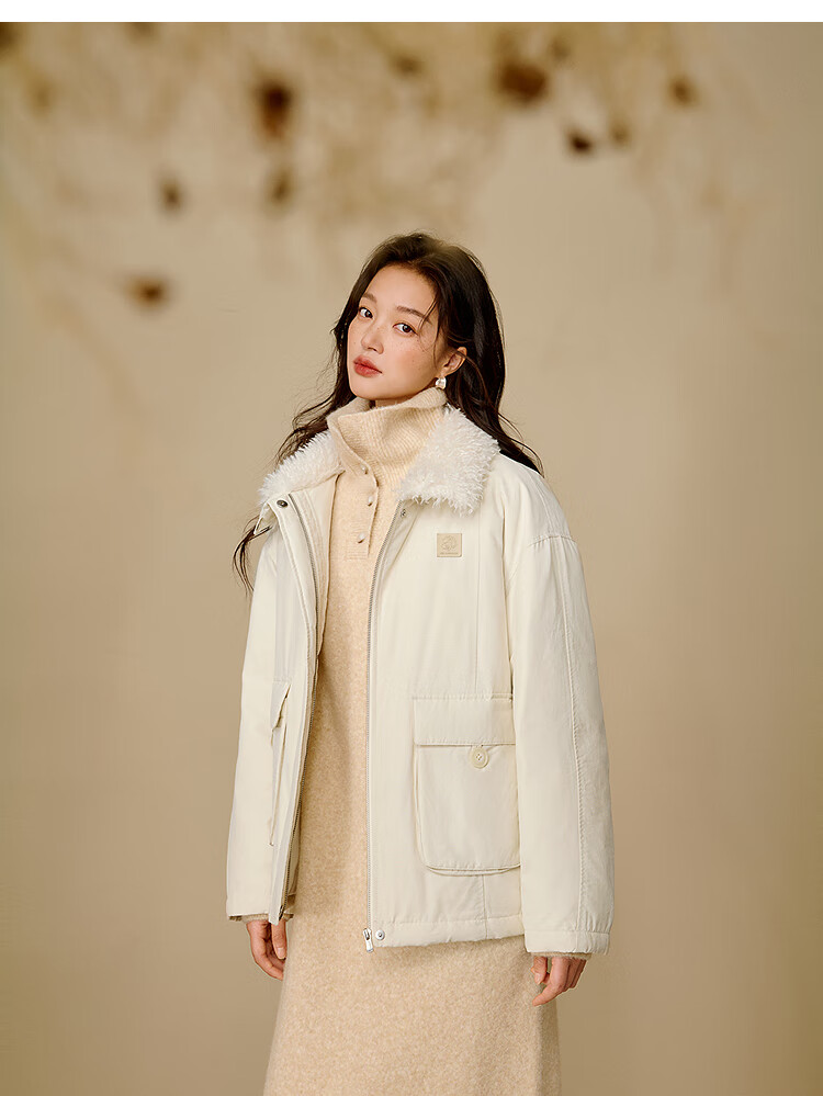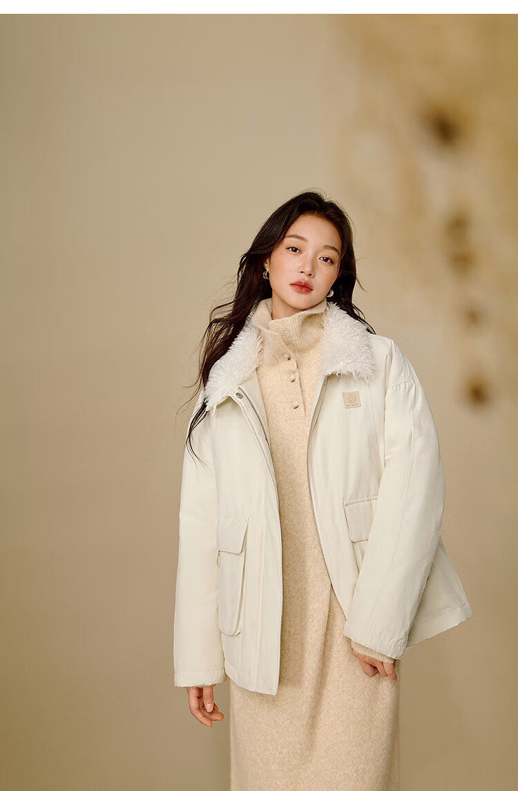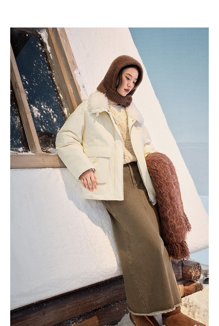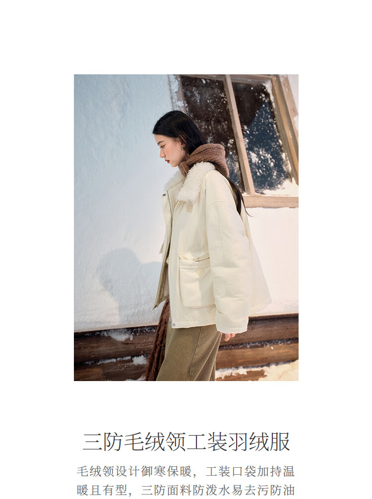 茵曼三防毛绒领工装羽绒服2025冬女装新款高充绒鸭绒外套 暖杏色 S