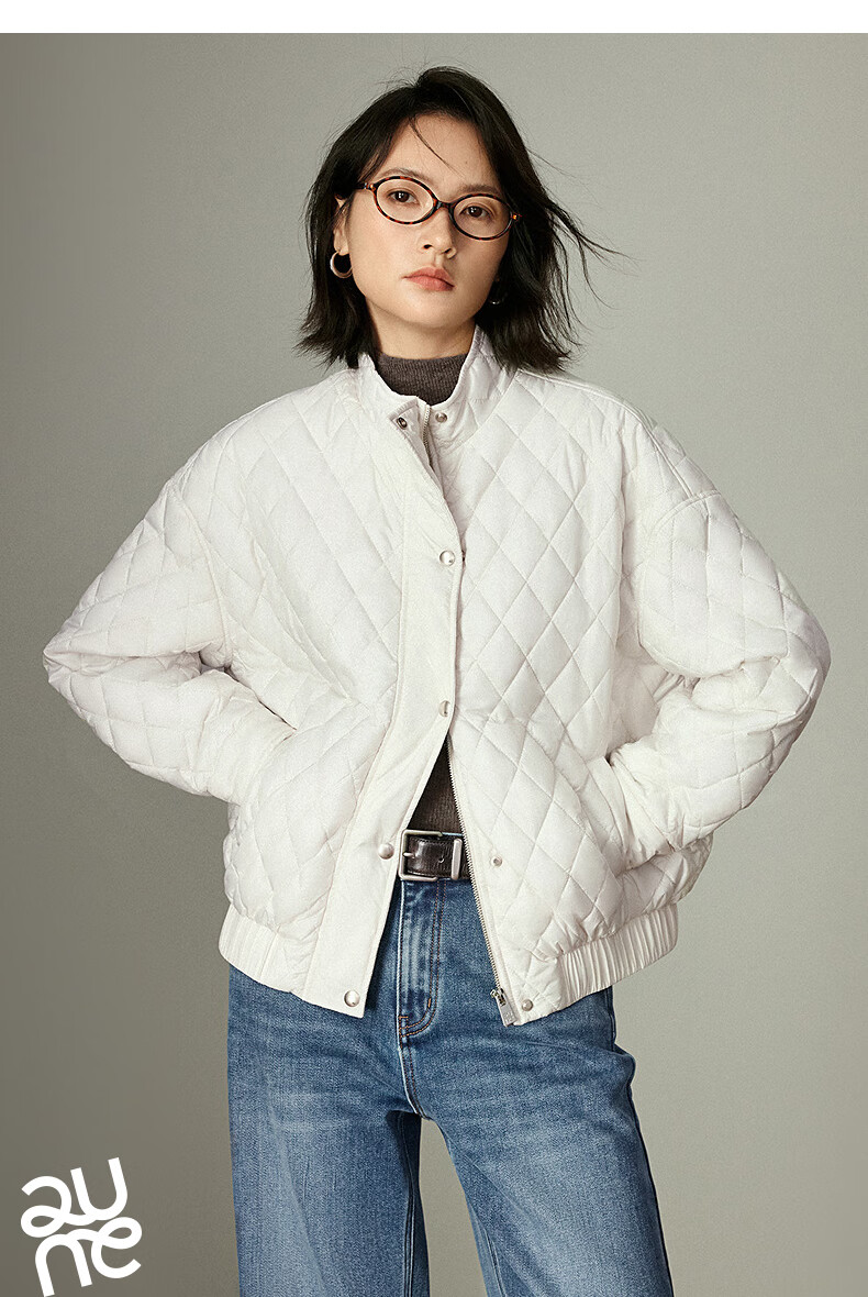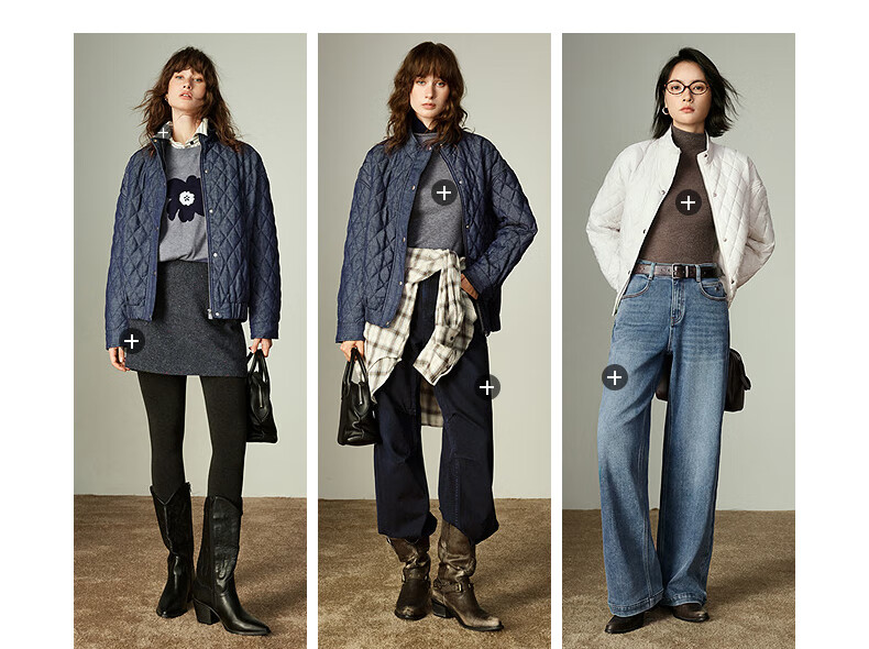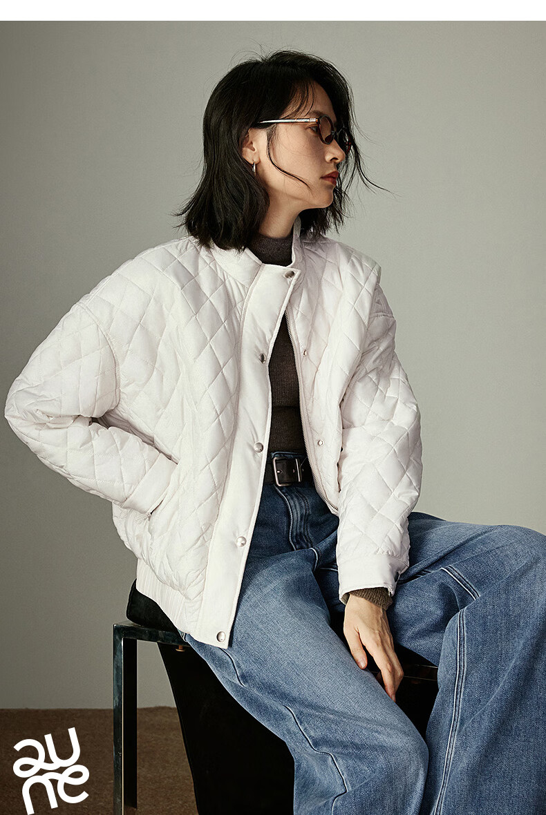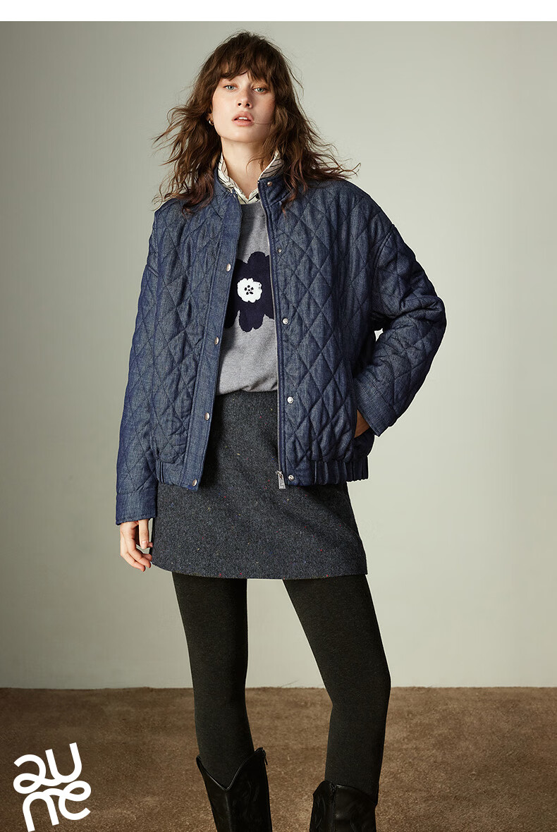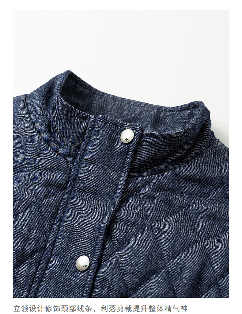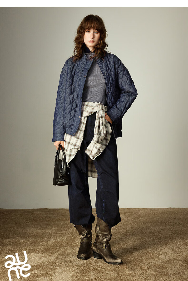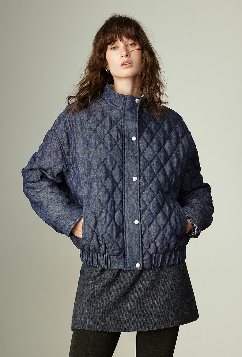 初语棉衣女2025冬季新款仿牛仔不易褪色柔软保暖复古菱格立领夹克 米杏色 M