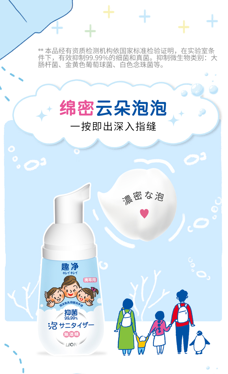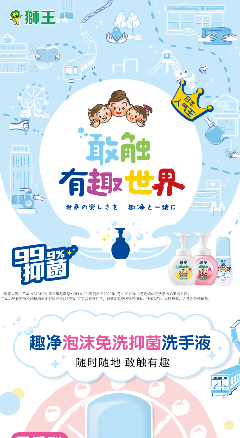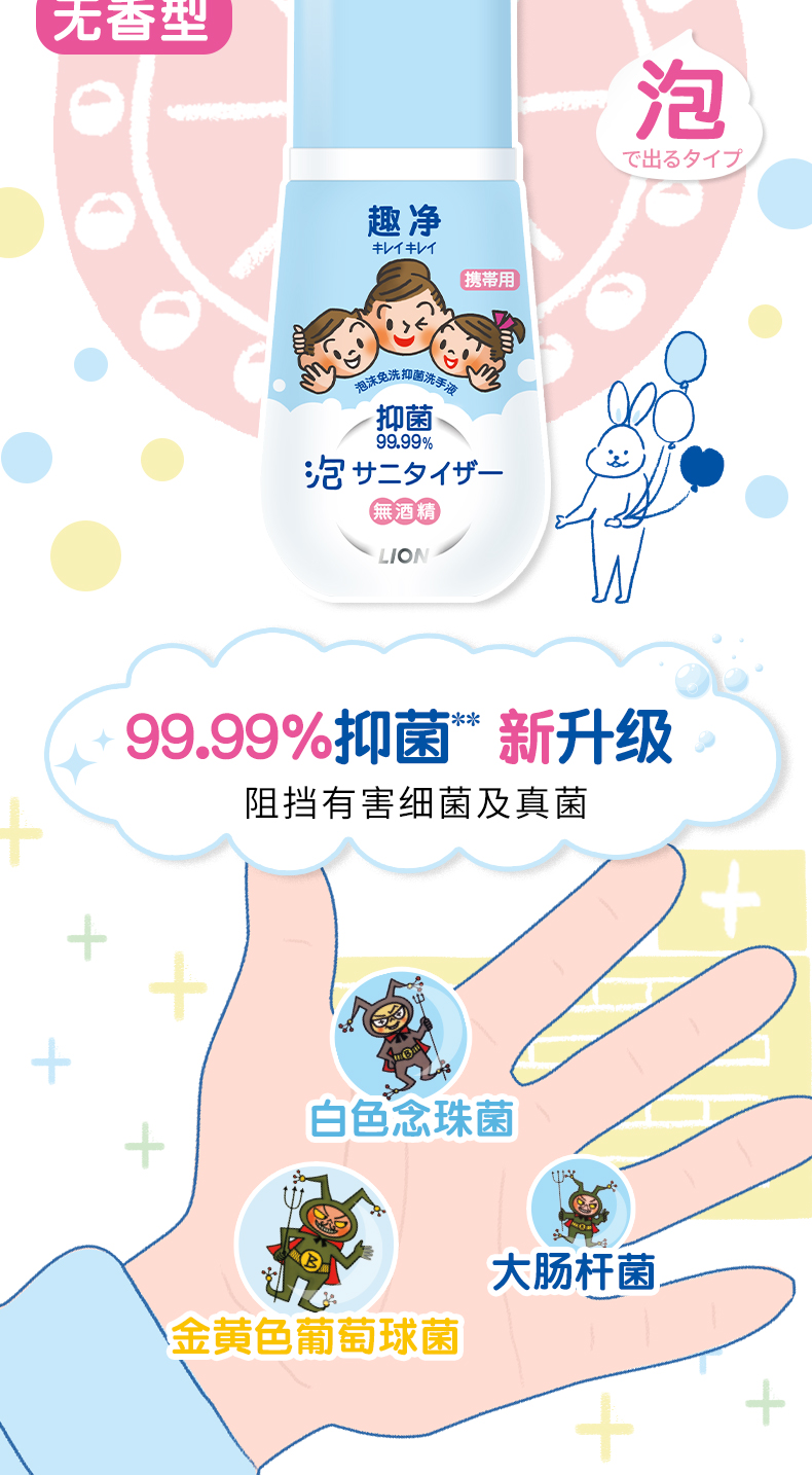 狮王(Lion)趣净泡沫免洗抑菌洗手液50ml*3无需水洗方便携带抑菌呵护儿童