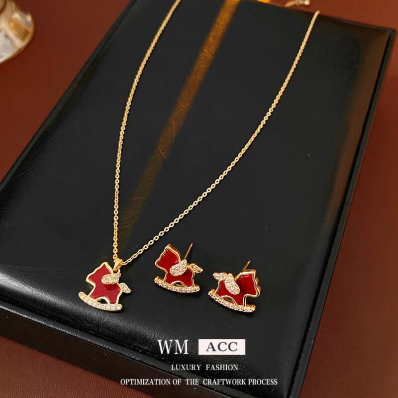 花饰庄园轻奢复古摇摇马吊坠项链设计感高级感简约精致时尚简约摇摇马项链 项链-金色-红色(真金电镀)
