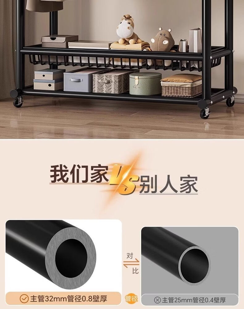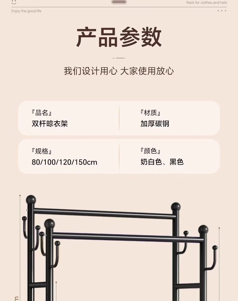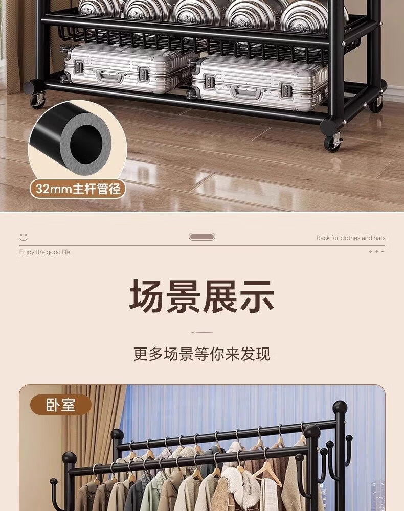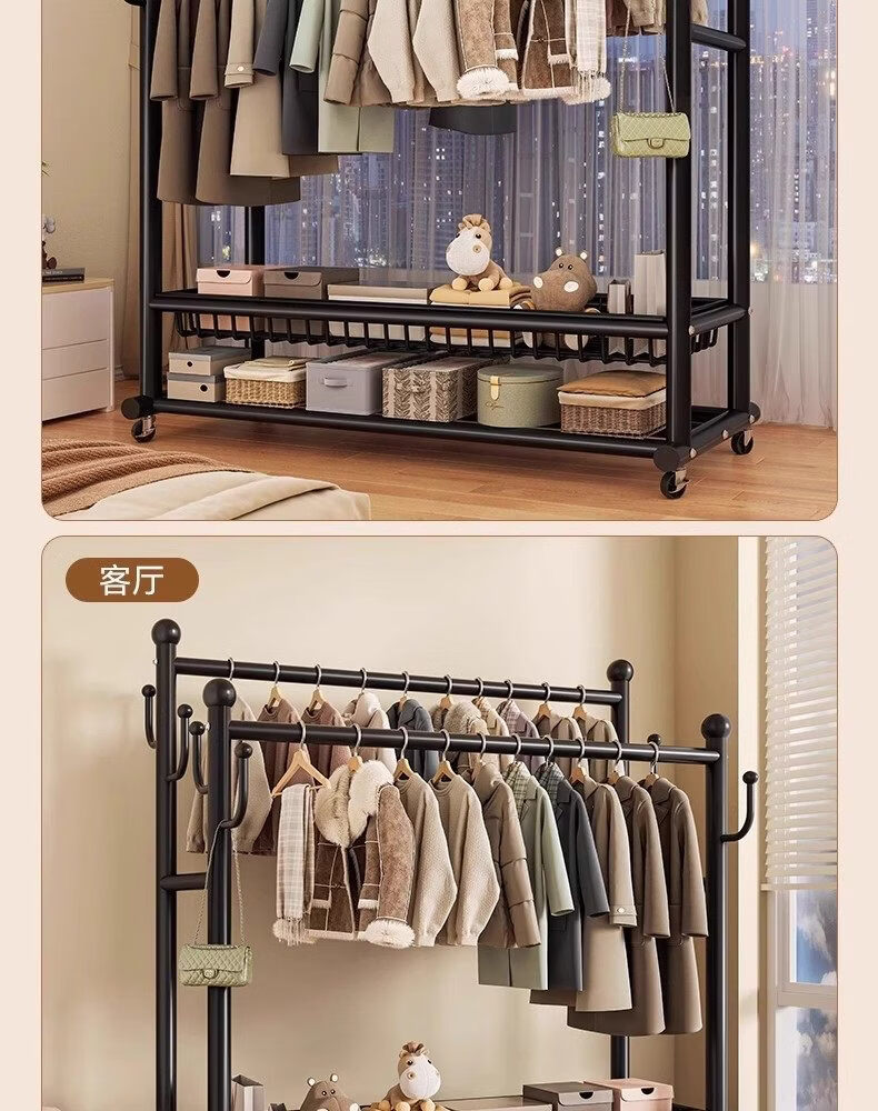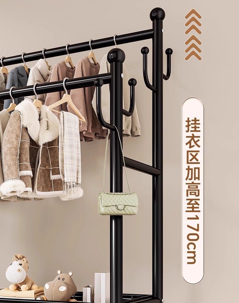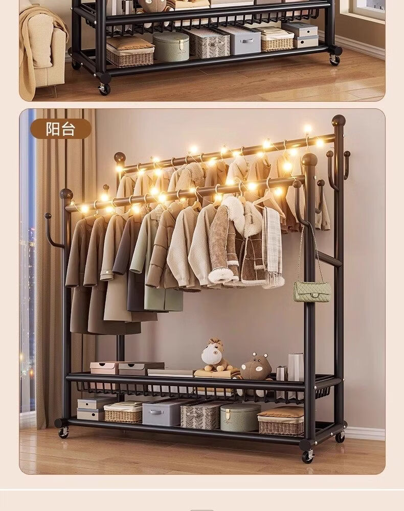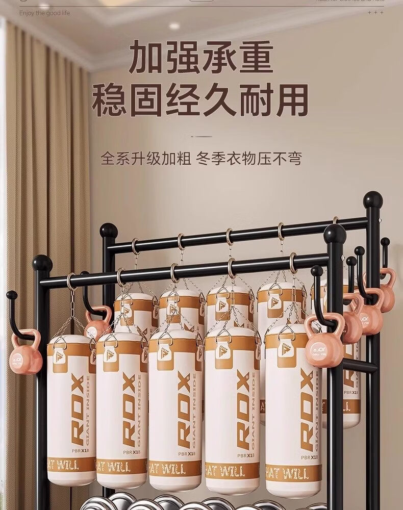 秋冬季特厚晾衣架巨粗32管落地立式衣帽架阳台晒衣架卧室挂衣架 【特粗22管】150cm珠玉白-双杆8钩网篮+鞋架*赠万向轮