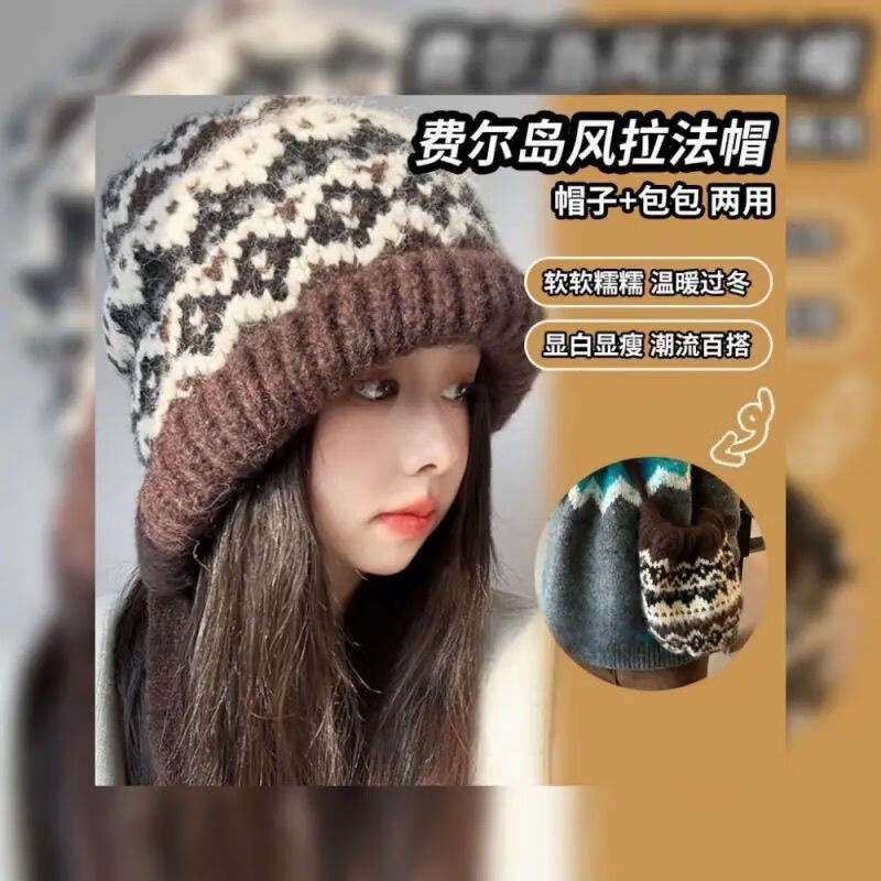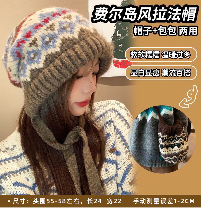 费尔岛帽子毛线帽保暖针织绑带彩虹帽女款2025秋冬季护耳套头帽 包包帽花色*卡其